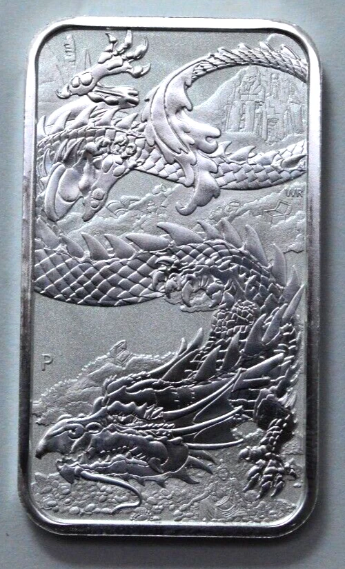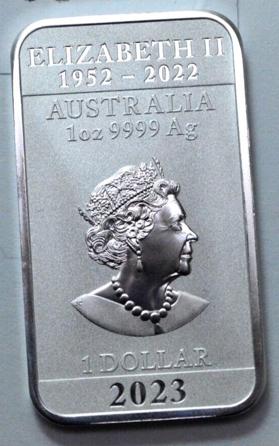 2023-P CHINESE DRAGON 1 oz 9999 Silver Rectangular Australia Coin Bar Perth Mint, Rare and Limited Edition bar, No Reserve price! This very unique 1 oz silver bullion rectangular coin features a Chinese Dragon. In Chinese culture, the dragon is revered as a divine mythical creature, a symbol of power, strength, wealth, and good fortune. Dragons are also believed to be the rulers of water and weather. Each coin is struck by The Perth Mint from 1oz of 99.99% pure silver and issued as legal tender under the Australian Currency Act 1965. The coin’s reverse depicts stylized Chinese dragons and The Perth Mint’s ‘P’ mintmark. 2023 1 oz Silver Bullion Rectangular Coin Details 99.99% pure silver Australian legal tender Silver Content - 1 Troy oz Denomination - 1 AUD Designer - Lucas Bowers You will receive one (1) 1 oz .999 fine silver bar, new silver bar Pictured Item above is the one you will receive. Please Determine condition of the item by pictures provided. Happy Bidding!