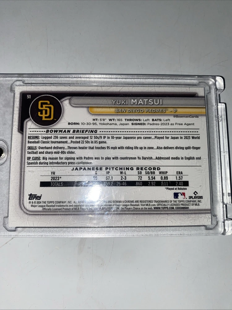 This is a 2024 Bowman Chrome sports trading card featuring Yuki Matsui of the San Diego Padres. It is a rookie card from the base set, with card number 51. The card is in near mint or better condition and is part of the Major League Baseball (MLB) collection manufactured by Topps for the 2024 season.