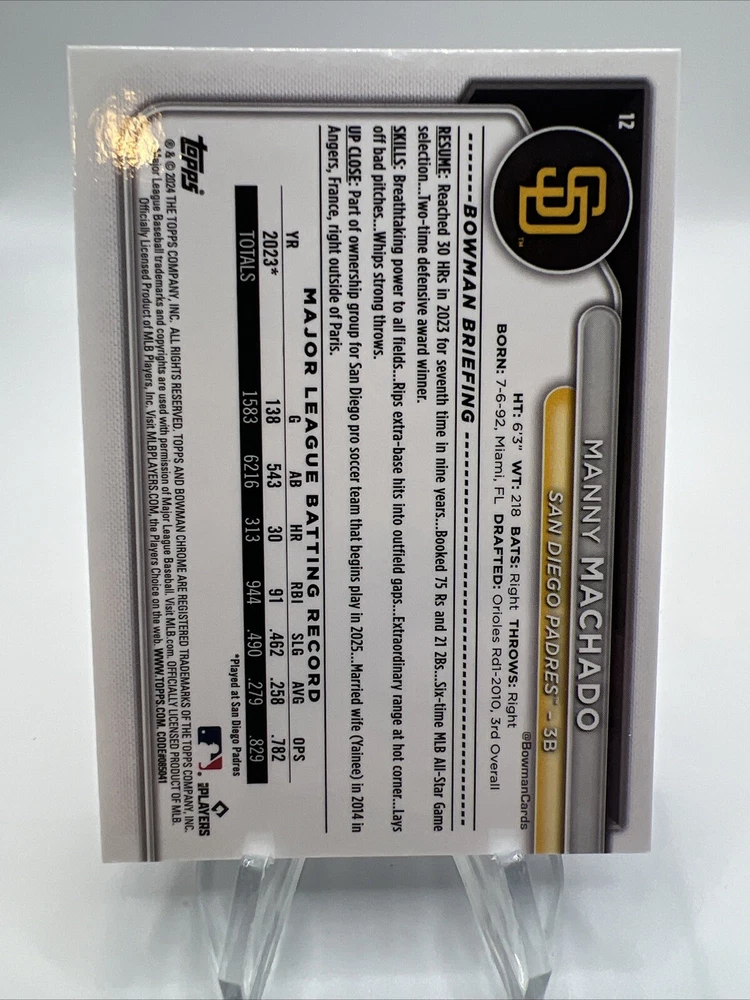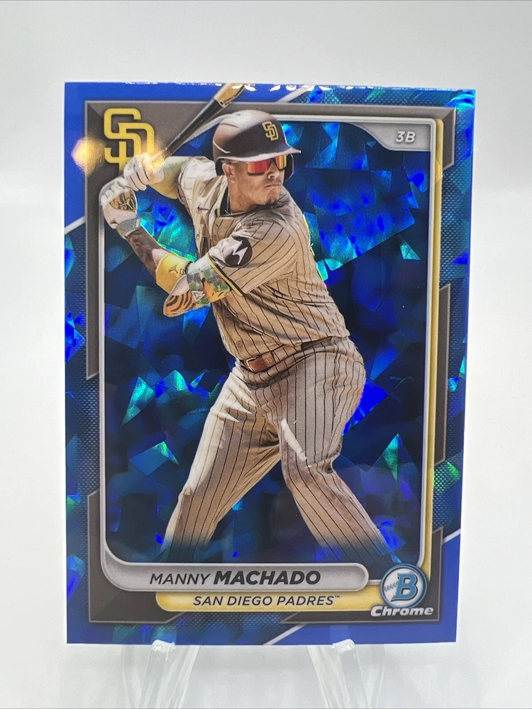 Step up your collection with the 2024 Bowman Chrome Sapphire Edition featuring Manny Machado of the San Diego Padres, card number 12. This premium sports trading card captures the essence of the Major League Baseball experience, highlighting one of the sport's most talented players. The Bowman Sapphire Edition is known for its high-quality finish and vivid imagery, making it a standout addition to any baseball card collection. Whether you're a fan of the sport, a follower of Machado's career, or a collector seeking to add value and aesthetics to your assortment, this card is a must-have.