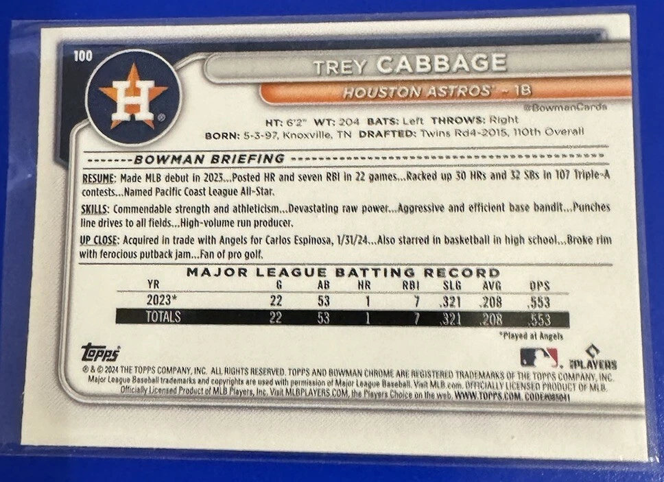 This 2024 Bowman Chrome TREY CABBAGE Base Rookie RC #100 Houston Astros Baseball card is a must-have for any avid baseball card collector. The card is made of high-quality card stock with a thickness of 35 Pt. and features a stunning chrome design. It is an original Topps manufacture with a limited edition and exclusive collectors edition. The card is part of the 2023 Bowman Chrome set and is a parallel/variety with a hologram and framed design. It is a first edition and insert with a short print and is a base set card. The card is perfect for fans of the Houston Astros and Major League (MLB) baseball.