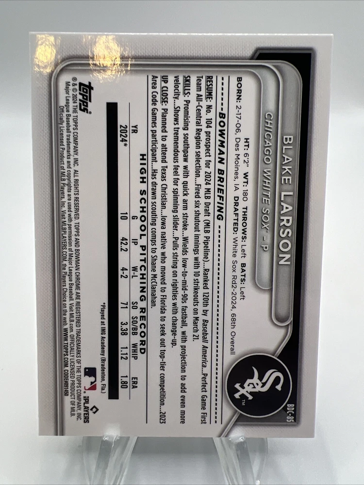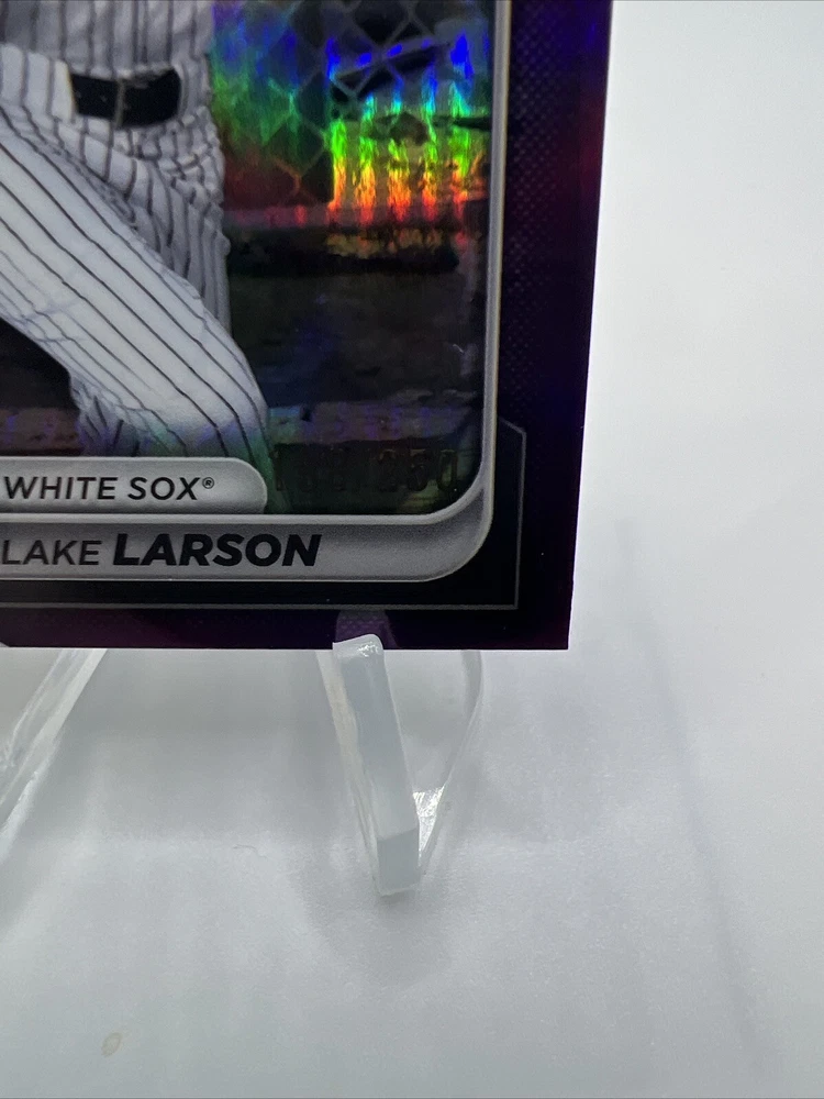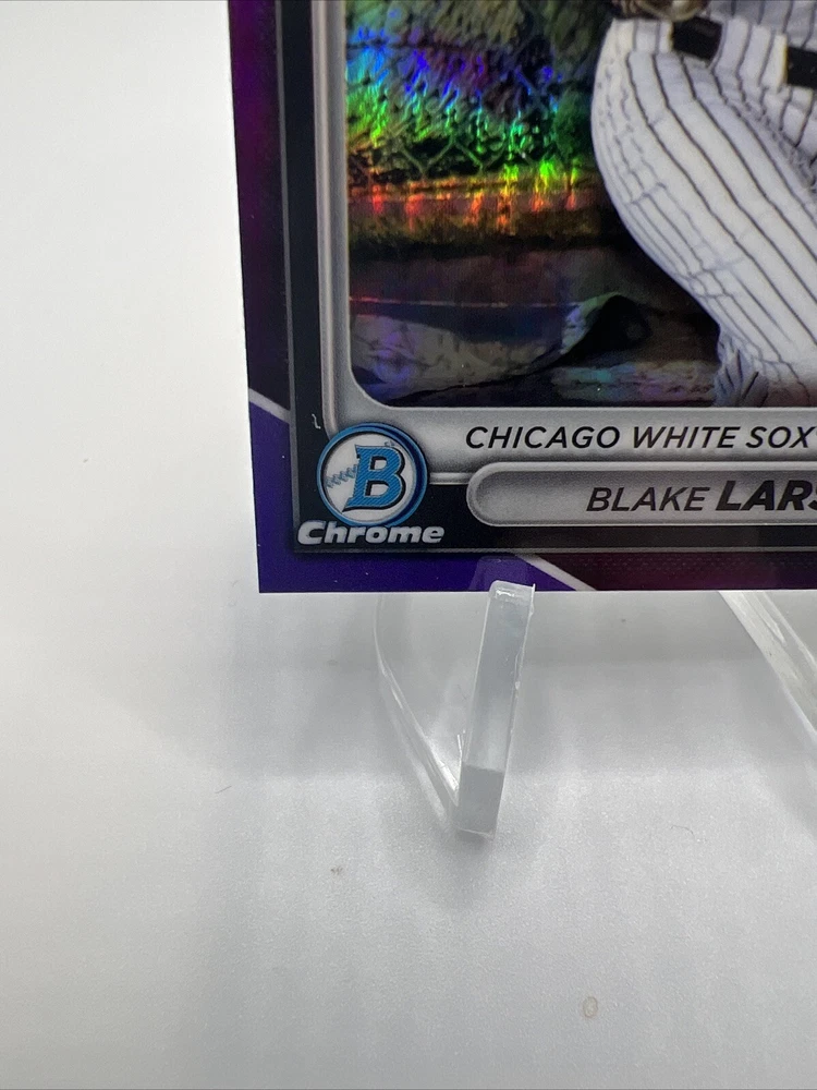 Elevate your collection with the 2024 Bowman Draft Blake Larson Purple Refractor card, a must-have for baseball aficionados and collectors alike. Featuring the promising talent of Blake Larson, this card is serial numbered and part of a limited Purple Refractor variety, adding a rare and exclusive touch to your sports memorabilia. Affiliated with the Chicago White Sox, card number BDC-85 captures the athlete in mid ascent, reflecting his potential in Major League Baseball. This card, from the reputable Bowman manufacturer, is an essential piece for fans of the sport or collectors seeking to commemorate the 2024 season with a piece of baseball history.