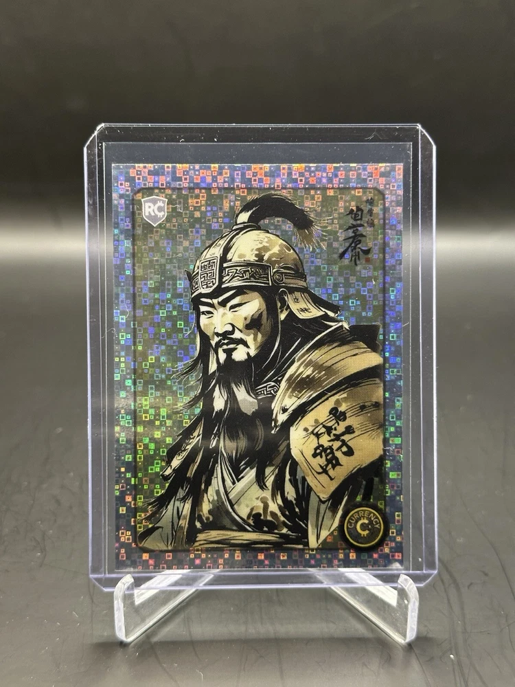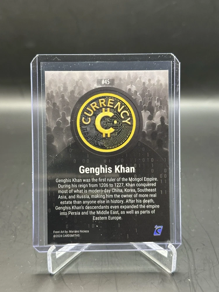 This rare and highly sought-after 2024 Cardsmiths Currency Series 3 #45 Genghis Khan RC Matrix Holo HOT trading card is a must-have for any serious collector. Featuring a stunning hologram, parallel/variety, and exclusive design, this card is made of high-quality 20 Pt. card stock and is an original print from the Cardsmiths Currency franchise. With its Bitcoin, Ethereum, Ripple, Cryptocurrency, and Dogecoin features, this card is perfect for fans of Genghis Khan and cryptocurrency enthusiasts alike. The card is in standard size and is printed in English language. Don't miss your chance to add this SP-rare card to your collection today! Card is in MINT condition and is ready for grading.