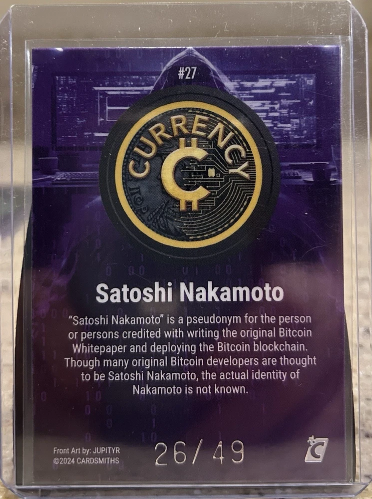 2024 Cardsmiths Currency Series 3 - SATOSHI NAKAMOTO #27 - Amethyst Gem 26/49 All cards are handled with care and generally contain cardsmiths quality control issues. Please feel free to reach out with any questions.