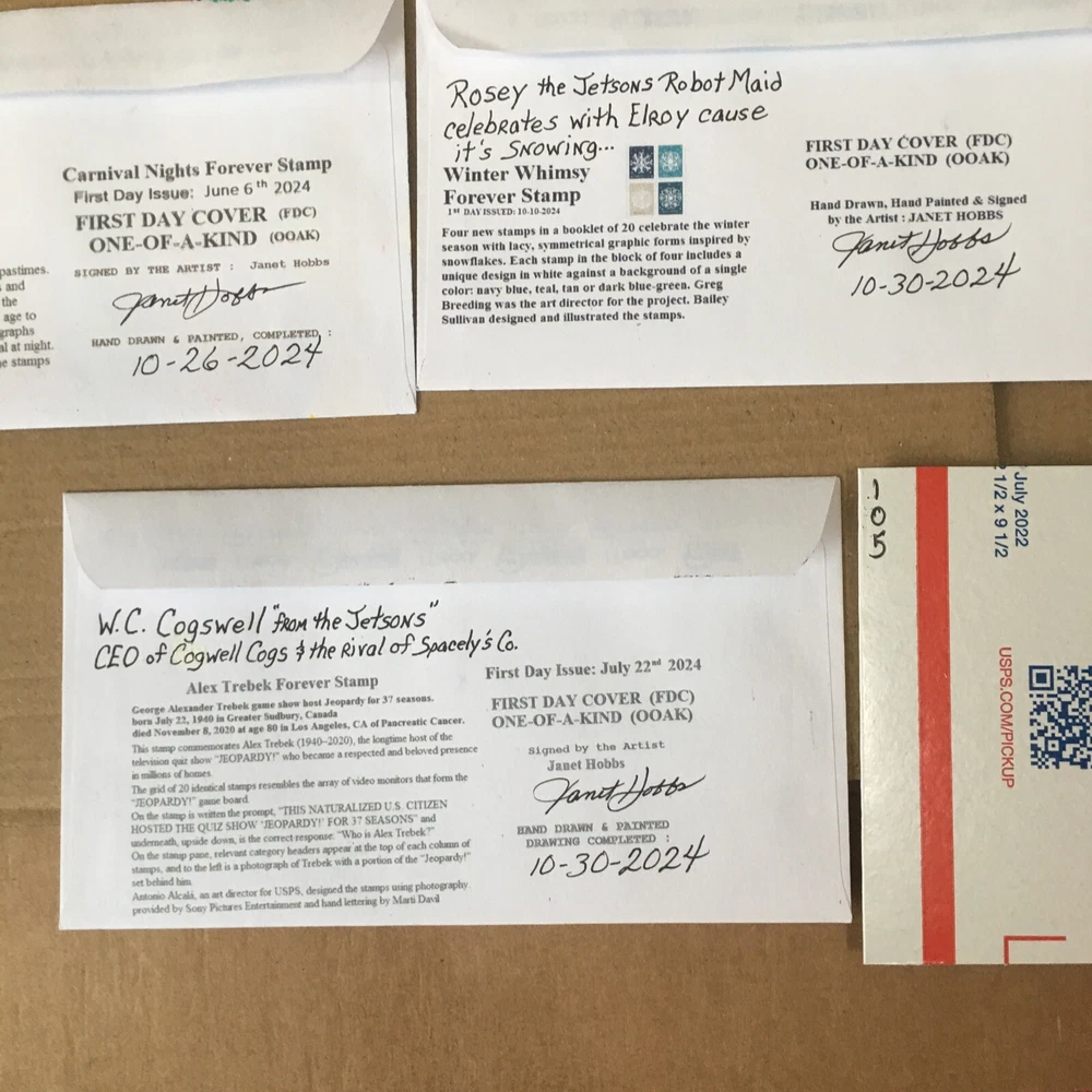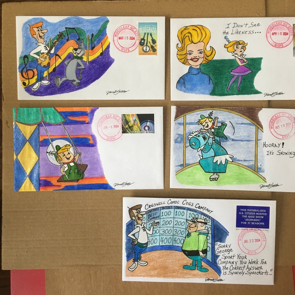Set of Seven Cachets 2024 Forever Stamps All are Canceled on First Day Issed One of a Kind/ First Day Cover UO Cancel. You are bidding on the set of seven drawings of the Jetson Characters. Hand Drawn and Hand Painted By the Artist: Janet Hobbs Painted with Ink, Pencils, Pastels and Markers. Signed Front and Back by Artist. Janet Hobbs. Shipped USPS FIRST CLASS. Shipped within USA only . Thank You for viewing and Watch my Auctions for more Janet Hobbs Cachet, Used Stamps and Postal Deck Cards. Follow me Ms.GoodCentsCoins on eBay or Janet Hobbs Cachet.