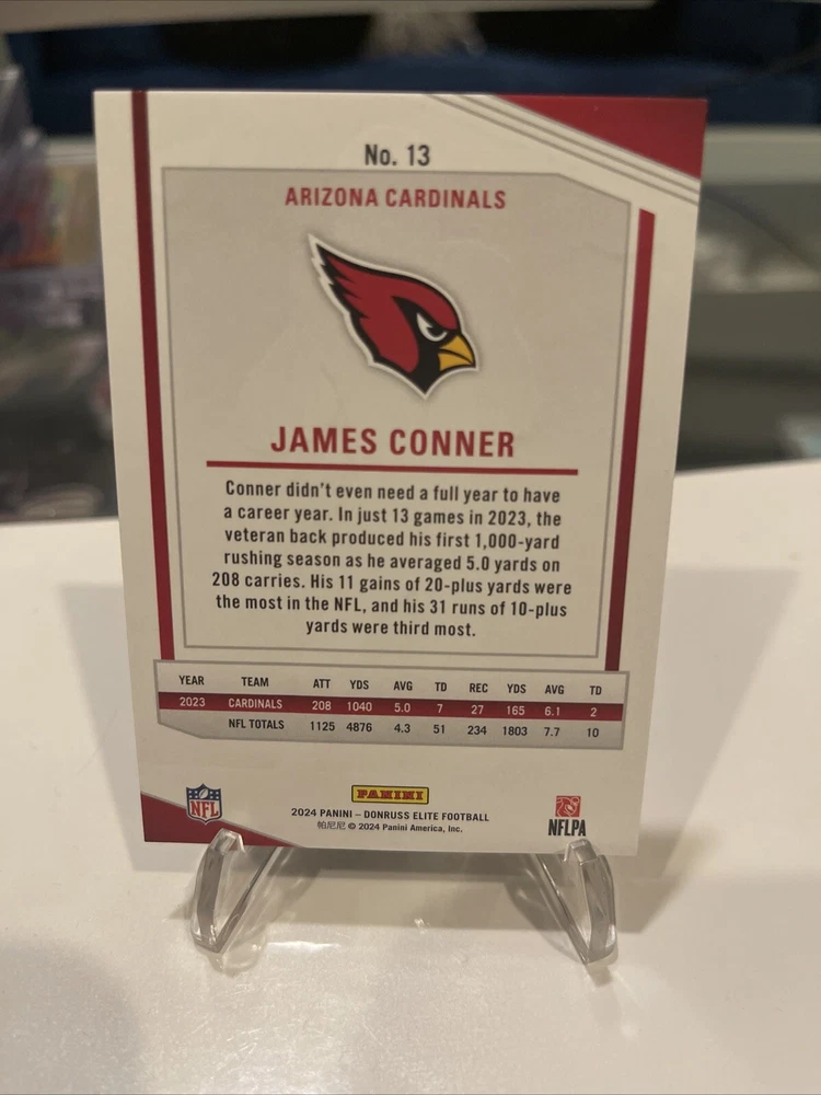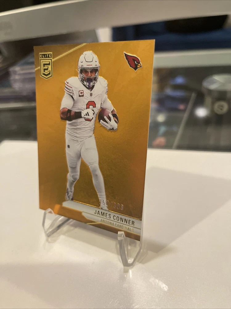 This 2024 Panini Donruss Elite Football card features James Conner of the Arizona Cardinals. The card is a parallel variety, specifically an orange parallel with a print run of 399. It is also serial numbered and comes from the 2023 season. The card is perfect for collectors of sports trading cards, especially those who focus on football and the National Football League (NFL). Manufactured by Donruss, this card is part of the 2024 Panini Donruss Elite Football set. With its unique features and high-quality design, this card is a must-have for any serious collector.