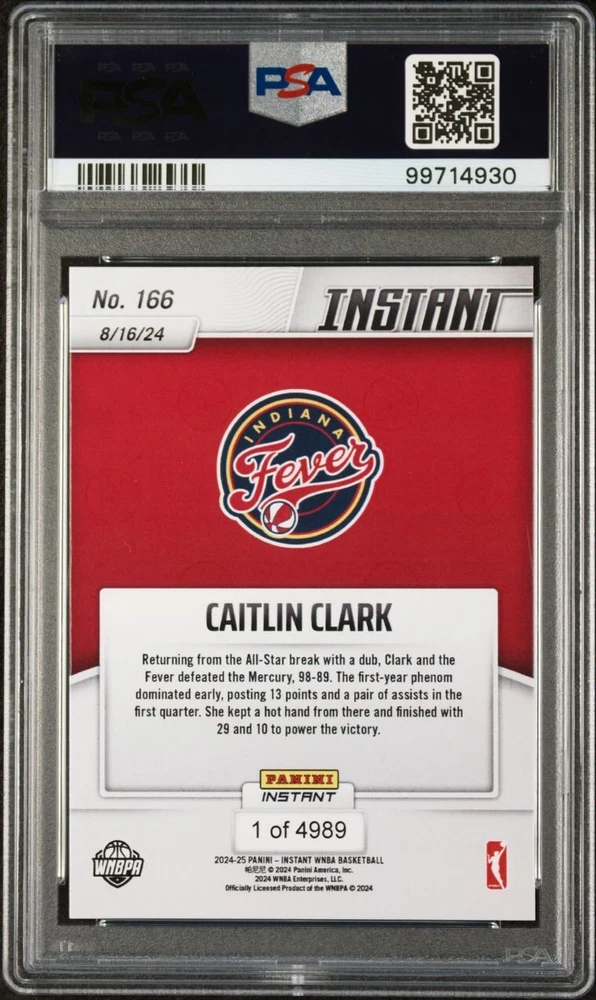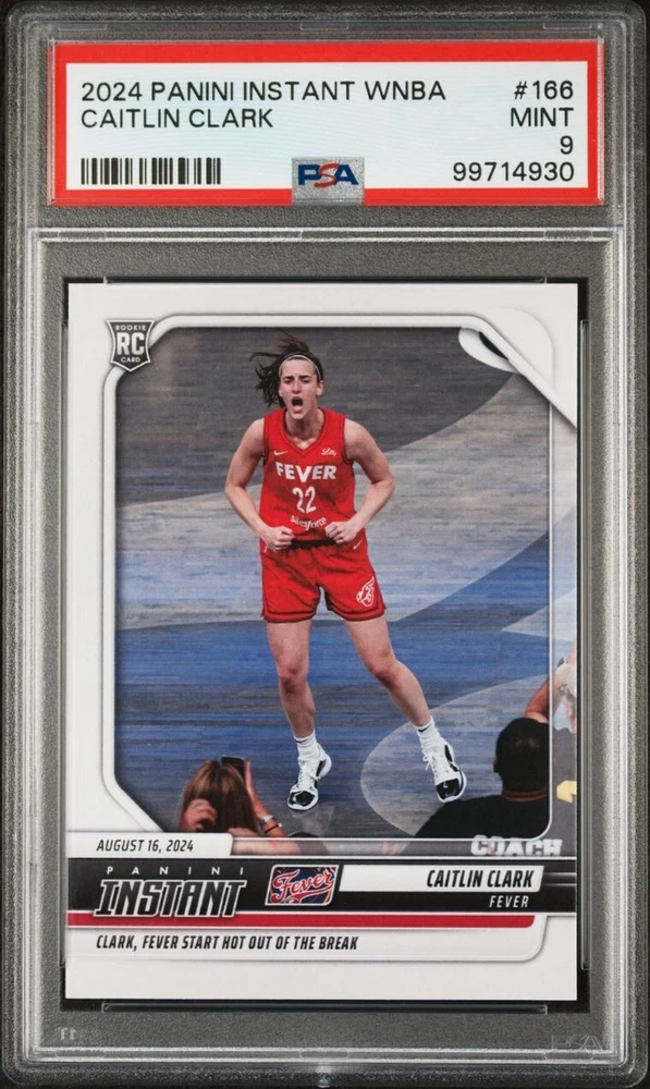 This is a 2024 Panini Instant sports trading card featuring Caitlin Clark, a rookie player for the Indiana Fever and Iowa Hawkeyes. The card is part of the Women's National Basketball Association (WNBA) league and has a card number of 166. It comes from the 2024 set and is manufactured by Panini. The card name is "CLARK, FEVER START HOT OUT OF THE BREAM" and it is a great addition to any basketball fan's collection. The card is not autographed and is in PSA 9 condition.