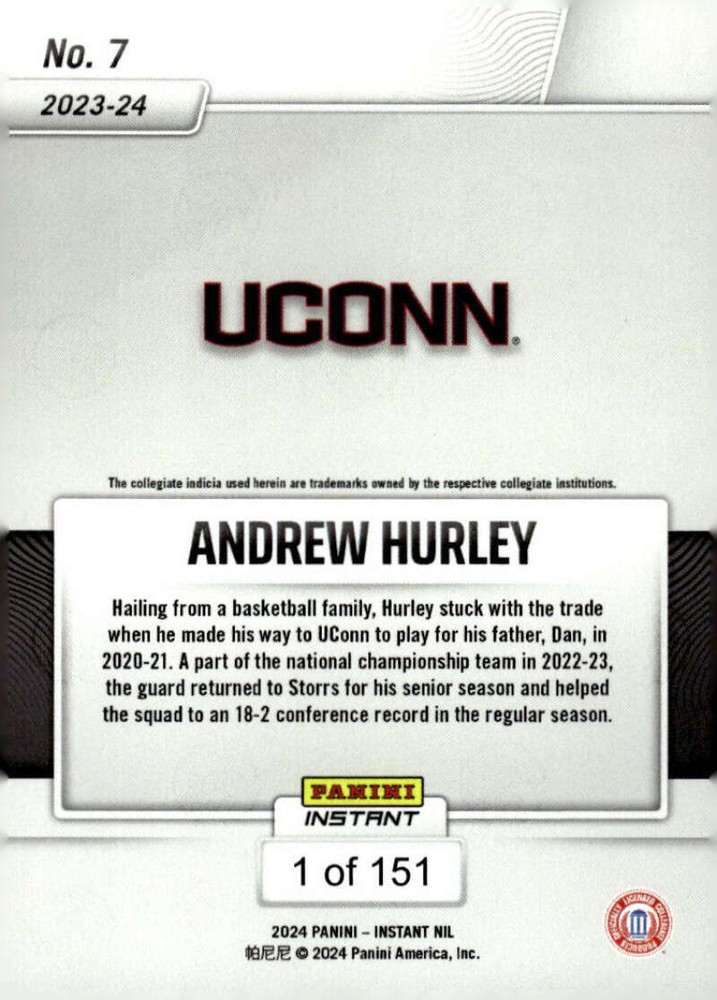 ANDREW HURLEY 2024 ANDREW HURLEY RC 2024 Panini Instant NIL Pre-ROOKIE #7 UCONN PR:151 NM-MT NCAA Basketball UCONN HUSKIES COMBINED SHIPPING AVAILABLE IF NOT ALREADY PAID FOR. PLEASE REQUEST IF NOT AUTOMATICALLY CALCULATED IN YOUR CART. All imperfection lines are from the scanner unless otherwise noted in the title and description. Request photos if concerned. Shipped to U.S. locations via USPS First Class Stamped Mail with eBay Tracking and up to $20 Insurance . Other delivery options available. COMBINED SHIPPING AVAILABLE IF NOT ALREADY PAID FOR. PLEASE REQUEST. Partial refunds for shipping and not available after payment is made. International orders are mailed via International Stamped Letter Mail and do not include tracking. If tracking is desired, please select during checkout. International Customers: Note that standard post is taking 2-5 weeks for delivery to many locations worldwide due to current conditions. Please be patient for receipt of order, or request to upgrade to trackable delivery for faster and more secure delivery. To do so, purchase, but DO NOT PAY upfront. Send a message requesting a trackable delivery quote and I will provide an invoice with this option. If prepaid, I cannot refund or modify delivery method. Thank y o u . This listing created with GLETech Multiple Selling Channel tools.