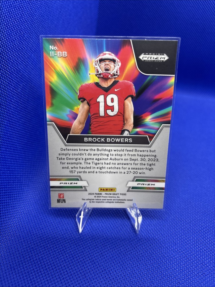 The product is a 2024 Panini Prizm Draft Picks trading card featuring Brock Bowers. It is a Red Ice parallel variety Rookie card with an Instant Impact insert design. The card showcases Bowers in his Georgia Bulldogs college uniform and also mentions his affiliation with the Las Vegas Raiders in the NFL. It does not come with an autograph.