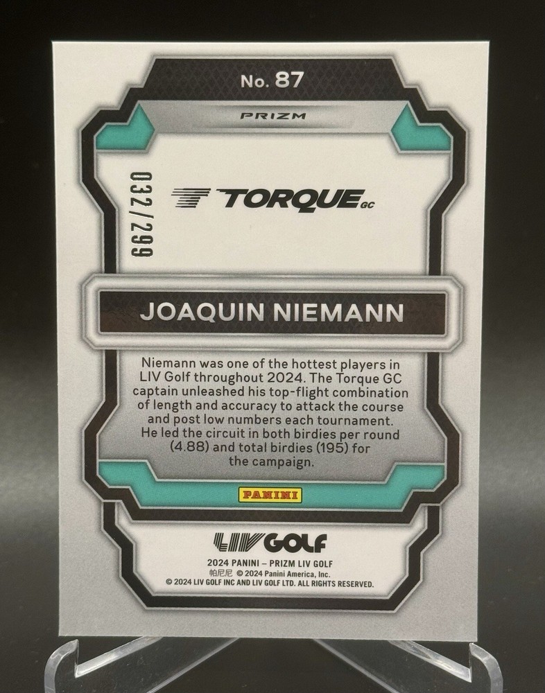 A 2024 Panini Prizm LIV Golf trading card featuring golfer Joaquin Niemann. This card is a Pulsar Prizm parallel variety, with a print run of 299 copies. It is made of card stock and comes from the Professional Golfers' Association (PGA) and LIV Golf leagues. The card is serial numbered and considered a short print 1st edition. It showcases Niemann as a member of the Torque GC team, related to the LIV Golf event/tournament.