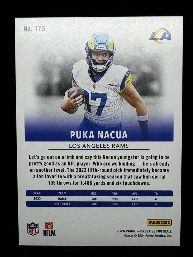 This 2024 Prestige #175 Puka Nacua Blue parallel sports trading card is a must-have for any Los Angeles Chargers fan or collector. With a print run of 599, this card features serial numbering and a color match design, making it a unique addition to any collection. The card is ungraded and comes from the National Football League (NFL) league. This card is a great investment for any collector looking to add to their collection.
