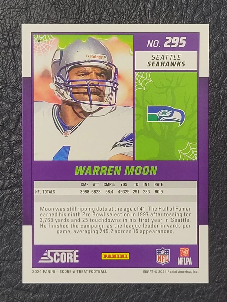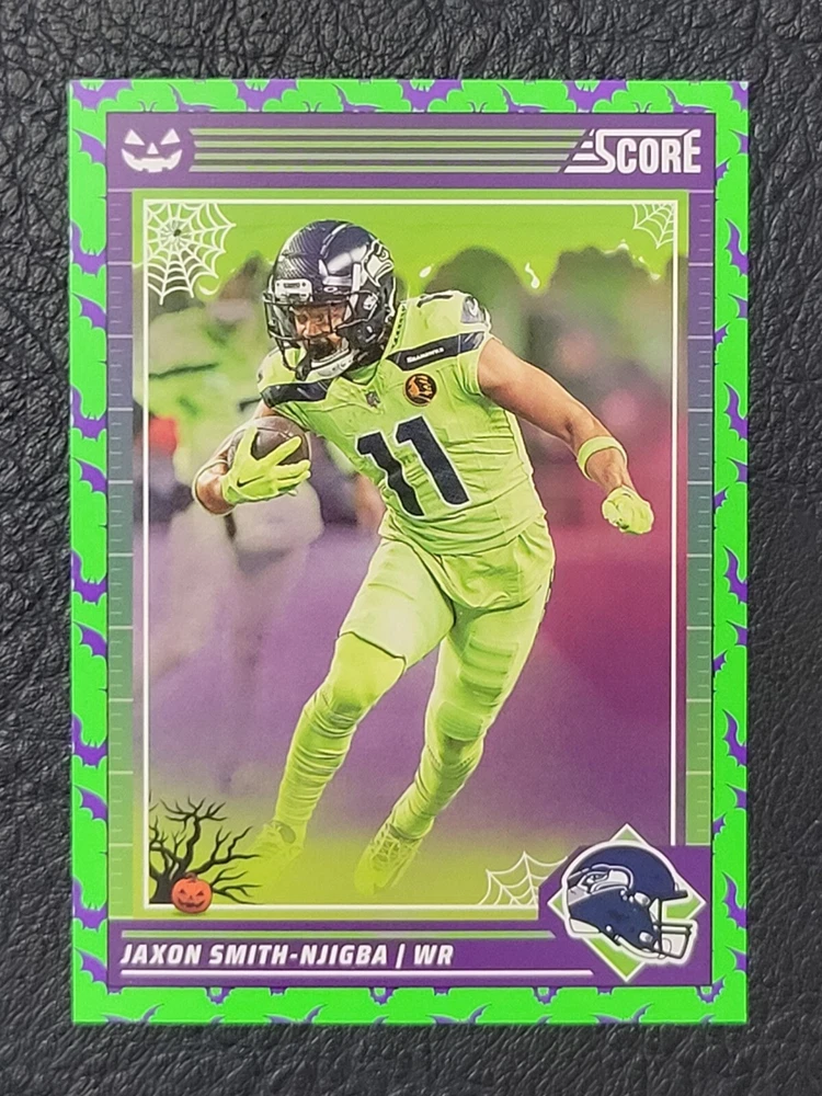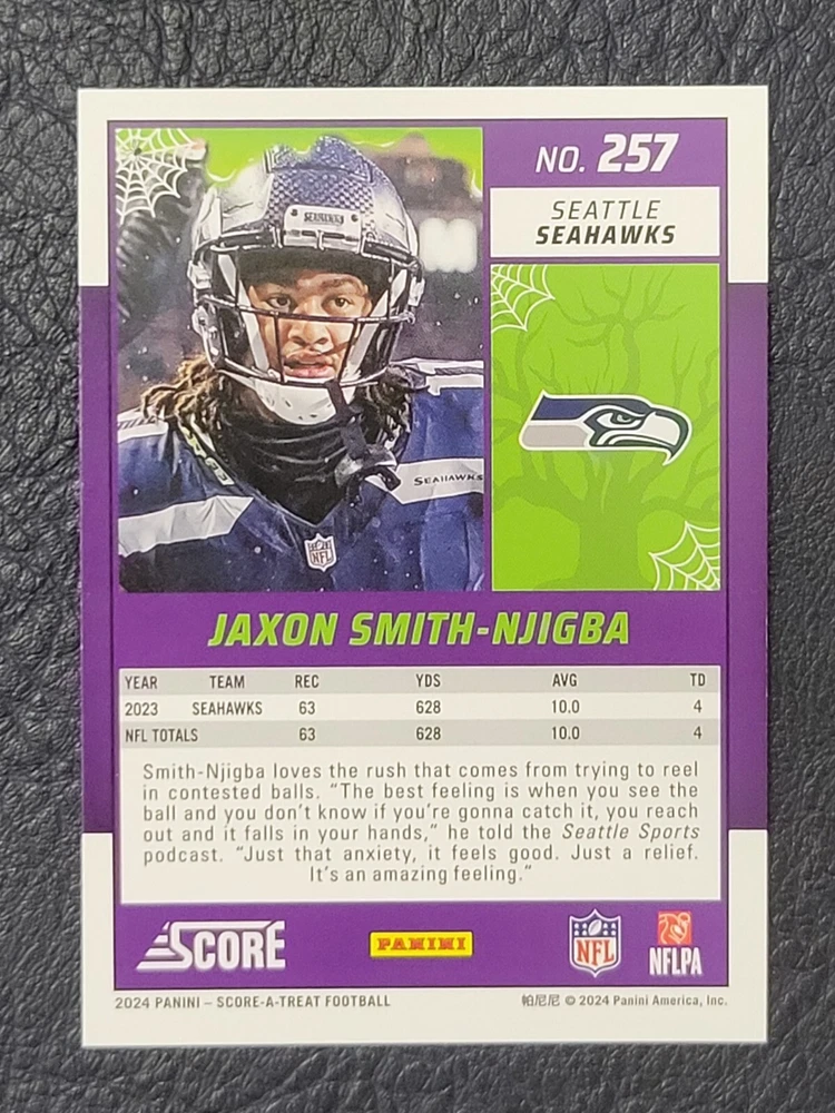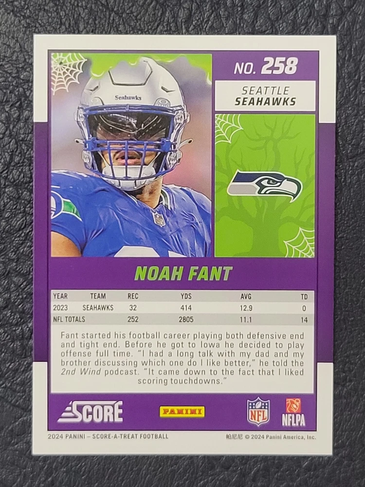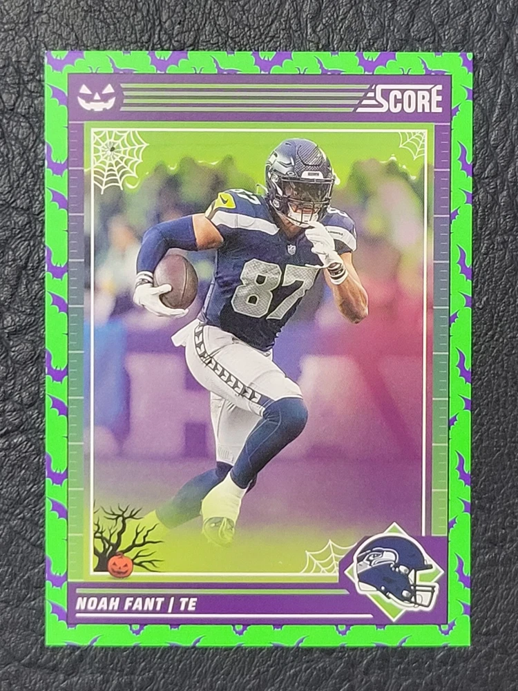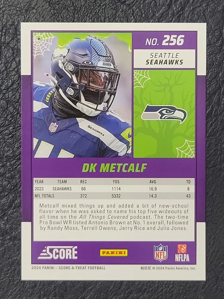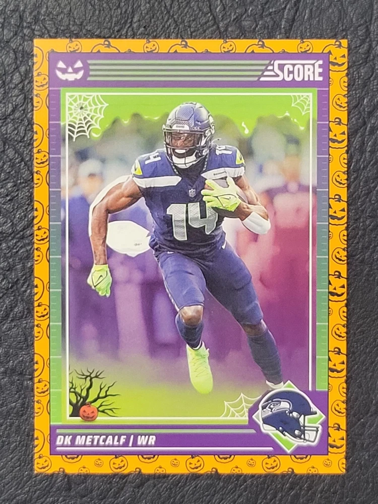 This lot includes five Seattle Seahawks trading cards from the 2024 Score set. The cards feature players DK Metcalf, Smith Njigba, Kenneth Walker III, Noah Fant, and Warren Moon. The set includes both base cards and parallel cards, and is perfect for any fan of the National Football League (NFL). These cards are in standard size and manufactured by Panini in the United States. The set is a great addition to any sports trading card collection and celebrates the team's Super Bowl victory.