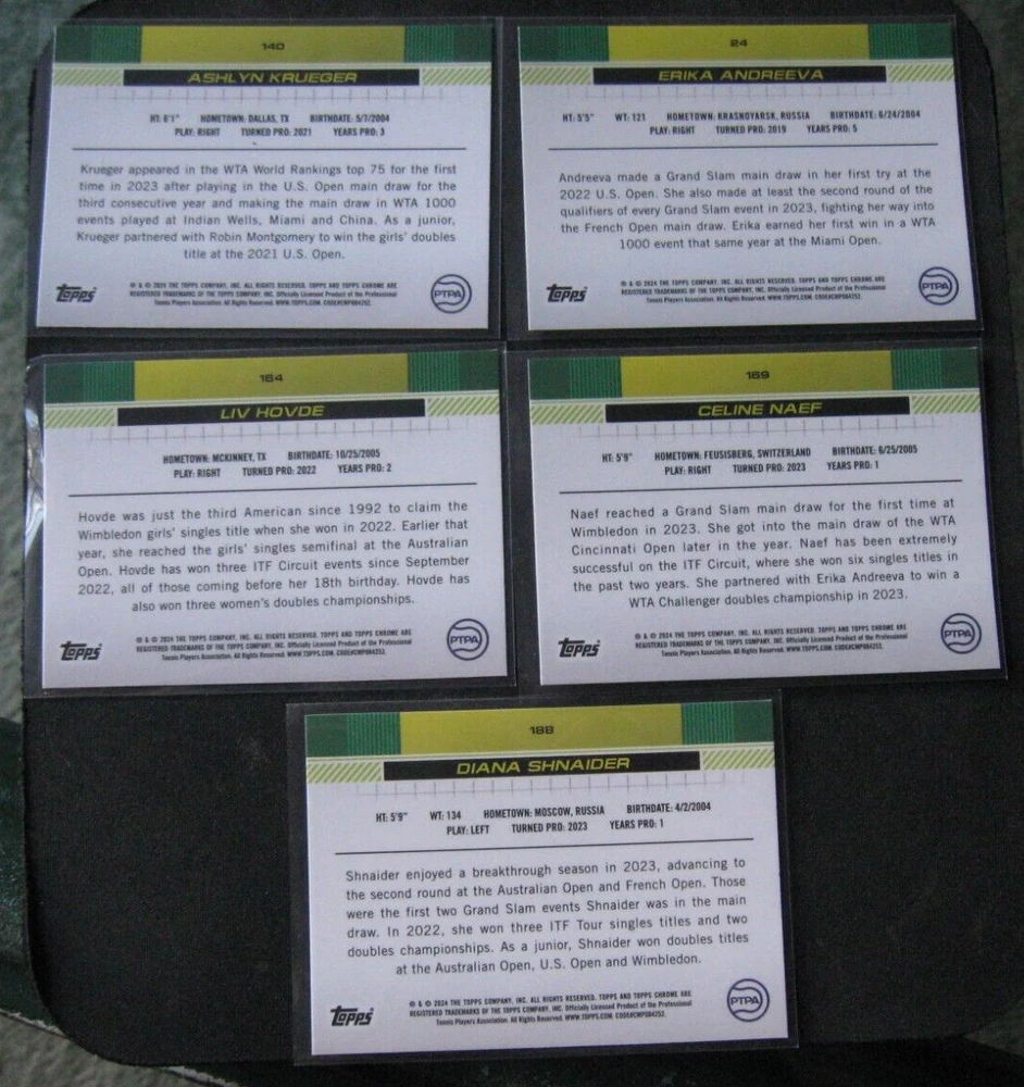 2024 TOPPS CHROME 5-CARD RC WOMENS TENNIS LOT Krueger/Andreeva/Hovde/Naef/Shnaid