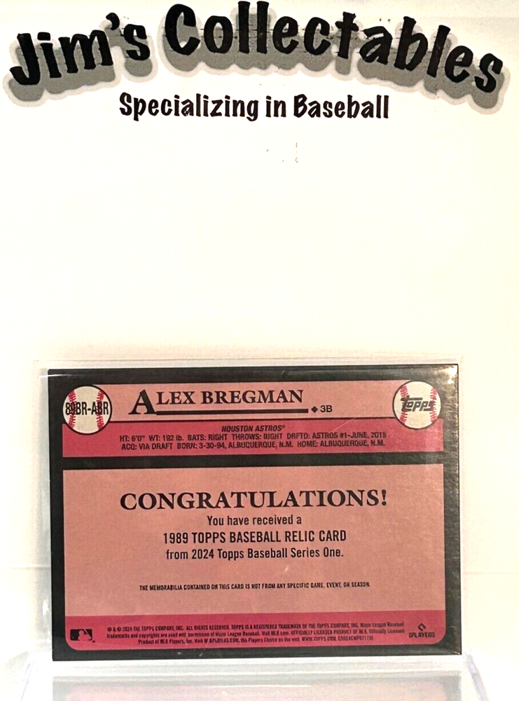 ALL our 2024 Topps cards were pulled from factory sealed boxes and immediately, wearing gloves, put into sleeves. This helps cards that might be graded to have no finger prints helping to raise the graded. Celebrate the 35th anniversary of the iconic 1989 Topps Baseball set with the 2024 Topps #89BR-ABR Alex Bergman Relic card. This commemorative piece features a contemporary take on the classic design, highlighting Bergman's career with the Houston Astros. A must-have for collectors, it pays homage to the timeless appeal of baseball memorabilia. Crafted by Topps, a trusted name in sports trading cards, this item belongs to the special '1989 Topps Baseball 35th Anniversary Relics (Series One)' insert set. While it isn't autographed, the card's authenticity is undeniable, making it a standout piece for enthusiasts and fans of the sport. If you have any question please send us a message. Thanks for your consideration Jim