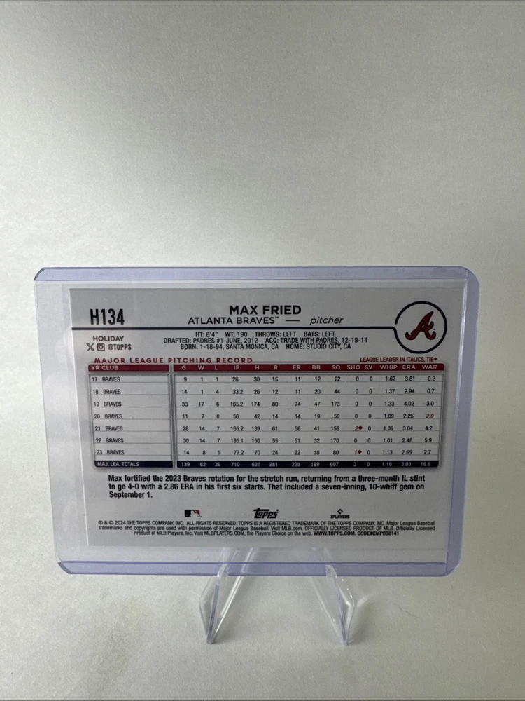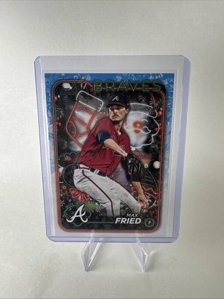 ships in sleeve, top loader, and thin cardboard in PWE 1 day or less handling time Step up your Atlanta Braves collection with the 2024 Topps Holiday card featuring Max Fried. This standard-sized, card stock piece is a must-have for fans and collectors alike, highlighting the pitcher in crisp, vibrant detail. Part of the beloved 2024 Topps Holiday base set, card number H134 captures the essence of the MLB season and is a unique snapshot of sports memorabilia. Crafted in the United States, this original card is not autographed, allowing the focus to remain on the athlete's depiction and your personal admiration for the game. Whether you're expanding your collection or starting a new one, this card is an excellent addition for enthusiasts of America's pastime and admirers of the Atlanta Braves.