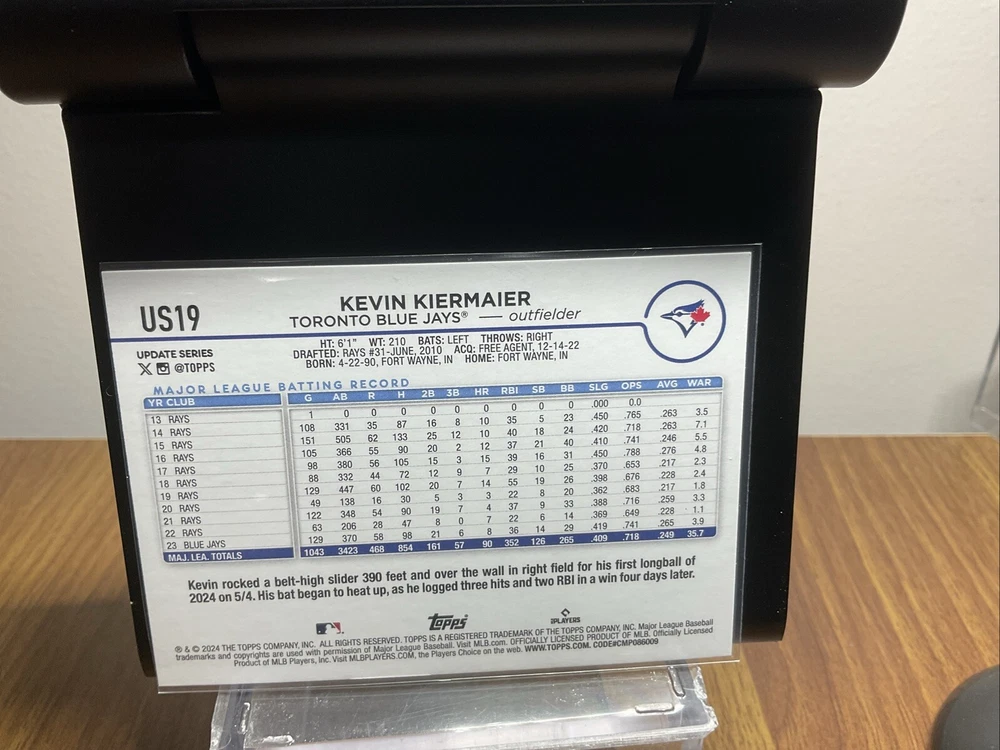 This 2024 Topps Update Baseball card features Kevin Kiermaier of the Toronto Blue Jays in the Major League Baseball. The card is a standard size and manufactured by Topps in the United States. It is a sports trading card with English language and depicts the player in his 2024 season. The card number is US19 and it is not autographed or vintage. This item is perfect for collectors of baseball memorabilia and fans of the Toronto Blue Jays.