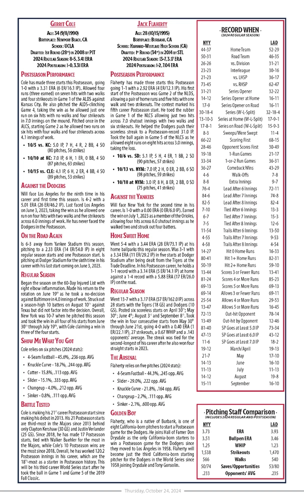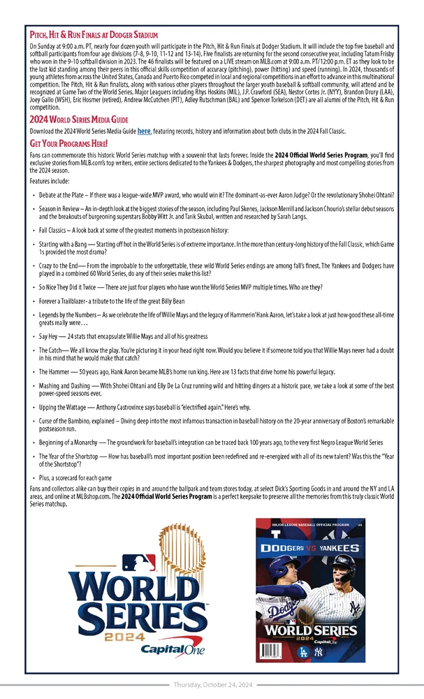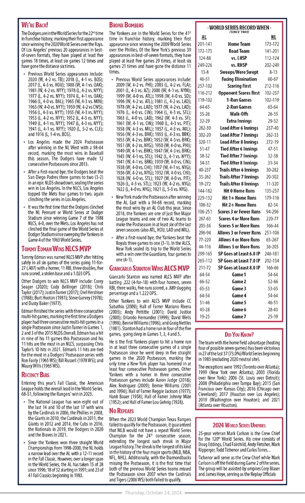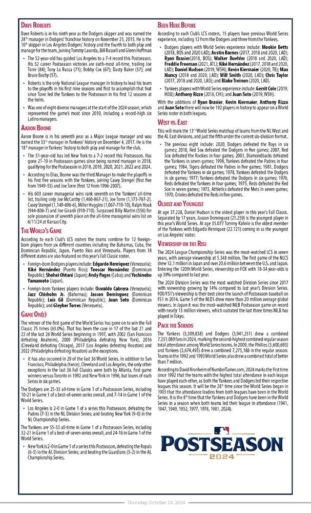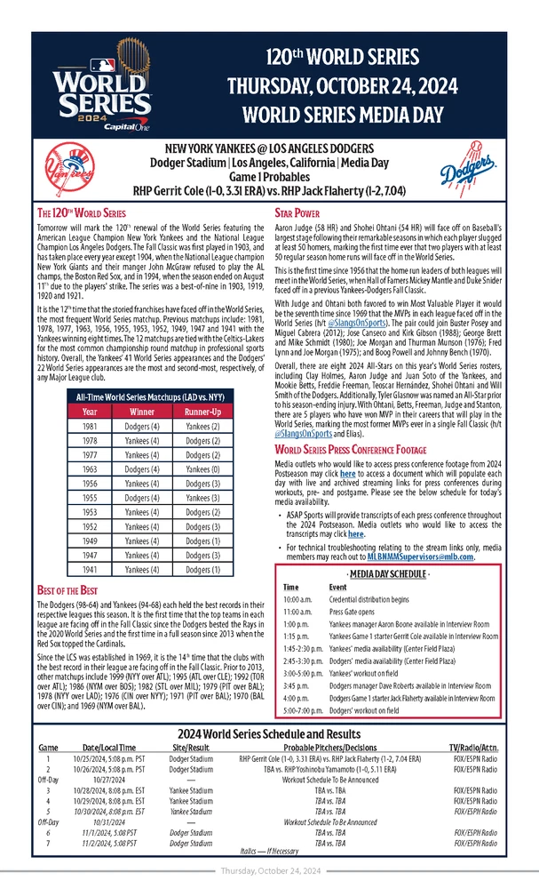 MLB Issued 2024 World Series Media Day Notes for Dodgers vs Yankees. Date: 10/24/2024 Size: 8.5x14" Pages: 5 Teams: Yankees vs Dodgers Smoke and pet free home.