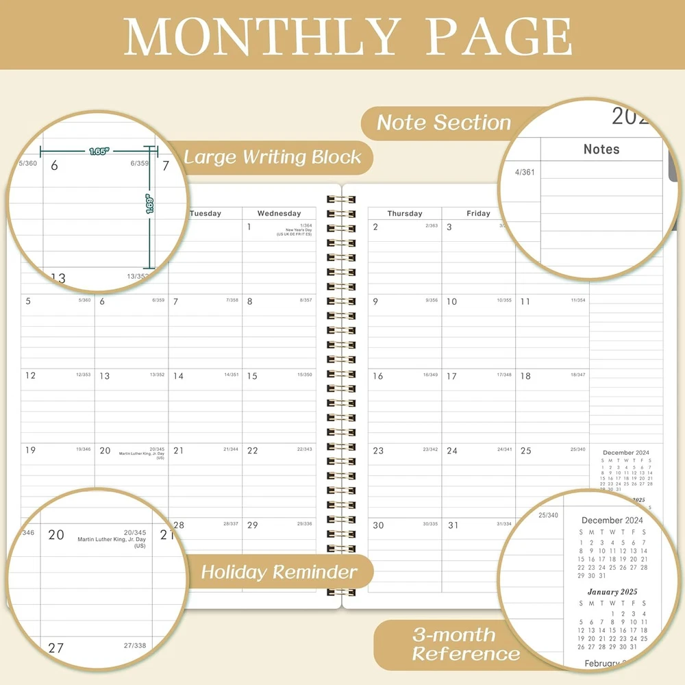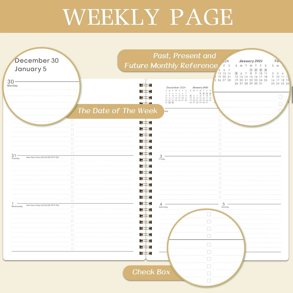 2025 Planner - 2025, JAN. - DEC. 8" x 10" 2025 Gold Product Details Manufacturer: Attitill Brand: Attitill Item Weight: 11.3 ounces Package Dimensions: 9.76 x 7.68 x 0.39 inches Item model number: HCS810MSDZYA25 Color: Gold Cover Material: Paper Material Type: Paper Sheet Size: 8x10 Manufacturer Part Number: HCS810MSDZYA25 Brand: Attitill Color: Gold Cover Material: Paper Year: 2025 Format: Organizer, Notebook Calendar Type: Weekly and Monthly Target Audience: Teacher, Adult, Student Sheet Size: 8x10 Material: Paper Item Weight: 0.32 Kilograms 2025 PLANNER - The 2025 planner weekly and monthly includes 2025 & 2026 yearly overview and 2025-2027 holidays overview. The planner 2025 is also a multifunctional planner, which uniquely adds extra function pages. WEEKLY PLANNER - The weekly planner pages of the 2025 planner contain 53 weeks, for more detailed daily goal planning. The 2025 planner weekly and monthly has plenty of space for daily planner writing. Each daily planning place of the planner spread across two sides to make your planning more flexible. MONTHLY PLANNER - The monthly planner pages of the 2025 calendar monthly planner contain 12 months. And the planner 2025 can help you comprehensively follow up the progress of the plan from the perspective of the whole month. This 2025 planner has enough writing space to make plans. There are also three months calendar reference in the planner, which can be used to check your date in your planning. 2025 PLANNER FOR ORGANIZATION- The 2025 planner weekly and monthly is absolutely the best planner for goal planning and efficient completion, suitable for office, study, life schedule, etc. The 2025 planner is not only good for your own use, but also good for your family, friends and loved ones. FUNCTIONAL DESIGNS - Well Designed Cover | Twin-Wire Binding | 2 Yearly Overview | 3 Years Holiday Overview | 2 Contacts Pages | Quick Reference Information | Holidays Reminder | Julian Dates | Notes Section | Monthly Tabs | 2025 Planner