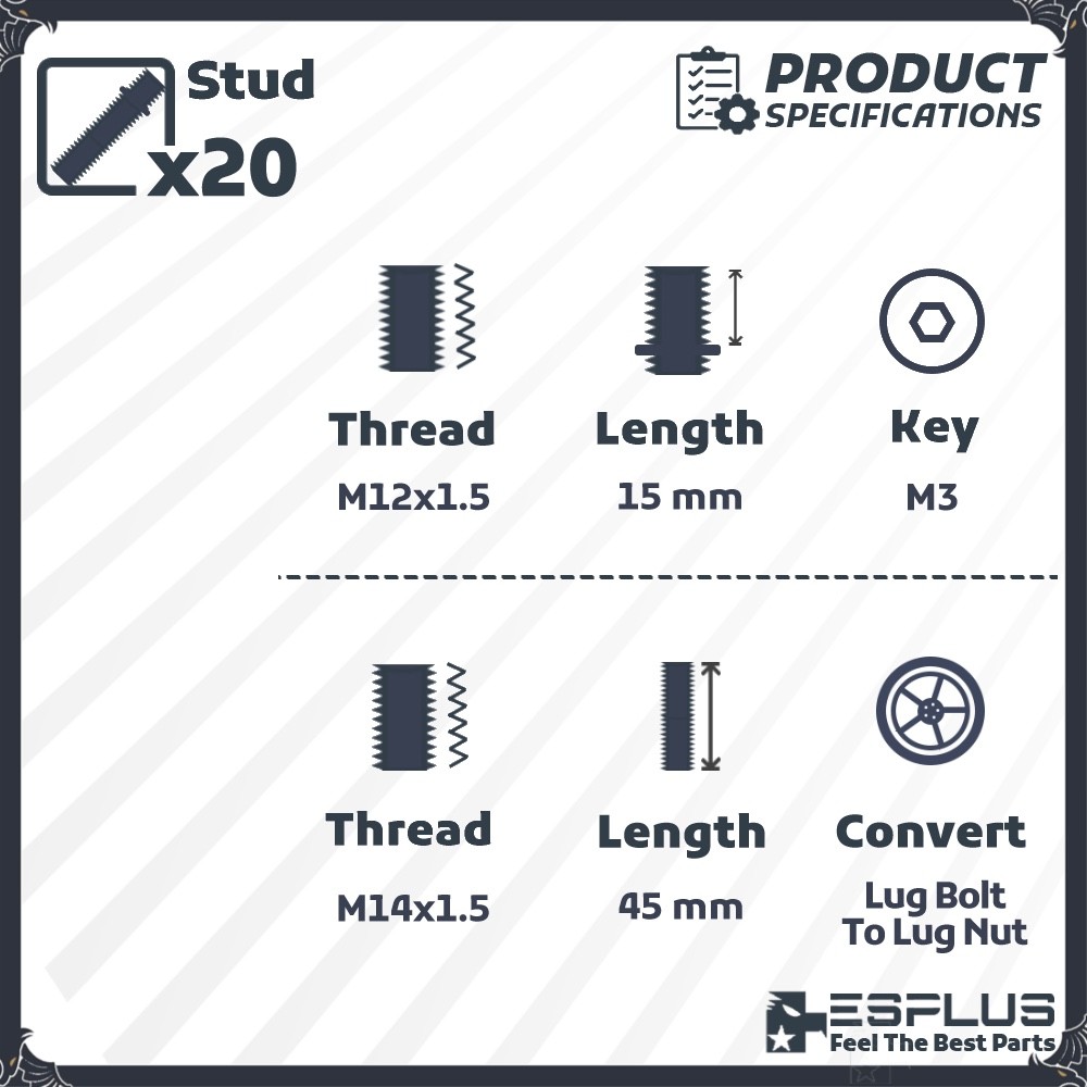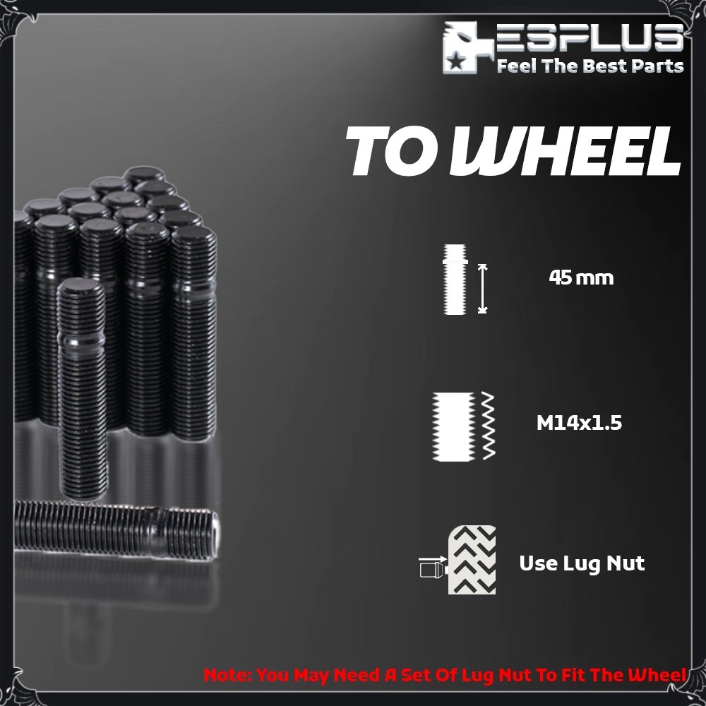 Store Home | Hot Products | Hot Deals | Suscribe for More | Customer Feedbacks | Contact us Categories Universal Lug Nuts OEM Lug Nuts Wheel Locks Conical Seat Lug Bolts Ball Seat Lug Bolts Hub Centric Spacers 4 Lug Wheel Adapters 5 Lug Wheel Adapters 6 Lug Wheel Adapters 8 Lug Wheel Adapters Studs Conversional Adapter 5 Lug HubCentric Adapter 6 Lug HubCentric Adapter Universal Wheel Spacers Extended Two-Way Conversion Wheel Stud / M14x1.25 Car Side/ M14x1.5 Wheel Side / 60 mm Overall Specifications Quantity: Set of 20 Pcs Stud Car Side Thread Pitch: M14x1.25 Car Side Length: 0.6"(15mm) Wheel Side Thread Pitch: M14x1.5 Wheel Side Length : 1.77"(45mm) Material: 10.9 Grade SCM Heat Treated Steel Color and Finish: Black Drive: M3 Tool Requirement: M3(3mm Tool) Package 20 Pcs Stud Important Notice For stock wheel users, we suggest to use shape of existing lug Bolts' Flange , Seat Type , and Shank Length as refernce before buying. Compatibility chart from Ebay is only designated for Bolt Pattern, Center Bore And Thread Pitch check. The actual fitment varies based on the requirements of wheels. Lug nuts/bolts seat has to strictly follow the wheel condition. If you are not sure, please do not hesitate to ask customer service. Our Return Policy If ever you’re not satisfied with your purchase, we offer 30-day return. Returned product must be intact and unused as the same condition of the original shape and package. Upon return, please contact the customer service for Return Merchandise Authorization (RMA) number prior to returning. A 25% restocking fee will be charged for all non-defective products. All refunds will be credited back to the original payment method. About US We strike to provide high quality auto parts. Your satisfaction is our first priority. Should you have any questions, please do not hesitate to contact our customer service for help. Limitation of Liability In no event shall our liability exceed the value of the product(s) sold. In no event shall our company be liable for any direct, indirect, punitive, incidental, special or consequential damages whatsoever arising out of or connected with the use or misuse of any of its products. Fitment Following chart is designated for Thread Pitch check only. Due to aging, your studs may have been changed. Please compare the shape and thread mark with your existing lug nut before buying. Q & A How do I know If this product will fit my car? 1. Use compatibility chart to check Make/Model/Year 2. Check wheel hub is factory default 3. Check That You Want to Convert the Lug Bolt Hub Into Lug Nut Uses 4. Check The Wheel You Want to Use Has Same Seat Type As Lug Nuts(Stock Wheels May Need Ball Seat Lug Nuts) 6. Check The Existing Bolt's Grade Level is 10.9, Same As Our Studs *You can also use existing lug Bolts thread/shape as reference Why is the product doesn't have enough grab to the wheels? Studs are too short to have enough thread into the hub. Solution: 1. You need longer Wheel Stud(More Than 45mm) 2. You need to use thinner spacer to match the Stud length Why is the product too thin that won’t hold my wheel? Your wheel requires large flange lug bolts to hold, for ideal flange size, please refer to your existing lug bolts Solution: 1. You need large flange Lug Nuts 2. You need to use Lug Nuts flange adapter to make it fit Why does the product not fit my wheel cap? Most of the wheel caps have clipers that require lug nuts to hold,our lug bolts may not have the same shape to match the clippers Solution: 1. You need to purchase the exactly same lug nut from the caps 2. You need to remove your wheel caps Why does the product not fit my hub cap? Most of the hub caps are much thicker than the hub without hub cap, it would require more thickness of spacer to fit Solution: 1. You need to purchase Thicker Spacers and Bolts due to the height of the hub-cap 2. You need to remove your hub-caps Why the wheel were damaged/damaging my car? The thickness of the spacer were exceed the maximum thickness of the fender requirement Solution: 1. You need to purchase Thinner Spacers and Nuts due to requirement of the fender gap 2. You need to remove your spcacers and use original Lug Nuts Why is the thread not matching my wheel hub, but my car is listed in the compatibility chart? Wheel hubs are subjected to be replaced due to aging or repair, after that, you may have different thread than factory default Solution: 1. Check the thread from your existing lug bolts 2. Any auto-shop would have a tool to measure thread, or you can send us a pic of your existing lug nut to confirm Why does my lug bolts have different mating seat type than the product I purchased? Seat type of mating surface is based on the wheels, different wheels have different mating surface requirements. Some stock wheels may require special mating surface assembling. Solution: 1. Check the matting surface from your existing lug nuts and that from your wheels 2. Alloy stock wheels, steel stock wheels, and aftermarket wheels have different mating specification What is the cut-off time for same day shipping? Cut-off time for shipping is 9:30 am PST every business day excluding weekends and ferderal holidays, The shipping date for weekends and federal holidays moves to next available week days How do I get expeditate shipping for timely purposes? Expeditate shipping is based on delivering address, in rear cases, carrier may experience delay due to operational difficulties. Solution: Contact customer service before placing expediate orders Not receiving my package but tracking says delivered Package may be lost, missent, placed in porch or mail box Solution: 1. Check if shipping address on file is up to date 2. Check surroudings including porch, mail box, door steps etc. 3. File item not receive case to ebay, carrier, customer service How does international order shipping work via eBay Global Shipping Program, and how do I check status? ebay Global Shipping Program (GSP) is eBay hosted internationa