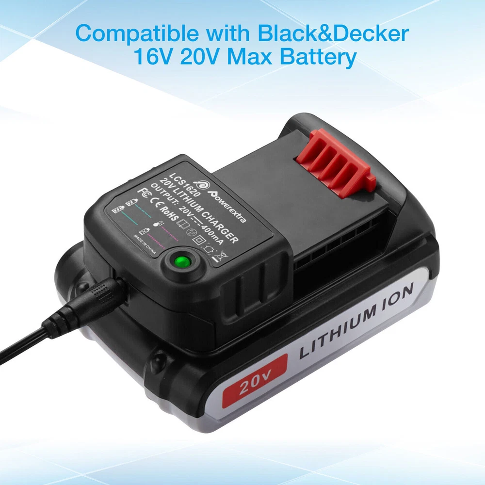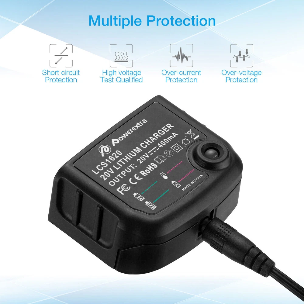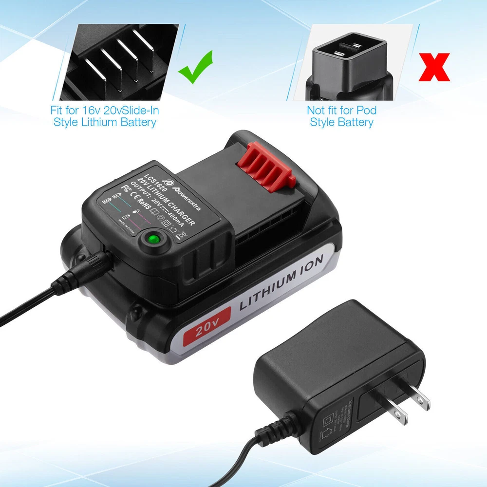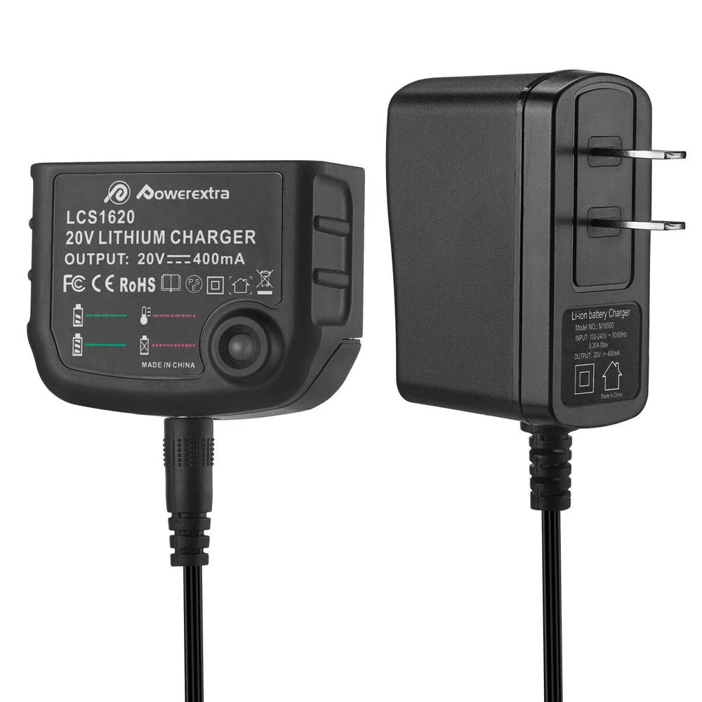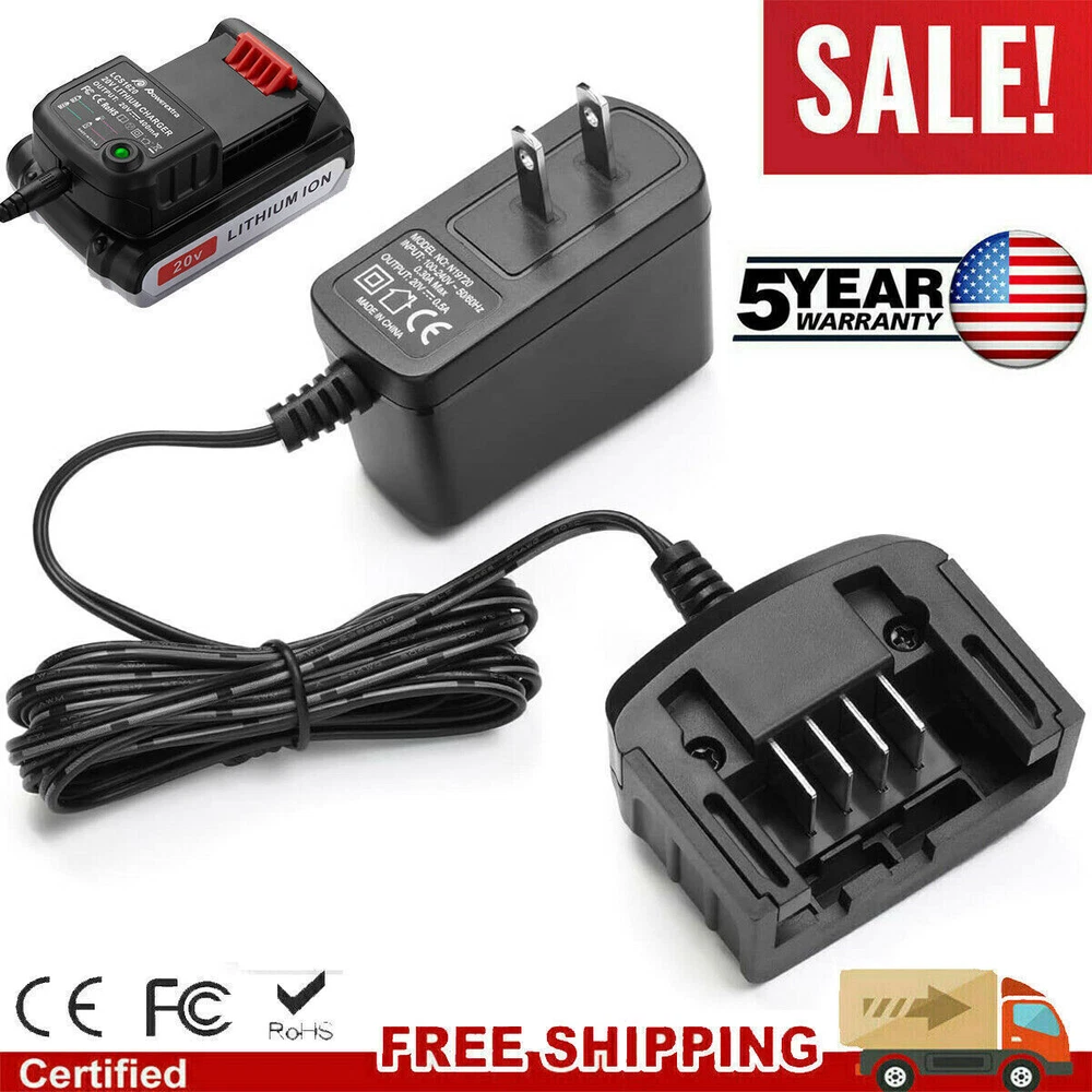 Product Features Product Features The charger has patented IntelliPort Technology, which protects battery cells, maximizes battery life, and conserves energy so well it earned an ENERGY STAR rating. The diagnostic read-out provides charging status and even lets you know if the battery is too hot or cold to charge. Replacement for Fast Charger PCC692L, 100-240V Input US Plug for Porter-Cable 20-Volt MAX Lithium Ion Battery Charges all For Porter Cable 20-Volt Lithium Tools Battery PCC680L, PCC681L, PCC682L, PCC685L, PCC685LP, PCC699L, PCC680, PCC685 Charges all For Black and Decker 20-Volt Lithium Tools Battery LBXR20, LBXR2020, LBXR2020-OPE, LBX4020, LB2X4020, LB2X4020-OPE, LB20, LBX20 Built-in charger diagnostic program checks batteries with every charge, 2.0Ah Lithium batteries full charged in 1.2 hour or less The two chargers are completely consistent in terms of functional charging efficiency. Please choose the style you like according to your preference. Thanks! Product Specifications Product Type: Replacement Porter Cable 20V Lithium Battery Charger Input: 100V--240V Output: 10.8V-20V Max Efficiency: 3.0A DC -- for Li-ion Compatible With Fit Battery Model: for Porter Cable 20-Volt MAX Lithium-Ion Battery: PCC680L, PCC681L, PCC682L, PCC685L, PCC685LP, PCC699L, PCC680, PCC685 for BLACK DECKER 20V MAX Lithium Battery Charger BDCAC202B and LCS1620Band LCS1620B Replacement Charger Model: For Porter Cable 20-Volt Lithium-Ion Charger PCC692L For BLACK DECKER 20V MAX Lithium Battery Charger BDCAC202B and LCS1620B Package Include 1 * 20V Battery Charger (Type A)for your choice 1 * 20V Battery Charger (Type B)for your choice NOTE: 1. The battery must be FULLY charged before first use. 2. The battery is stored in a cool and dry place. 3. Do not Separation, extrusion, and impact. 4. Do not put battery into water and fire. 5. Keep away from children. Payment Method: * We accept Paypal ONLY. It's a safer, faster and free way to pay! * Please pay the money within 8 days after the auction ended. * Non-Paying Bidders: Serious Buyer Only! Please place bid or "Buy it now" only if you agree the price and terms of the product and no argument after the auction end. And payment must be received within 8 business days of the auction close. We will report Non-paying buyer to eBay. Return & Warranty: * This product has a 5 years warranty . * if you has any problems with this item,please email us then we can solve it in a friendly way ,once we check it is indeed a problem with the item,we will full refund or resend you,and in order to save your time you don't need to return this products to us! * Our warranty does not extended to any products that are physically damaged or that are not under normal operating conditions as a result of misuse or improper installation on the buyer/user's part. * For all returned products, buyers MUST contact us for the returning address. * In all cases, sellers pay shipping fees at their own cost to return products for exchange or refund. Refund will be made upon receipt of the returned item Contact Us: * We have always been trying to provide the best service and reliable products for every customer, however, accident may happen sometimes, please contact us to resolve any issue before leaving a negative feedback. * Any question please feel free to contact us though ebay message center. About US: We focus on designing and manufacturing varieties of Power Tool batteries with quality and competitive price. We will do our best to serve you! On Oct 30, 2024 at 01:13:22 PDT, seller added the following information: