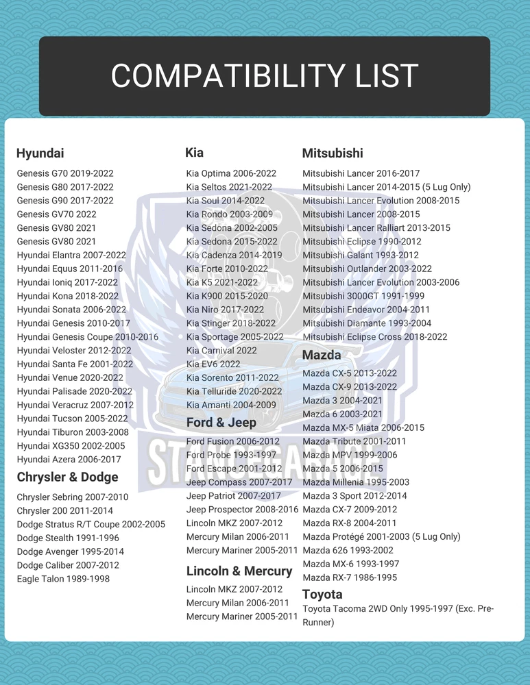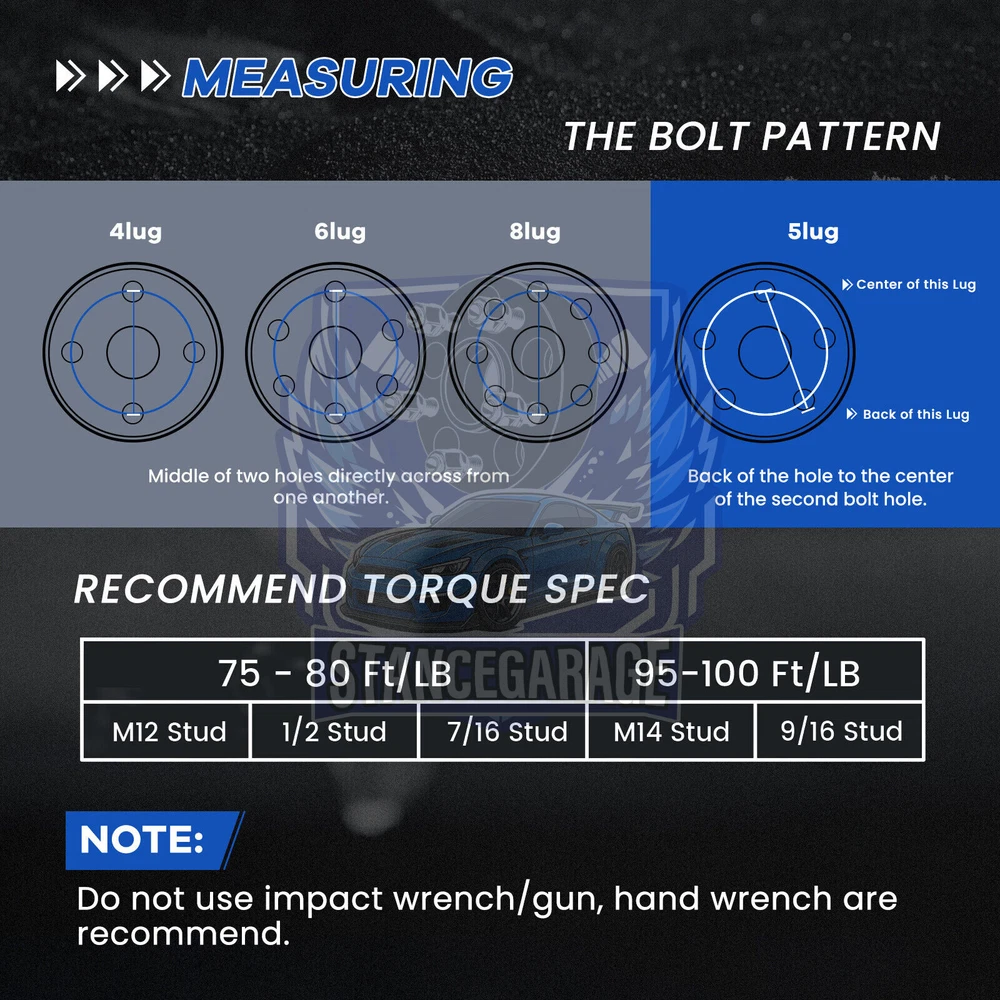 Adapter Width: 20mm each side Quantity: 2 Pieces Bolt Pattern: 5x114.3 to 5x114.3 (Equivalent to 5x4.5" inch) Center Bore: 67.1mm(Hub) to 56.1 Wheel (Allowing your vehicle to use wheels with smaller center bore. You can also use hub ring to keep wheels in centric state. For example 56.1 to 60.1 hub rings) Thread Pitch: 12x1.5 Adapter Type: Hub Centric w/Hub Lip This adapter set includes open end lug nuts to secure the adapters onto your factory hubs Your Factory wheel studs may extend past the surface of the wheel adapters. In this case you will need to: 1. Fine-Tuning Stud Length: Modify the existing factory studs to the appropriate size, if necessary, to ensure a perfect fit with the added accessories. 2. Inspection for Adequate Wheel Clearance: Prioritize checking that your wheels have the required intervals or voids between each bolt hole to facilitate spacer use. 3. Opting for Compact Stud Solutions: In cases where it’s beneficial, make the transition to a custom shorter stud set, designed to supplant the standard factory studs, enhancing overall compatibility.