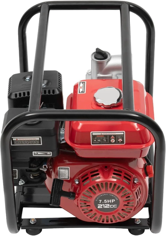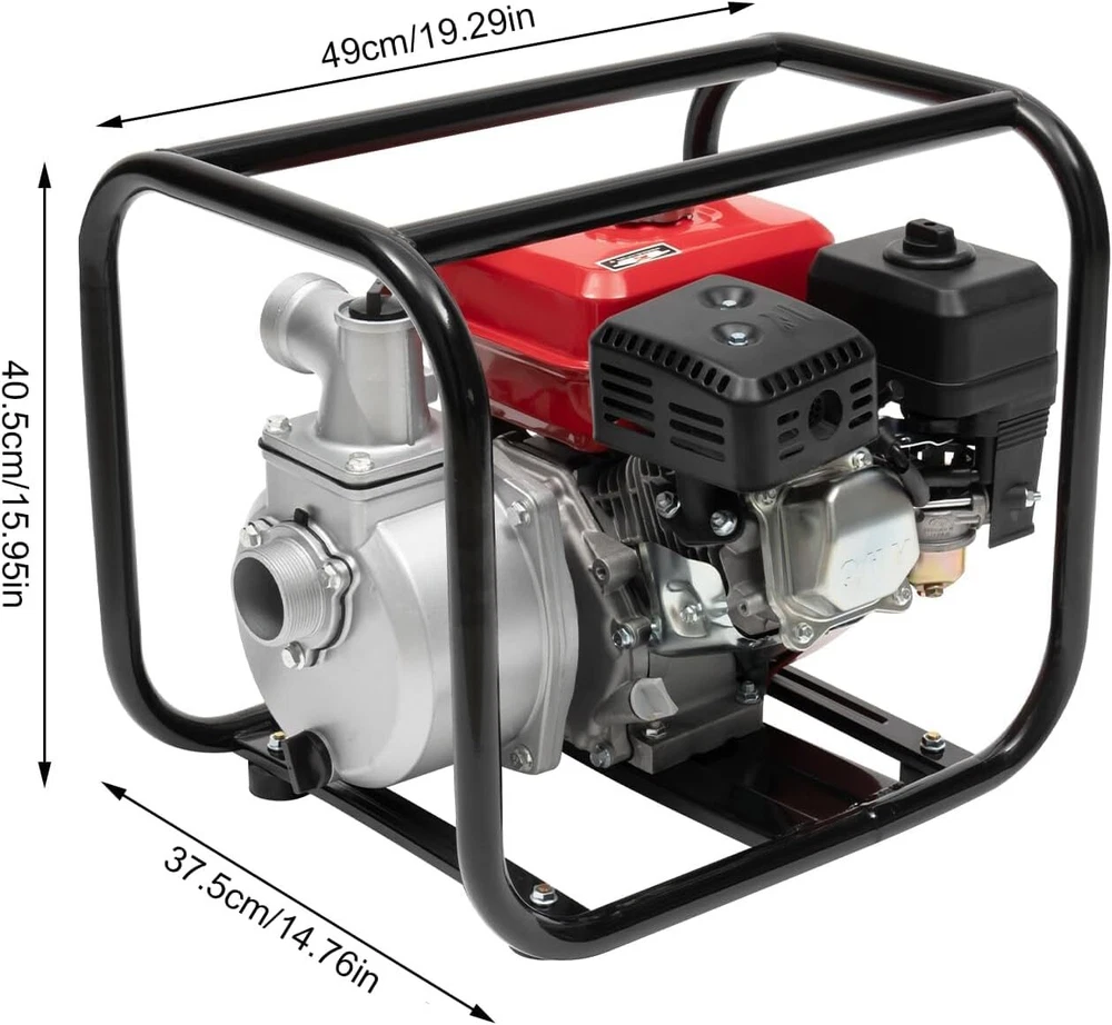 212CC Gas-Powered Trash Water Pump with Hose Kit- 2" | 7.5HP, 4-Stroke Engine Product Description Warm Tips Important Note: Our products are of top quality. Unfortunately, we've been targeted by false and malicious claims. Please don't be misled by these deceptive attacks. Application This trash pump can be widely used in a variety of scenarios, such as long-distance water transmission in farmland, large-area sprinkler irrigation in gardens, water for firefighting, fishpond aquaculture, water exchange in swimming pools, and water extraction from deep wells. Details Practical Filter: It can help filter impurities in water, prevent clogging of the machine, and reduce wear and cleaning trouble. T-Shaped Puller: The T-shaped design makes it easy to grip, and the auxiliary spring inside can help you start the engine more easily. Large Water Inlet and Outlet: The pump adopts large diameter water inlet and outlet, allowing large flow. Clamps: They can help you firmly fix the water pipe and prevent it from loosening and leaking due to strong water impact. Switch: You only need to press the switch to easily stop the machine, making it very easy to use. How to Use Place the machine flat and pour in engine oil until there is just oil dripping out. Excessive or insufficient oil will affect operation. Add 92 # gasoline. Fill the pump head with water until there is water overflow at the outlet. Move the red flameout switch up to the ON position. Adjust the throttle switch to the left, adjust the air outlet to the left, and adjust the oil circuit switch to the right. Start the machine by pulling out a small section of the pull rope and then quickly pulling the pull rope. Connect the inlet and outlet pipes. Specification & Package Material: Aluminum Alloy, Carbon Steel Processes: Die-casting Power Source: 92#Gasoline, 5W-40 Engine Oil Max. Power: 4KW Max. Torque: 12/250N.m/r/min Inlet/Outlet Diameter: 80mm/3 in Lift: 30m/98ft Suction Height: 7m/23ft Flow: 60 m³/2119ft ³/h Engine Type: 4-stroke, Single Cylinder, Air-cooled Engine Displacement: 221cc Engine Power: 7.5HP Power Speed: 3600rpm Ignition Method: Contactless Transistor Ignition Start Method: Manual Start Fuel Tank Capacity: 3.6L/0.95 Gal Oil Capacity: 0.6L/0.16 Gal Noise: 66DB (A) Fuel Tank Endurance: 5h Gross Weight: 22.5kg/49.6 lbs Pipe Length: 7.5m/24.61ft Product Size: 49*37.5*40.5cm/19.29*14.76*15.95in Package Size: 50.5*38.5*43cm/20*15*17in 1* 4-Stroke Gasoline Engine Water Pump 1* Water Pipe 1* English Instruction And Other Accessories for Assembly binding hi Manufacturer HAYGSAQ Part Number WP31X Wattage 4 KW UPC 756804565084 Type Air-cooledAir-cooled Material Aluminum, Carbon Steel Power Source Gas Powered Maximum Flow Rate 2119 Cubic Feet Per Hour Color Red Style 2 inch