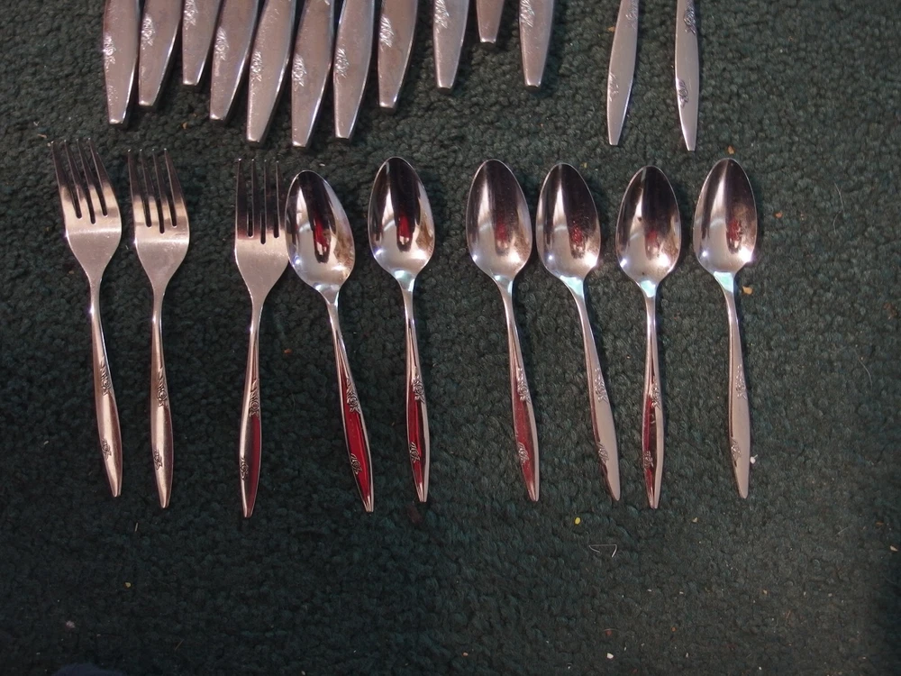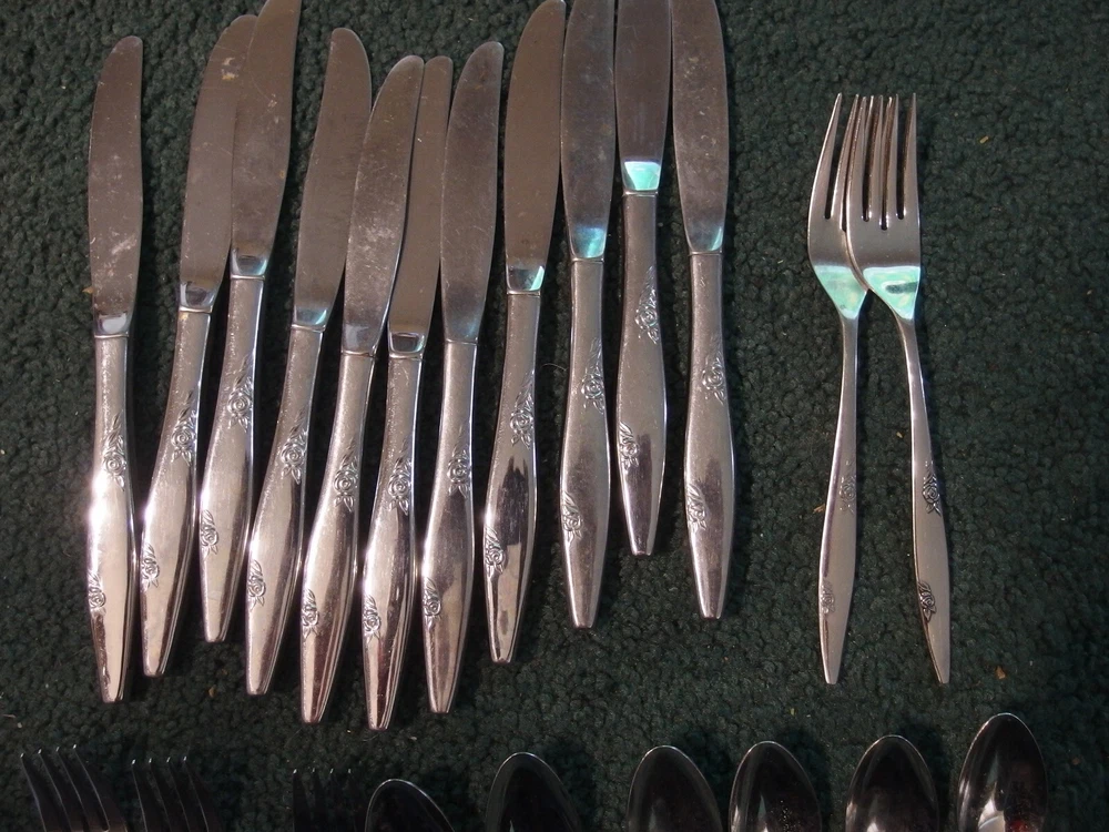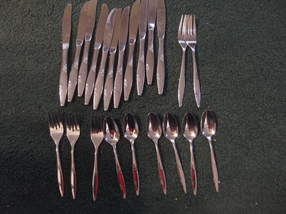 22 used matching Oneida Rose Duet pieces. 11 dinner knives,2 dinner forks,3 salad forks and 6 teaspoons. Good used shape,some nomal scratching and use wear. See pics for condition. See photos for condition.Photos are considered part of the condition and description.If you are buying multiple items,save them in your cart and make one payment and they will ship together and ask for reduced shipping on multiple items that can ship together. USPS sets shipping prices and we always send cheapest unless requested otherwise. Shipping prices are non negotiable. We DO NOT ship to any other address besides your approved shipping address on ebay and our labels are printed from the same. We ship to the USA ONLY. All items will be shipped out the next day.(not including weekends and holidays) ASK QUESTIONS,DO NOT ASSUME.IF IT IS NOT IN THE DESCRIPTION AND PHOTO ,IT IS NOT INCLUDED. If an item is listed as untested,as is,or for parts or repair it is sold "as is" and assume it does not work. We ship USPS and Fed ex only.Fed-ex does not ship to PO boxes. When you are satisfied with your purchase leave positive feedback and you will automatically receive the same. Z21