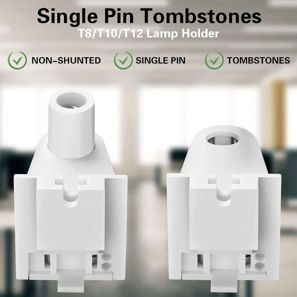 Applicable Ranges: the maximum wattage of the fluorescent tombstone is 660W and the maximum voltage reaches 600V, which can adapt to different kinds of T8, T10, and T12 single pin fluorescent tubes Stable and Reliable: the single bulb light fixture is made of PBT material, flame resistant, heat resistant, wearproof, and safe to use, which will not cause flame hazard, so you can use it with confidence Easily Snapping in: these fluorescent lampholder can directly connect to 18 gauge power wires, applying for both dual end power and single end power tubes; You can easily snap the tube into the mouth and complete the installation Proper for Fluorescent and LED Bulbs: the fluorescent lamp holder is suitable for FA8 single pin light tubes and 8 ft single pin LED bulbs, an efficient and nicely matching lamp replacement part for your broken lamp holders A Large Number of Quantities: the package includes 24 pairs tombstone base holder socket connectors for T8, T10, T12 single pin fluorescent tubes, sufficient quantity to meet your needs on retrofitting and replacements