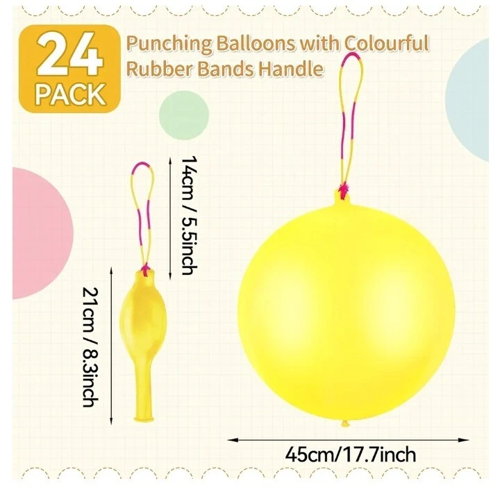 Abundant Quantity: Our set includes 24 yellow, green and red punchung balloons, 10 assortment of designs, provided in generous quantities to ensure that each guest has enough fun at your party to provide plenty of entertainment for a large group of children at a Christmas, birthday or holiday party. High-Quality Material: Crafted from durable latex, these punch balloons are designed for longevity. Heavy duty punching balloon are resistant to bursts, making them safe and reliable for children to enjoy without the constant worry of popping. Pure Color Design: Each punching balloon in this pack is a solid yellow color, offering a sleek and elegant look that complements any party theme. Versatile Functionality: Not only are these latex punching balloons perfect for parties, but they also serve as excellent party favors, goodie bag fillers, and entertainment for kids. They encourage playful interaction and are sure to keep young ones engaged during the Christmas festivities. Convenient and Easy to Use: Inflating these punching balloons is a breeze, and their design includes an elastic band on top, allowing for easy handling. This feature makes them simple to grasp and play with, enhancing the punching fun for children and adults. The elastic band is durable and suitable for all hand sizes, ensuring a good time for everyone.
