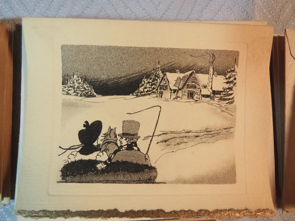 Lot of 24 vintage Christmas cards are from the 1920s to 1930s or so and are unused. There are 4 each of 6 different design cards, all with Christmas scenes, I think they are block prints, but not sure. The cards do not have any marks on them to show what company made them or where they were made. They all have the original envelopes. The cards are from the 1930s or so and are unused, but they do have some discoloration from age and the envelopes have dark areas where the glue has darkened the paper. A few cards are not flat, the horizontal edges are a bit curled.