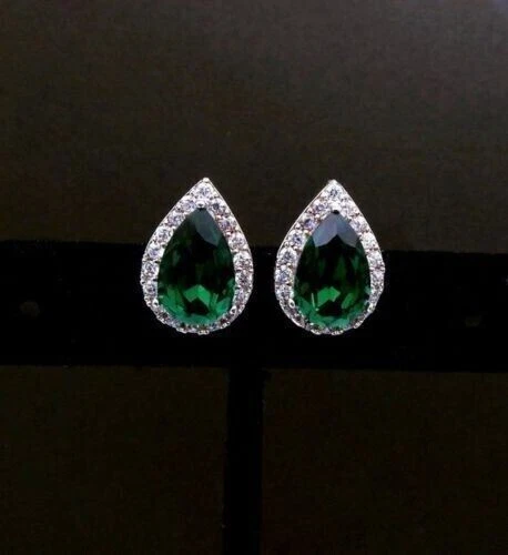 2.40 Ct Pear Cut Lab Created Green Emerald Stud Earring In 14K White Gold Plated