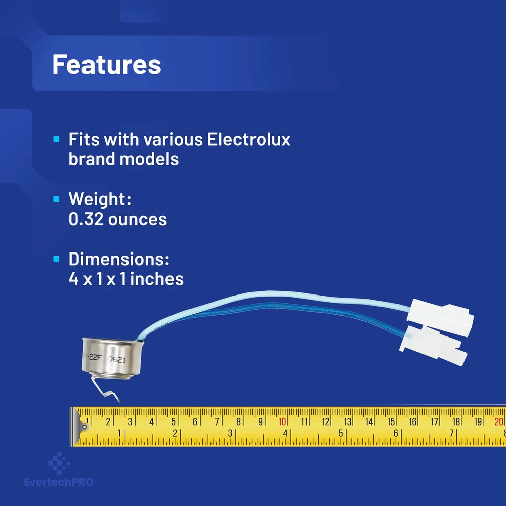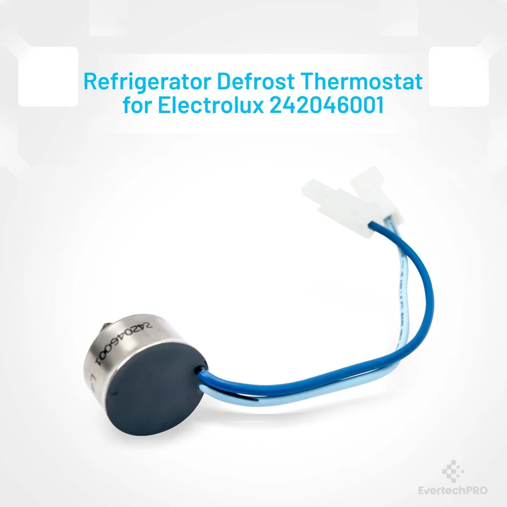 EvertechPRO Refrigerator Replacement Thermostat Defrost Part Number 242046001 replaces 1564839 AH2378768 EA2378768 PS2378768 This is not a Frigidaire OEM product. Fits Frigidaire Refrigerator. Compatible with CFD26SDS0 CFD26WIS0 CFD26WIS1 CFD26WIS3 CFD26WIS4 CFD26WIS5 CFD26WIS6 CFD27SDPS0 CFD27WIPB2 CFD27WIPB3 CFD27WIPS2 CFD27WIPS3 CFD27WIPW2 CFD27WIPW3 CFD28SDS1 CFD28SDS6 CFD28SDS9 CFD28WIB5 CFD28WIB6 CFD28WIB8 CFD28WIB9 CFD28WIBA CFD28WIBB CFD28WIBC CFD28WIS0 CFD28WIS1 CFD28WIS2 CFD28WIS3 CFD28WIS5 CFD28WIS6 CFD28WIS8 CFD28WIS9 CFD28WISA CFD28WISB CFD28WISC CFD28WIW5 CFD28WIW6 CFD28WIW8 CFD28WIW9 CFD28WIWA CFD28WIWB CFD28WIWC DGHF2360PF0 DGHF2360PF1 E23BC68JPS0 E23BC68JPS1 E23BC68JPS3 E23BC68JPS4 E23BC68JPS5 E23BC68JPS6 E23BC68JPS7 E23BC68JPS8 E23BC68JPS9 E23BC68JPSAA E23BC68JSS0 E23BC68JSS1 E23BC68JSS2 E23BC78IPS8 E23BC78IPS9 E23BC78IPSA E23BC78IPSB E23BC78IPSC E23BC78IPSD E23BC78IPSF E23BC78IPSG E23BC78IPSH E23BC78IPSJA E23BC78ISS7 EI23BC30KB1 EI23BC30KB2 EI23BC30KB3 EI23BC30KS1 EI23BC30KS2 EI23BC30KS3 EI23BC30KW1 EI23BC30KW2 EI23BC30KW3 EI23BC35KB3 EI23BC35KB4 EI23BC35KB5 EI23BC35KB6 EI23BC35KB7 EI23BC35KB8 EI23BC35KS3 EI23BC35KS4 EI23BC35KS5 EI23BC35KS6 EI23BC35KS7 EI23BC35KS8 EI23BC3 Use of the Manufacturers trade names and logos are the registered trademarks of their respective owners. Any use of the Manufacturers brand name, part numbers or model designation for this product is made solely for purposes of demonstrating and for identification compatibility and are displayed for descriptive purposes only. Use of them does not associated with, imply any affiliation or endorsement by any manufacturer. ❖ Compatible with Electrolux Frigidaire Gibson Kelvinator Westinghouse Refrigerator models including CFD26SDS0 CFD26WIS0 CFD26WIS1 CFD26WIS3 CFD26WIS4 CFD26WIS5 CFD26WIS6 CFD27SDPS0 CFD27WIPB2 CFD27WIPB3 CFD27WIPS2 CFD27WIPS3 CFD27WIPW2 CFD27WIPW3 CFD28SDS1 CFD28SDS6 CFD28SDS9 CFD28WIB5 CFD28WIB6 CFD28WIB8 CFD28WIB9 CFD28WIBA CFD28WIBB CFD28WIBC CFD28WIS0 CFD28WIS1 CFD28WIS2 CFD ❖ EvertechPRO Refrigerator Replacement Thermostat Defrost Part Number 242046001 replaces 1564839 AH2378768 EA2378768 PS2378768 ❖ Durable Premium Thermostat Defrost is a Functional Equivalent to OEM Specifications. Brand New in Original Retail Packaging ❖ Replacement part number: 242046001 Fits For Most Top Brand Refrigerators ❖ 1 - Year Warranty Guarantee or No Questions Asked 90 Day Return.