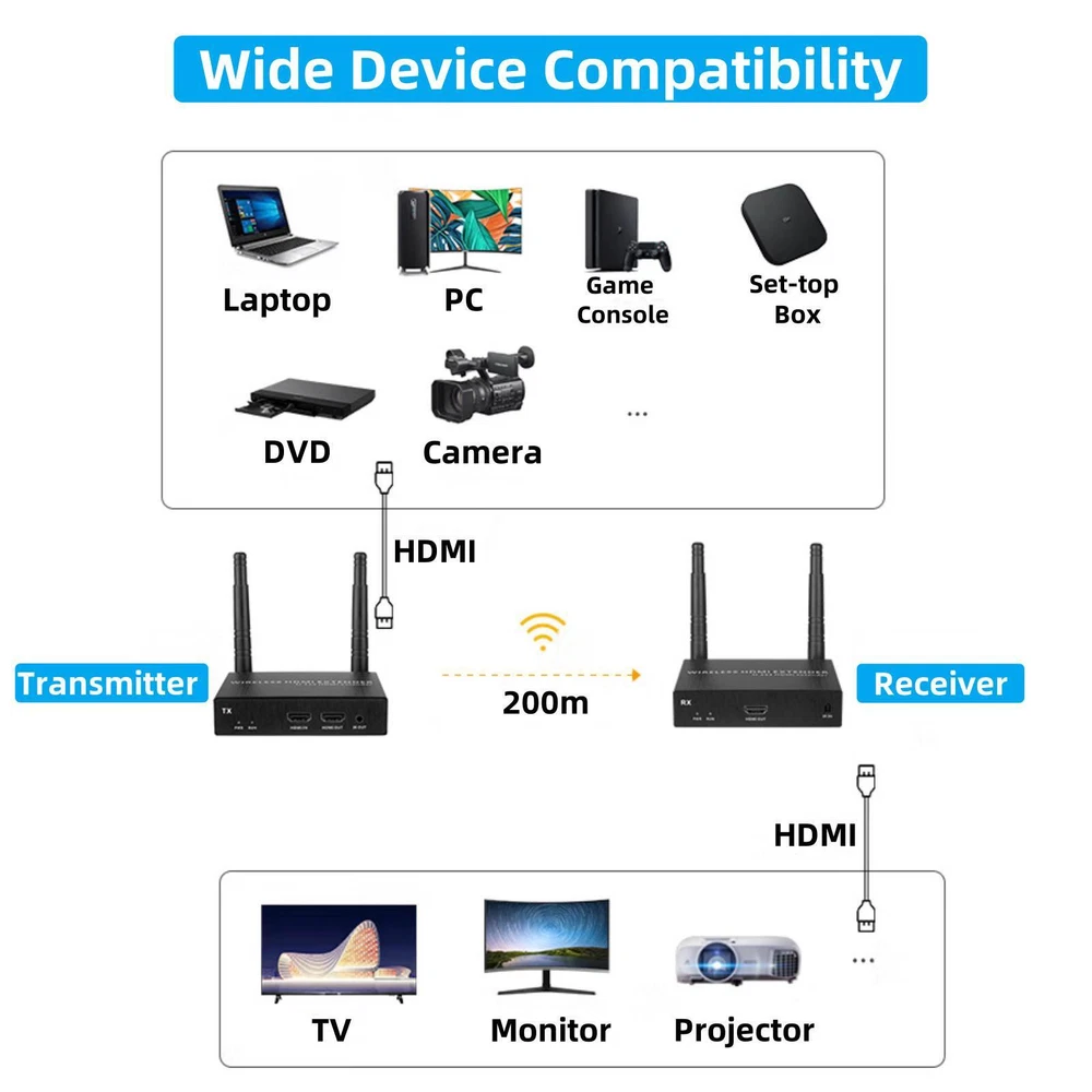 SAFE & SECURE SHOPPING 100% SATISFACTION GUARANTEED FAST SHIPPING Store Categories Store Categories You may also like 2.4GHz 5.8GHz Wireless Extender Transmitter and Receiver Transmission Remote Product Description Features: HD Visual Experience: With 1080P high-definition transmission technology, it ensures crisp and clear visuals with true-to-life color reproduction, bringing a cinematic viewing experience for both business presentations and home entertainment. Long-Range Stable Transmission: Supports stable wireless transmission up to 200 meters, effectively solving signal attenuation issues in large spaces. Ideal for conference rooms, classrooms, and family living rooms, ensuring seamless connectivity without signal drops. Audio-Video Synchronization: Ensures perfect synchronization between video and audio, eliminating delays. Whether watching movies, live streams, or conducting video conferences, users enjoy a smooth and natural audiovisual experience. HDMI Loop-Out Display: Features HDMI loop-out functionality, allowing for local monitoring without additional equipment. Real-time viewing of the transmitter's output enhances work efficiency and operational convenience. Flexible Transmission Modes: Supports both wireless and wired mixed transmission modes, catering to various scenarios. Wireless transmission offers convenience and flexibility, while wired transmission ensures more stability and reliability, providing a dual-layered safeguard for transmission quality. IR Remote Control Pass-Through: Enables infrared remote control signals to be passed through, allowing users to remotely control DVD players, TV set-top boxes, and other devices from the receiver end, enhancing the overall user experience. Multi-Display Capability: Boasts one-to-many transmission capabilities, supporting up to one transmitter and eight receivers, effortlessly achieving multi-screen synchronization. Ideal for educational settings, conferences, exhibitions, and more, enhancing information dissemination efficiency. Dual-Band Antenna Technology: Integrates 2.4GHz and 5.8GHz dual-band antennas, supporting automatic switching between bands. Equipped with dual 5dB high-gain antennas, it ensures faster and more stable wireless transmission, effectively resisting interference and enhancing signal penetration. Aluminum Alloy Craftsmanship: Crafted from high-quality aluminum alloy, it boasts an elegant and premium appearance, coupled with superior heat dissipation performance. The dual-row cooling system ensures smooth operation during extended use, prolonging the device's lifespan while providing anti-interference, anti-leakage, and high-temperature resistance for added safety and reliability. Wide Device Compatibility: Compatible with a wide range of HDMI input and output devices, including laptops, PCs, game consoles, set-top boxes, DVDs, cameras, and display devices such as TVs, monitors, and projectors, enabling seamless interconnection between diverse devices to meet various usage needs. Engineering-Grade Stability: Designed for extended continuous operation, it exhibits exceptional stability, ensuring no lag or dropouts during lengthy meetings or teaching sessions, providing users with peace of mind. Ethernet Port Functions: Facilitating quick pairing of new receivers via Ethernet cable to expand display terminal capabilities, enabling firmware upgrades for optimal device performance and adaptability across various application scenarios, allowing flexible resolution settings to meet compatibility and display effect requirements of diverse display devices, customizing WIFI channels for efficient signal transmission by avoiding interference between multiple systems, and ensuring stable transmission to the receiver end via Ethernet cable in complex environments where wireless signal penetration is challenging. Specifications: Default IP: TX 192.168.1.166, RX 192.168.1.167(Configurable) Compatible: For PC, for Camera, for TV Box, for Projector, for Display, etc. Resolution: 1920 x 1080 at 60fps Power Supply: DC12V, 1A Frequency: 2.4GHz & 5.8GHz Connection: Wireless or Wired (Switch Supported) Transmission Distance(Open Air): 200M IR Control: Supported Package Included: 1 x Transmitter 1 x Receiver 2 x HDMI Cables 2 x DC12V Power Adapters 1 x Infrared Emitter (Linear) 1 x User Manual Shipping Returns Contact Us Payment Shipping We ship most of our orders within 24 hours, and may up to 48 hours. If you want faster shipping way, please contact us before making a payment. Sometimes due to problems with our transportation company system, your shipping information may be delayed to update. We recommend that you try again after 3-4 days. If you still haven't checked the shipping information, you can contact us via ebay message. Returns 1. 30 days warranty from the purchased date. Please contact us via email before returning the defective item. 2.Our warranty does not extended to any product that are physically damaged or that are not under normal operating conditions as result of misuse or improper installation on the buyer/user's part. 3.Return items should include the original packaging and all accessories. buyers MUST contact us for the returning address. 4.In all cases, buyers pay shipping fees at their own cost to return products for exchange or refund. We will be responsible for the postage of replacements. Refund will be made upon receipt of the returned item. Contact Us Pls contact us if you have any problems,we will try our best to solve for you Payment We accept all verified payment from eBay. Copyright © 2022 Tongtool
