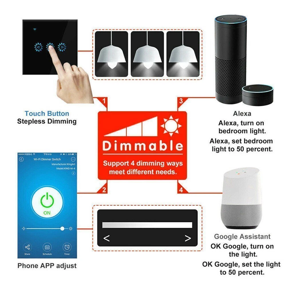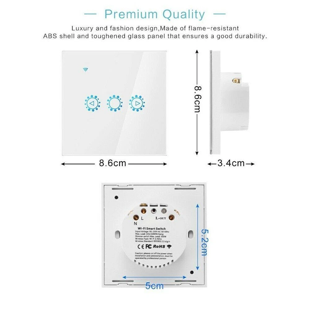 SAFE & SECURE SHOPPING 100% SATISFACTION GUARANTEED FAST SHIPPING Wall Switch WiFi Smart Light Dimmer Touch Remote Control Light for Alexa US Product Description Note: 1. Need neutral wire; 2. Before buying, please check if your flush-mounted installation box is suitable; 3. Can only be used with dimmable LED bulbs. 4. 5G network connection is not supported. Descriptions: 100% brand new. Name: Wifi dimming touch remote control smart timer switch black (EU / UK universal, EWELINK scheme) Material: PC Optional Color: white/black Features: Ultra-thin luxury tempered glass panel, crystal clear and never fade, ten years is still bright and clean as new. Zero fire wire design, directly replace mechanical switches; Low power consumption standby, energy saving and safety; fast response speed, no delay; Anti-lightning, anti-surge, effective protection circuit; Wi-Fi remote, non-directional, unlimited distance, more convenient operation. Can be used with Amazon Alexa, with Google Home, IFTTT. APP remote control: As long as the mobile phone has 2G / 3G / 4G / WIFI network, users can remotely control the on / off / dimming of home appliances using the smartphone anytime and anywhere through the APP. It makes your home appliances smart in 1 second. Compatible with iOS and Android OS. Specification: Material: high quality ABS Product certificate: CE, ROHS, EMC / FCC, real safety testing Power supply mode: neutral line, live line Input voltage: AC100V ~ AC230V 50 / 60Hz Overall dimensions: 86 * 86 * 32mm Control number: 1 Load power: 2A / channel (triac contact) Transmission method: WiFi Wireless standard: WiFi (2.4G 802.11 b / g / n), does not support 5G networks. Control distance: infinite distance (under 2G / 3G / 4G / WiFi network) Applicable system: IOS 8.1 / Android4.1 and above App language: adaptive Chinese / English / Korean / German / French / Spanish / Italian / Arabic Control method: touch, voice control, mobile APP three-in-one multi-function control Suitable for the market: EU / UK APP download: eWeLink. Package list: 1 dimmer switch Payment Shipping Returns Contact US Payment Payment must be completed within 5 days. If you have any problems about payment, please contact us via ebay message. Shipping We only ship to confirmed ebay Order addresses. Please comfirm that your Order address is in line with your shipping address. Please kindly note that the combined shipping is not provided because the shipping fee is calculated by weight. Also, the each additional item means exactly the the same color and size. It takes about 7-15 working days to US; about 10-30 working days to other countries. Transit time may be a little delayed because of the bad weather and customs inspection. If you do not receive your item within 30 working days since payment finished, please contact us immediately for further assistance. Returns Items can be returned for exchange or refund within 30 days from the date you receive your merchandise. We are not responsible for any purchase after this 30-day period. Return shipping is the responsibility of buyer unless the return is a result of our mistake (i.e., your receive the wrong item). We will pay for shipping replacement back to you if an exchange is requested. Contact US Customer satisfaction is very important to us and our feedback rating reflects this satisfaction. If you have any questions, Our customer service staffs welcome feel free to contact us by EBAY message box. We strive to answer all questions and resolve any problems as quickly as possible. Copyright © 2022 Tongtool On Dec 15, 2024 at 22:45:31 PST, seller added the following information: