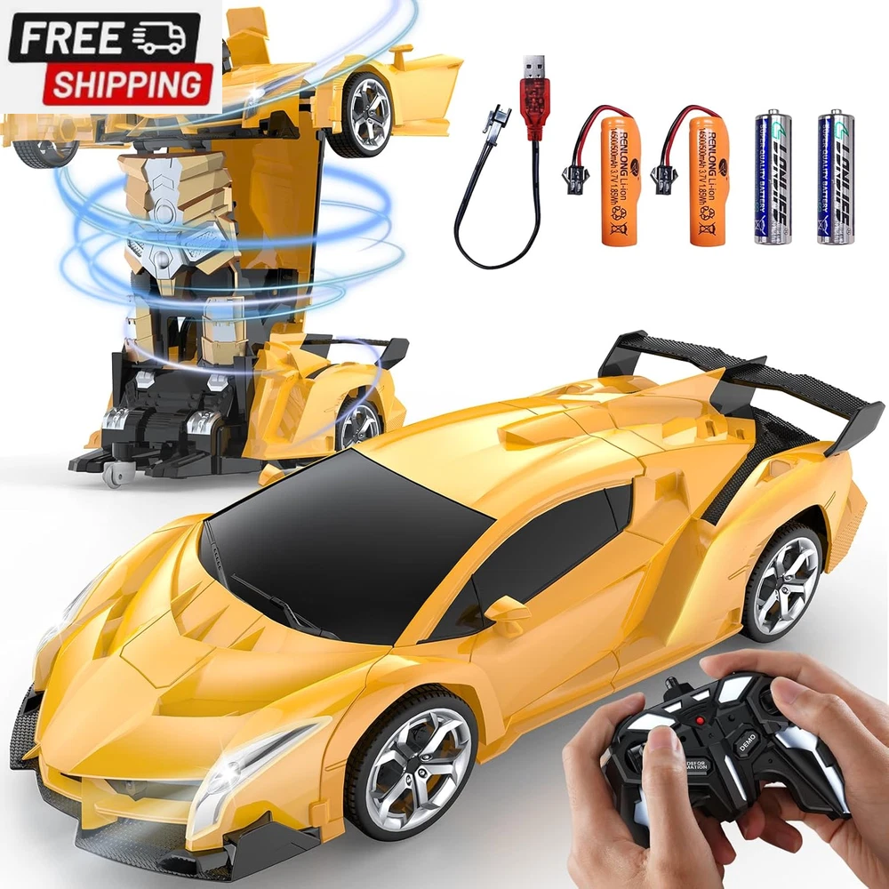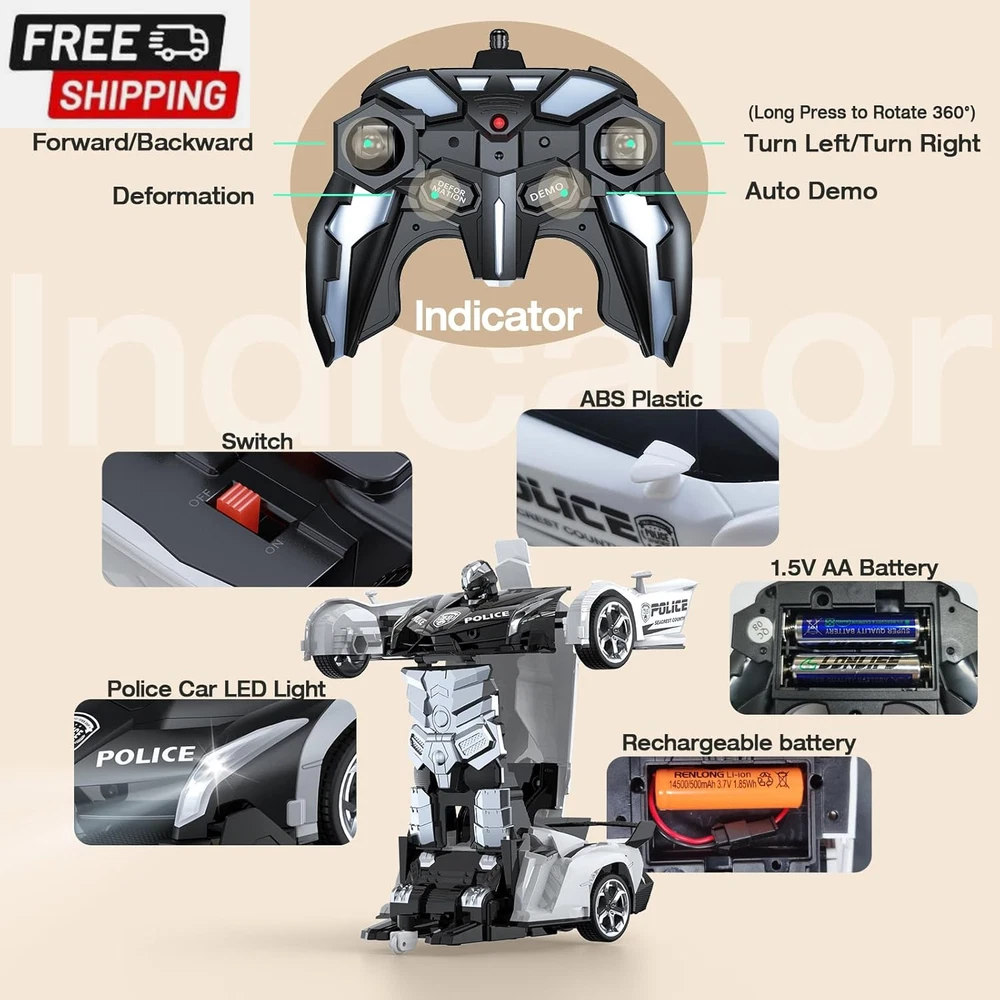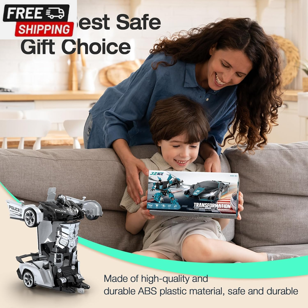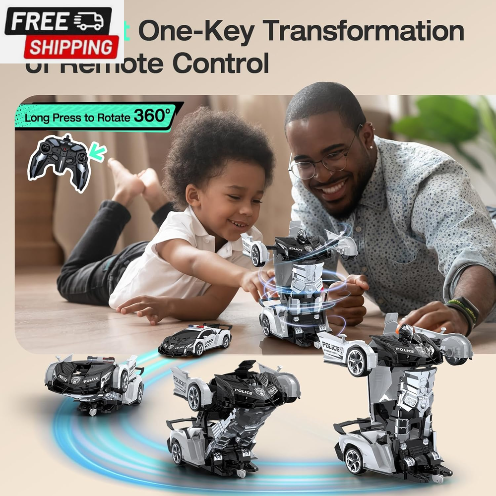 Remote Control Car Toy, 2.4Ghz Transform Robot RC Cars with Flashing Light, 1:18 Scale One Button Deformation Toy Gift Car & 360° Rotating Drifting RC Toy Car for Age 6-12 Years Boy Kids-Black 【Cool 2-in-1 Transformer Toy Car】This 2-in-1 toy RC car combines the features of cars and robots. Just press the button on the remote control, and children can easily control the transformation process of the transforming car. There is no obstacle up, down, left, and right. It can also transform while driving. The 360° rotating smart remote control car suitable for boys allows children to enjoy the fun of manipulating the transforming car! 【Double battery, double game time】Super long battery life. While pursuing a better game experience, we specially prepared 2 AA batteries (for remote control) and 2 rechargeable batteries (each set of batteries provides up to 60 minutes of use time), so that your children can enjoy this creative toy car that combines the features of cars and robots! 【Cool LED police lights & 2.4GHz remote control】Our children's remote control car is equipped with LED police lights, bringing the most realistic police car experience. It can provide lightning-fast response time and a powerful control range of up to 30 meters, achieving more precise control, and multiple cars will not interfere with each other. You can play different cars with family, children and friends at the same time, and enjoy endless fun without interfering with each other 【One-click transformation】This stock transforming car includes an automatic demonstration function, which will surprise children! ! The unique universal wheel design allows children to enjoy the 360° rotation drift of the transforming car. If you encounter any problems, please contact us and we will try our best to solve them for you 【Great and safe gift for kids】High-quality raw materials are safe and durable. Made of high-quality and durable ABS plastic material, it is non-toxic, durable and safe for children. The body is very strong and impact-resistant, ensuring that it will not be easily damaged when used by children. It is durable and is a great toy for 6 7 8 9 10 11 12-year-old boys. It is also an ideal gift for children's birthdays, Christmas,other festival Product Description The video showcases the product in use. The video guides you through product setup. The video compares multiple products. The video shows the product being unpacked. LED Lights Equipped with LED lights, bringing the most realistic police car experience ABS Plastic Made of high-quality and durable ABS plastic material, it is non-toxic, durable and safe for children Rubber Wheels Rechargeable Batteries Please use a normal charging head for charging (you can use a computer USB /Power Bank) Do Not use a fast charging head to avoid damaging the battery Shipping Fast shipping is very important for us. Our standard US shipping service is FREE. Your order will be shipped within 2-3 business days upon full payment received. Your order will be delivered within 2-3 business days after the handling time. We only ship to the confirmed PayPal address. We reserve the right to cancel any order for any reason at any time. We are not responsible for undeliverable addresses. Returns and payment We offer a 30 days return policy from checkout winning date. We allow only PayPal as payment method FeedBack Your feedback very important to us, after you get your package and you are satisfied with our service please leave us positive feedback If you have any problem with your order / any questions please before leave any type of feedback For any questions, using eBay contact system Please visit our eBay store to check out other items for sale! Thank you for shopping at our store.