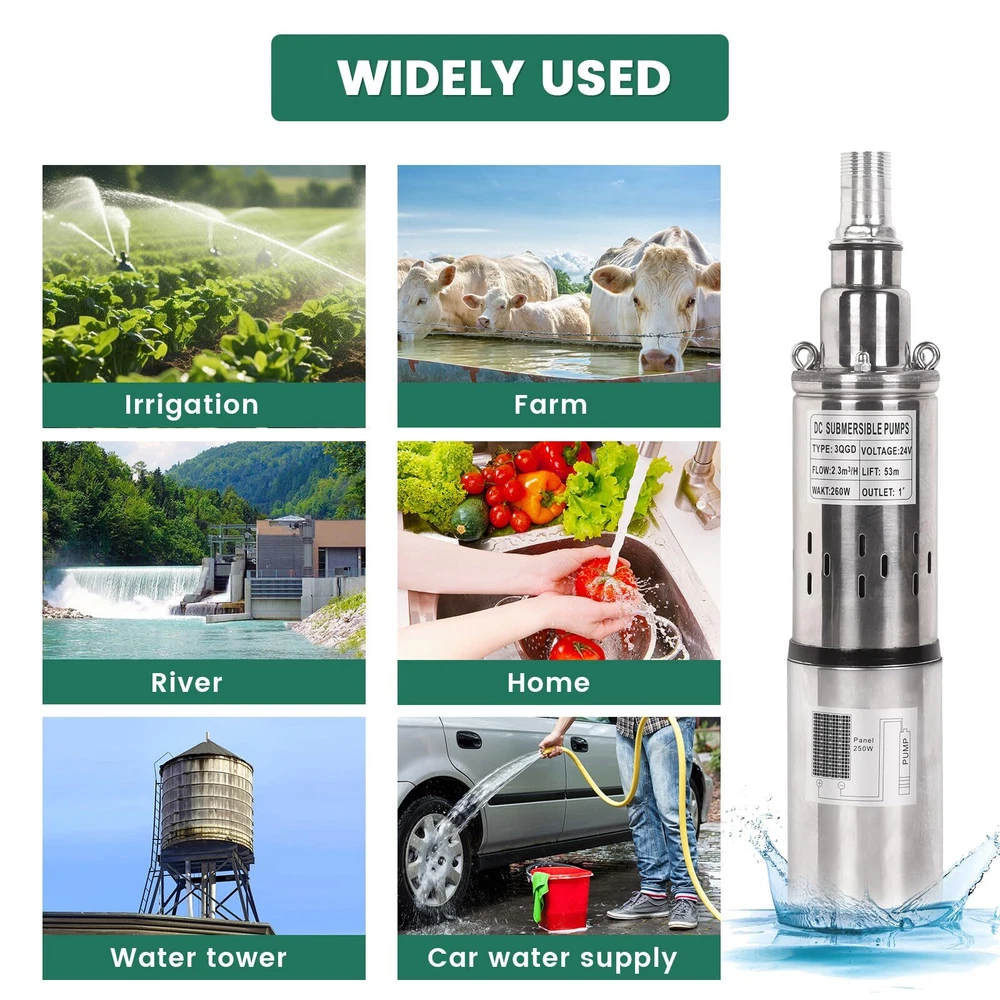 24V 260W Solar Water Pump Deep Well Solar Submersible Pump head 173ft stainless Details: About this item 【Product Introduction】: [Voltage]:24V/260W, [Flow]: 10.13GPM(2300L/H), [Outlet size]: 1 inch(25mm), [Max Head]: 53m (173ft), [Diameter]:3inch/75mm, [Weight]: 4.13kg/9.11lb, [Package size]: 13.2*3.07*3.07 inch. 【Solar Power Supply】: Environmentally Friendly. This submersible water pump is powered by solar energy, making it an eco-friendly, safety, economy and cost-effective option for pumping water. (NOTE: Please confirm whether the voltage and frequency compatible with your local standards before you order and it is prohibited to use with no water.) 【High Quality Material】: The solar well pump is made with durable stainless steel, this pump is corrosion-resistant and built to last, ensuring long-term reliability and performance. 【Stable Performance】: Less power cost, larger flow ,high pressure and great anti-corrosion ability. The compact size and lightweight design of this water pump 24v make it easy to install and transport. Additionally, the stainless steel construction makes it easy to clean and maintain. 【Versatility】: The industrial grade heavy-duty screw submersible well pump is very suitable for household and public utility applications. Suitable for rural areas, homes, farms, wilderness, camping water supplies, fishing boats, fish ponds, agricultural irrigation, etc. PRODUCT SPECIFICATION Voltage: 24V Power: 260W Solar Energy Max. head: 173ft / 53m Max. flow rate: 10.13GPM Speed: 3000r/min Outlet: 1 inch OD Pipe: 3 inch Black Circle Cable: 55.77ft / 17m Material: Stainless Steel Waterproof Grade: IP68 Stable Performance Solar Power Supply Stainless Steel Material Stable Performance Package Include: 1 x Solar Submersible Well Pump 1 x Electric Cord 1 x User Manual 24V Solar Submersible Deep Well Pump The industrial grade heavy-duty solar submersible pump is less power cost, larger flow ,high pressure and great anti-corrosion ability. The compact size and lightweight design of this pump make it easy to install and transport. Additionally, the stainless steel construction makes it easy to clean and maintain. Product Dimensions: 13.23 × 3.07 × 3.07 inch Product Weight: 8.97 lbs Package Dimensions: 16.14 × 3.74 × 6.69 inch Package Weight: 9.44 lbs Solar Power Supply This solar submersible water pump is powered by solar energy and is a safe, economical, and cost-effective pumping option. Premium Quality The solar submersible well pump is made with durable stainless steel, this pump is corrosion-resistant and built to last, ensuring long-term reliability and performance. Multiple Filtration Mesh It can effectively filter the stones and larger particles in the well water, and at the same time, protect the internal parts of the pump and prolong its service life. FAST SHIPPING WARRANTY EASY RETURNS CONTACT US FAST SHIPPING We only ship to US mainland 48 states and worldwide via ebay international shipping program. We don't offer direct international shipping. Consult us if you live in Hawaii, Alaska or Virgin Islands. Also we don't ship to any APO/FPO/PO BOX address. We offer FedEx Ground or Home delivery in optional which can make it faster, charge additional shipping fee. Delivery is any day from 1-5 business days (Monday through Friday, excluding weekends and holidays) WARRANTY This item is covered by our 12 months unlimited mileage warranty. Any customer may use the same outlets to facilitate a return or warranty claim. Any item must be returned within 30 days of the original purchase for refund; item(s) retaining a warranty may be returned beyond 30 days but within the remaining warranty period. Returns that are not subject to warranty may accrue a restocking fee and should be returned at the customers cost. We reserves the right to request proof of purchase and mechanical failure in the event of any warranty claim; any returns or claims that violate Ebay's Online Return policies will be reported. We holds no responsibility or liability for additional repairs, damages (punitive or non-punitive), loss of time, or any other extraneous circumstances created by a purchase made from said party. EASY RETURNS We understand that sometimes you need to make a return or an exchange. All we ask is you send it back in the same condition it was received - new and un-used. If the product you receive is not the one you ordered, please take photos of any visible of visual reference and contact us directly; photos must be CLEAR and VISIBLE. Logistical claims must be filed within 30 days of received the product; exchanges in these cases will be handled promptly and at?no cost to the customer. In order to process a return or exchange, please call us or send us a message through eBay and we will be happy to assist you immediately. However,any return that is NOT defective or NOT received in error, is the responsibility of the customer. We DO NOT cover any shipping costs and/or additional fees associated with the transaction. CONTACT US We are open Monday to Friday 8am to 5pm Mountain Standard Time, and Saturday 9am to 1pm MST. Our friendly staff are available during these hours. Please feel free to call us, or send us a message via eBay. We aim for complete customer satisfaction and repeat business; we will be more than happy to help you feel 100% comfortable with your purchase.