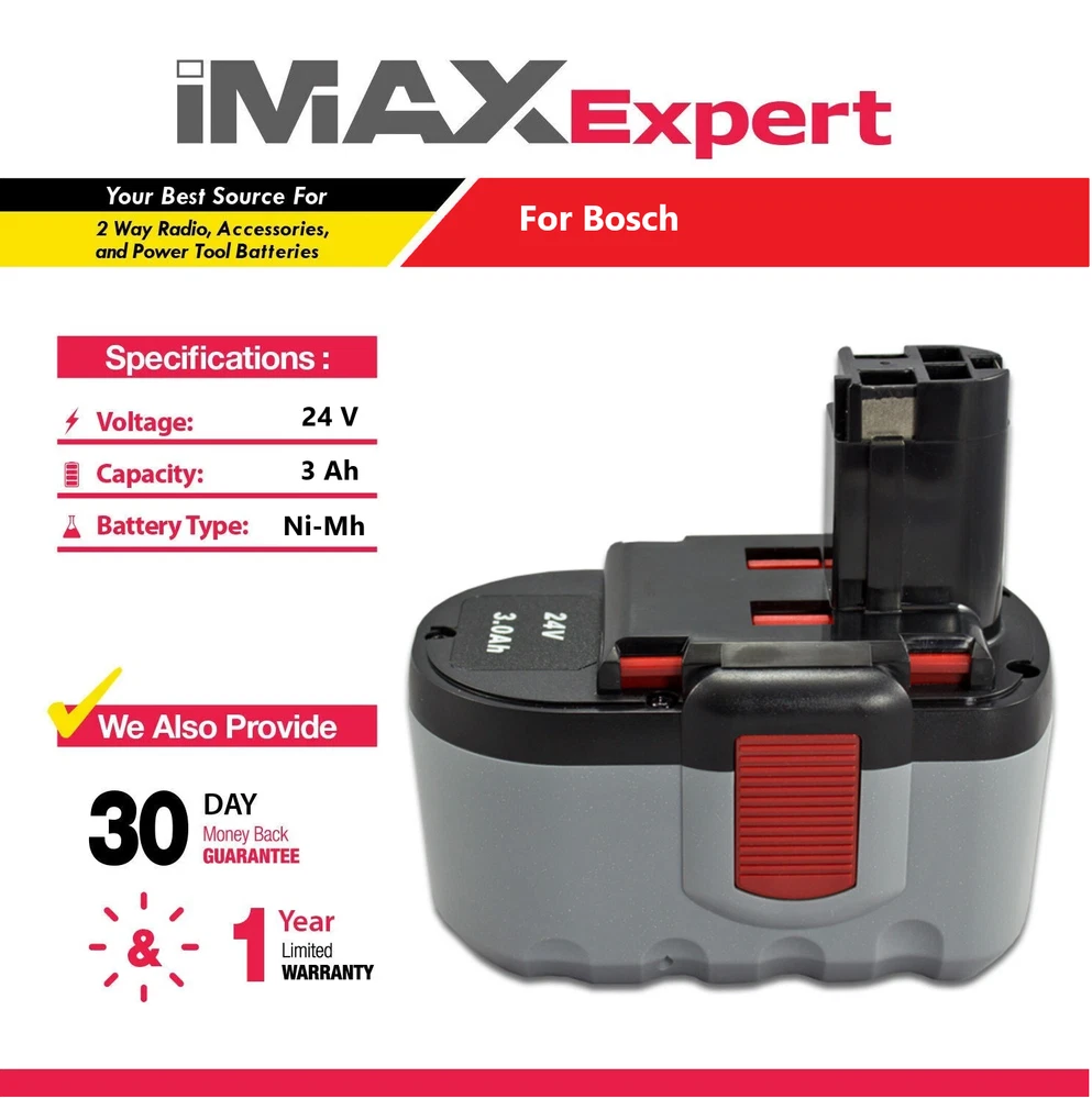 24V 3Ah NiMh Battery for Bosch BAT030 BAT031 BAT240 BAT299 Product Description Replacement Part#: Bosch 2 607 335 446, 2 607 335 268, 2 607 335 279,2 607 335 280, 2 607 335 445, 2 607 335 446,2 607 335 448, 2 607 335 509, 2 607 335 510,2 607 335 537, 2 607 335 538, 2 607 335 561,2 607 335 562, 2 607 335 637, 2 607 335 645, BAT030, BAT031, BAT240, BAT299 Compatible With: Bosch 24 Volt Cordless Drill Power Tools GBH 24V, GBH 24VF, GMC 24V, GKG 24V, GKS 24V, 11524, 125-2411524, 12524, 12524-03, 13624-2G, 13624, GLI 24V, GSA 24V, GSB 24VE, GSB 24VE-2, 1645, 1645-24, 1645B-24, 1645K-24, 1660, 1660K-24, GSR 24VE-2, GST 24V, SAW 24V, PSB 24VE-2, 3452, 3924, 3924-24, 3960, 52324, 52324B Specifications: Brand New | Ni-Mh | 24 Volts | 3000 mAh Our batteries are crafted using premium-grade materials to ensure durability and reliability. Rigorously tested to meet or surpass OEM specifications, they offer optimal performance and longevity. Equipped with built-in circuit protection, our batteries safeguard against overheating, short circuits, prolonged charging, and detect any potential damage, ensuring safety during use. Designed to be compatible with original OEM chargers supporting Ni-Mh chemistry, our batteries seamlessly integrate into your existing setup. Backed by a 1-year warranty, you can trust in the quality and longevity of our product. About us Shipping Warranty & Returns Payment Terms & Conditions Contact us About us Shipping Warranty & Returns Payment Terms & Conditions Contact us IMAX EXPERT is a proud A+ member of the Better Business Bureau Welcome to IMAX EXPERT. We are a reputable business in Southern California since 1987. With our experiences and relationship, we are able to offer quality products and competitive price to our customers. Please purchase with confidence. We carry the most variety of new replacement batteries, chargers, headsets, earpieces, speaker microphones, and accessories for Two-Way Radio, Ham Radio, Portable Radio; and new replacement batteries and chargers for Power Tool, Cordless Drill, Grease Guns, and etc. IMAX EXPERT is your TRUE Professional Power Tool Battery Store Not Copy Cat. No Fake Warranty, No Fishy ID Change History, Real Operation in the USA. TRUE 5 STAR RATING, Industrial Suppliers' favorite source. IMAX EXPERT has been in business for more than 20 years. Your Warranty is secured and guaranteed! Why purchase from us? IMAX EXPERT offers the most varieties of high-quality aftermarket two-way radio/ ham radio batteries that meet your budget and need. We guarantee to provide brand new high-quality replacement batteries with REAL SPECIFICATIONS, e.g. Capacity Rating (AH or mAh) and Type (Ni-Cd, Ni-Mh, or Li-Ion) Our aggressive pricing allows us to distribute only the freshest batteries ensuring you receive the best performing batteries available. We continually strive to update and improve our product line. If there is anything that you are trying to find, or if you need help to find the right radio replacement accessories, please feel free to contact us. ("Ask a question" located on the bottom of our eBay listing) We refresh our battery inventories every month. Our aggressive pricing allows us to distribute only the freshest batteries ensuring you receive the best performing batteries available. All brands, trademarks, and registered trademarks are the property of their respective holders. We use USPS, FedEx, and UPS as our regular forwarder. Orders will be shipped within the same day or 2 working days after the payment is received. Order placed on the weekends will be shipped out on the following Monday or Tuesday (holiday excluded). All products are shipped from California, USA Local pickup is not available. We regret that we can not be responsible for any wrong or undeliverable addresses. For order shipped to California address, we are required to collect CA sales tax. We ship to APO, FPO, AK, HI, PR with the same domestic shipping rate via USPS mail only. We guarantee against any defective products. A full refund can be provided for any defective or misrepresented products within 30 days. There is no restocking fee in this case. We provide 30 days money back on non-defective, undamaged, unused and resalable products. Customer will be responsible for the return shipping if product is not defective or misrepresented. Restocking fee and other fee may apply upon the condition of returned products. Shipping and handling fees are non-refundable. Product is not eligible for refund after the 30-day refund period has expired. Each product carries limited replacement warranty period stated in each listing's item description. All returned products (Replace or Refund) have to obtain a RMA # (Return Merchandise Authorization #) prior to return. Any returned product without a RMA # on package will not be processed. To obtain a RMA #, please contact us through eBay message system with your eBay user ID, eBay item ID #, and a brief description about your item condition and/or service requested. We will work on resolving your particular case ASAP. The warranty does not cover damage caused by accident, abuse, neglect, modification, alteration, misuse, repair, modification or physical damages. All NON-SELLER mistake's / returns are subject to a minimum of 20% restocking fee and the buyer is responsible for all return shipping expenses. Items that have been forwarded outside of the U.S will not be covered by our warranty Warranty will be provided to the original purchaser only. The warranty will not renew once a replacement has been made. This means that a warranty replacement item will not have a brand new warranty period. Please allow us to resolve any possible case. Our greatest mission is to provide the best customer service. VISA / MATERCARD / AMEX / DISCOVER (U.S. Credit Card Only) If card's registered billing address is not in U.S., please use PayPal as payment gateway. Purchase multiple listings? Simply commit to buy all items, and process the payment from 