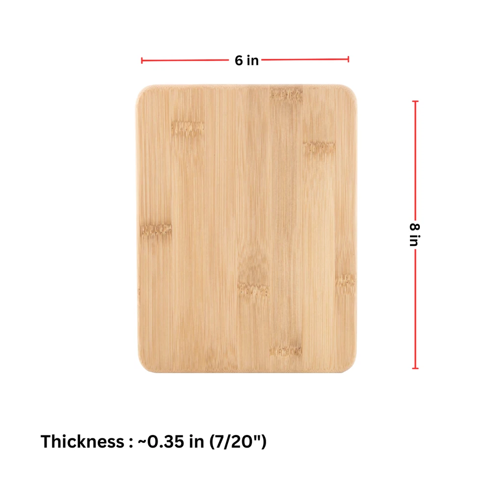 Plain Bamboo 8X6" cutting board / 0.35" thick Premium Bamboo Cheese Board measure approximately 8" x 6" x 0.35" - 24 Pieces 【 Creative Board 】 This 8x6 set includes 24 pieces without handles. The 8x6 bulk set is ideal for newcomers to engraving who want to gauge market interest. This sample set will greatly assist in fulfilling your business's needs. Unleash your creativity with our durable bamboo boards! 【 Bulk Value 】 Buying our blank bamboo boards in bulk will save you tons of money in the long run. The individual price of our bamboo boards is significantly lower than buying them individually, as we offer them at a discounted rate in bulk. Be kind to your wallet by purchasing our bamboo boards in bulk! 【 Easy to Handle 】 Our bamboo boards are crafted from renewable, natural bamboo of exceptional quality. Known for their sturdiness and porosity, akin to wood but with greater durability, these boards are effortless to clean and maintain. Unlike other options, they require minimal upkeep, with regular washing being sufficient. For extended longevity, a simple application of mineral oil post-use is recommended. 【 Versatile Board 】 This versatile mini board offers an individual surface area for serving a variety of foods such as cheese, bread, and fruit. Its reversible design allows for convenient use with different types of food. Crafted from bamboo, these cutting boards boast moisture resistance and exceptional durability. Moreover, they are gentle on knives, ensuring they stay sharp for longer periods. 【 Great Application 】 This adaptable chopping board is ideal for a multitude of uses, including laser engraving customization, corporate gifting, and food preparation. It's not just a practical tool; it's also a vessel for preserving family traditions. So as you use it for various purposes, remember to also cherish and preserve those cherished family recipes, especially those passed down from generation to generation.