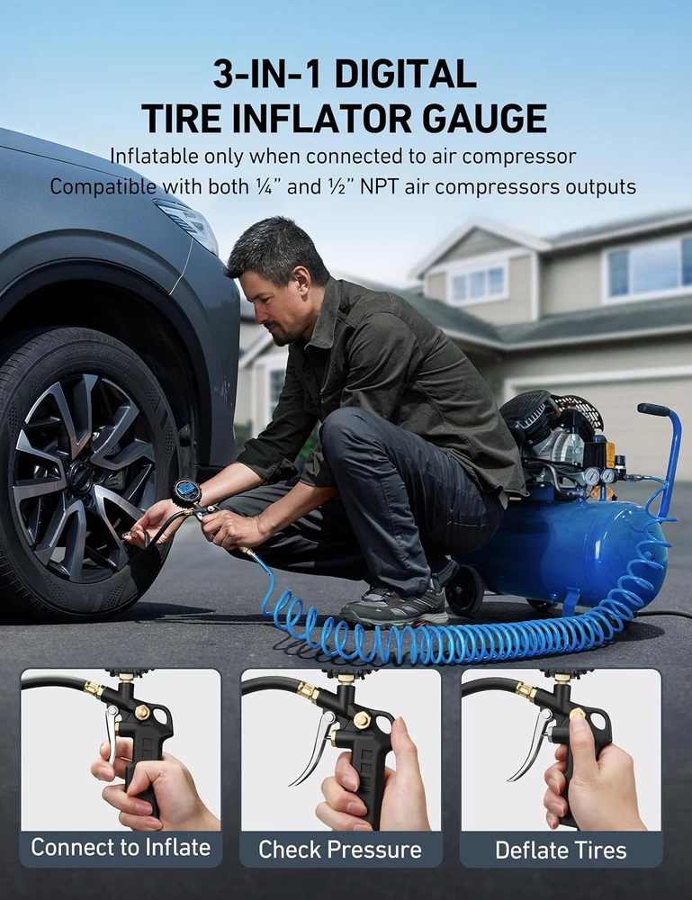 Store New Arrivals Add to Favorite View Feedback Contact Digital Tire Pressure Gauge with Inflator, 250 PSI Air Chuck & Compressor Accessories Heavy Duty with Quick Connect Coupler, 0.1 Display Resolution, Car Accessories, 1Pack Description Item model number 250PSI-M Item dimensions L x W x H 4.96 x 1.06 x 1.5 inches Number of Items 1 Product Dimensions 4.96 x 1.06 x 1.5 inches; 10.56 ounces Material Stainless Steel, Brass Country of Origin China Item Weight 0.66 Pounds Batteries 2 AAA batteries required. (included) Is Discontinued By Manufacturer No ADVANCED ACCURACY: Professionally calibrated to always return an accurate reading within 1% of the exact pressure of your tire. No more guessing! Accurately measures in a range from 0-250 PSI (0-17.2 Bar; 0-1724 Kpa; 0-17.5 kg/cm^2). Stocking Stuffers for Men. INCREASED SAFETY: Properly inflated tires provide better performance in all weather conditions, decrease the likelihood of flats, explosions, and crashes; Increase your MPG, save money on fuel/tire wear, and drive safer. ALL-IN-ONE FEATURES: AstroAI tire pressure gauge Includes an inflator, straight locking chuck, gauge, hose, and bleed valve, all in one unit with function of deflation, inflation, tire pressure check. COMPATIBLE WITH both ¼” and ½” NPT air compressors outputs. SUPERIOR CONSTRUCTION: Made with heavy-duty stainless steel and high-quality brass components, our inflator delivers lasting reliability and performance. Its leak-proof lock-on chuck allows the inflator to handle pressure from cars, trucks, motorcycles, SUVs, off-road vehicles, RVs, trailers, and more. BATTERY SAVER: Automatically turns on when pressurized air is detected and turns off after 20 seconds of inactivity. Product Description Accurate reading within 1% of the exact pressure of your tire and display to a 0.1 resolution. Fill a tire twice as quickly or even faster. Just hold down the handle and to inflate. The built-in bleeder valve can quickly decrease pressure in overinflated tires. 1 Check Pressure 2 Inflate Tires 3 Deflate Tires Digital Tire Inflator AstroAI Tire Inflator 0-250 PSI Range 0-250 PSI 1% Accuracy 1% 2 x AAA batteries Power supply 2 x AAA batteries LED backlit screen Dial Type LED backlit screen Cars, RV, SUV etc Compatible With Cars, RV, SUV etc 0-250 PSI Range 0-100 PSI 1% Accuracy 2% Grade B40.1 2 x AAA batteries Power supply Power Free LED backlit screen Dial Type 2.5‘’ Glow Dial Cars, RV, SUV etc Compatible With Cars, RV, SUV etc 0-250 PSI Range 0-250 PSI 1% Accuracy 1% 2 x AAA batteries Power supply 2 x AAA batteries LED backlit screen Dial Type Color LED screen Cars, RV, SUV etc Compatible With TruckCars, RV, SUV Digital Tire Inflator Digital Tire Inflator Digital Tire Inflator ABOUT US We offer the best prices around on high quality products. Our E-store includes media such as books, movies, music and games while offering electronics, toys, sporting apparel, clothing, tools, general home, garden items and more. SHIPPING We are always working hard to ensure your package arrives as soon as possible. Please understand that some factors like weather, high postal traffic, and the performance of shipping companies are outside of our control. We offer free shipping to the lower 48 states and ship within 2 business days of payment, usually sooner. We do not accept P.O. Boxes. Please provide a physical address. RETURNS We offer a 30-Day Return Policy on items which you are not completely satisfied with. You have the option for a full-refund or an exchange of the item. No returns are available on items shipped outside of the USA. PAYMENT We accept PayPal. CONTACT US This page content is yet to come Please ad us to your favorite seller and visit again later Thank You CUSTOMER SATISFACTION We try our very best to make sure every customer is completely satisfied. If there's a problem, message us! We're happy to help.