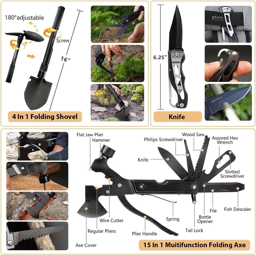 Material Nylon, Aluminum, Plastic Included Components 250Pcs Survival Gear Number of Pieces 250 About this item [250 in 1 Survival Kit]: Having an emergency kit is an important step to prepare and protect your and household for some unforeseen events. This emergency survival kit is specifically designed and curated by 3 survival experts, includes total 250pcs multipurpose survival tools. It contains the most popular survival gear and tools, also a first aid kit that enough to treat a family or a group of friends under emergency circumstances. [Basic First Aid Kit]: Designed to stow conspicuously, the included first aid supplies are packed in a extra bright red bag. It includes essential items such as tweezers, scissors and pins, would pad, bandage triangulaire, tournquet, cotton buds, a generous supply of bandages etc. Perfect for taking care of any medical or emergency needs during outdoor wilderness adventures or disaster. [Portable Molle System Compatible Bag]: The 2022 upgraded emt bag was made of military grade water-resistant 1000D nylon with a size of 8” x 6.5” x 6''. You can attach it to other molle compatible backpack or combat vest or belt by using its back attachment straps or removal velcro panel. Great gift idea for men women or people who loves hiking, hunting, camping, car travel, wilderness adventure. [2022 Upgraded Version]: Nobody can count on friendly weather during an emergency. This kit can help you to deal with the worst. It is the most multifultional survival kit in the market, contains multifultional axe, f0lding shovel, parachute cord, knife, emergency tent and blanket, whistle, compass, and fire starter, lantern, raincoat. It could assist you in creating a makeshift shelter, provide additional security and warmth, retain body heat. [Must Have Survival Gear]: All of the items have been tested to ensure they can withstand even the toughest emergencies and conditions, such as outdoor adventure, hunting, camping, hiking, travel, natural disasters such as earthquake, tornado, flood. If you have any questions, please don’t hesitate to reach out to us so we can get you taken care of in 24hours. Item Package Dimensions L x W x H 10 x 9.21 x 6.85 inches Package Weight 1.96 Kilograms Color D-Green Material Nylon, Aluminum, Plastic Model Year 2024 Included Components 250Pcs Survival Gear