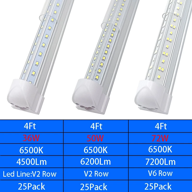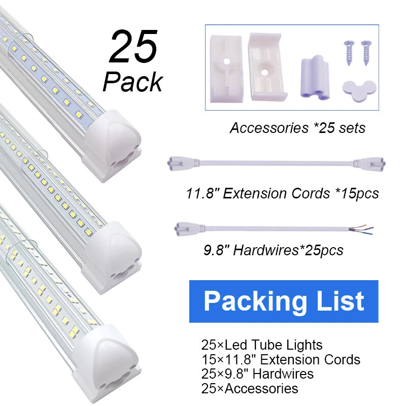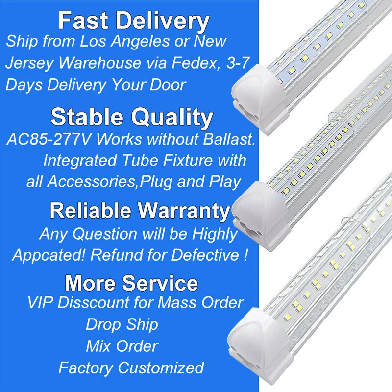 【SCIENTIFIC DESIGN】 - 2FT 3FT 4FT 5FT 6FT 8FT LED Shop Lights Fixture is Made of 6500K Cold White SMD2835 LED Chip ,Plastic Clear Cover , Aluminum Bracket Housing ,and AC85-277V Constant Current Driver . It can work in -68F to 120F Temperature Conditions 【EASY INSTALLATION】 - The Integrated Tube Fixture Can be Install on Wall or Ceiling ,Easily Replace Traditional Fluorescent Tube Bulb . Plug and Play , Free Accessories (Hardwire , Connector , Extension Cords , Clip and Screw ) Come with Tube Lights Together 【WIDE APPLICATION】 - Linkable T8 4FT Led Shop Light Fixture 4Ft Led Tube Light Bulbs are Widely Used in Garage Ceiling , Barbershop , Schools, Hospitals Basement , Factory Warehouses , Supermarkets Cooler Door , Offices, Shops,Hotels, etc 25Pack 4Foot Led Tube Light 4Ft Led Garage Lights Fixture 72W 50W 36W Led Bulbs T8 4Ft Led Tube Light Fixture Specification: Type: Integrated 4Ft Led Shop Light Fixture LED Bulb Type: Tube Power: 36/50/72W Lumen: 4500lm/6200lm/7200lm LED Chip: SMD 2835 Length: 4FT/48Inch/48"/1.2Meter Cover: Clear Color Temperature: Cold White 6500K Voltage: AC85-277V V-Shaped Beam Angle: 270° Material: Aluminium+PC Cover Warranty: 3 Years 【SCIENTIFIC DESIGN】 - 2FT 3FT 4FT 5FT 6FT 8FT LED Shop Lights Fixture is Made of 6500K Cold White SMD2835 LED Chip ,Plastic Clear Cover , Aluminum Bracket Housing ,and AC85-277V Constant Current Driver . It can work in -68F to 120F Temperature Conditions 【EASY INSTALLATION】 - The Integrated Tube Fixture Can be Install on Wall or Ceiling ,Easily Replace Traditional Fluorescent Tube Bulb . Plug and Play , Free Accessories (Hardwire , Connector , Extension Cords , Clip and Screw ) Come with Tube Lights Together 【WIDE APPLICATION】 - Linkable T8 4FT Led Shop Light Fixture 4Ft Led Tube Light Bulbs are Widely Used in Garage Ceiling , Barbershop , Schools, Hospitals Basement , Factory Warehouses , Supermarkets Cooler Door , Offices, Shops,Hotels, etc 【 Wide Application 】4FT T8 LED Tube Lights , LED Bulb and LED Light Fixtures , T8 LED Bulb 4 Foot fitted to replace traditional T8 T10 T12 fluorescent bulbs. Widely used in Garage Ceiling, Barbershop, Schools, Hospitals Basement, Factory warehouses, supermarkets Cooler door, offices , convenience stores , gas stations , warehouse,parking lot,shops, hotels,Refrigerator,coolers or freezers illumination,etc Features 【FAST DELIVERY】 - Ship within 1 Working day from NJ or LA Warehouse via FedEx , 3-7 Days Delivered Your Door ,No Importing Duty. 【ENERGY SAVING】 - Our 4Ft LED Shop Light Fixture is Made of High Quality LED Chip,Plastic Clear Cover,Aluminum Bracket Housing and Constant Current Driver.It can work well in -68F to 120F temperature conditions. Save up to 50% on your electricity bill when replacing fluorescent tubes. 【EASY INSTALLATION】 - The Integrated Tube Fixture Can be Install on Wall or Ceiling ,Easily Replace Traditional Fluorescent Tube Bulb . Plug and Play , Free Accessories (Hardwire , Connector , Extension Cords , Clip and Screw ) Come with Tube Lights Together . 【3 Years WARRANTY】 - Any of your questions or inquiries will get our prompt attention and we will reply you within 24 Hours. Replacement or Refund will be supported. 【VIP GET MORE DISCOUNT】 - Buy bulk, Please do not hesitate to contact us to get VIP price,as a 10years+ Professional Manufacturer of LED tube lights,we provide supportive prices and services for retailers and wholesalers in a long-term. Welcome to Contact Us for Bulk Order! Payment Delivery details Terms of sales About us Contact us Payment We can accept many payment methods! Delivery details Shippment will be made from Our US Local Warehouse (New Jersey & Los Angeles )through FEDEX, UPS, USPS Mail or else depending on the model and weight. Terms of sales All of our products are 100% brand new. Please inspect your order upon arrival. Item may be return within the return period. It must be returned in its original and unused condition. Goods must also be in its original box and packing. Do not dispose of the box or any packaging materials until you are satisfied with the product. If you have any questions or defectives, please email us, we will reply within 24-48hours. About us We are a high-tech enterprise which is specialized in development, production and marketing of indoor and outdoor LED lighting products. Our main products include 2FT 3FT 4FT 5FT 6FT 8FT LED Tube Light Bulbs (Integrated Base, FA8 Base, R17D HO Base ,G13 Bi-Pin Base) UFO High Bay Led Lights Led Light Up Ice Cubes For Drinks Led Strip Lights and Aluminum Channels Led Light Accessories Parts like Power Corder, Extension Cords and Power Supply Our products have been highly approved by customers from Europe, North America, and Australia for its excellent quality. Contact us Our Office Working Hours Are: 9:00 a.m. to 6:00 p.m. (GMT+8) of Monday to Friday. Closed on Weekend and public holidays (China). Except the weekend and Holiday Time,we will reply any of your inquiries with 24hours. Features Energy Saving Wide Beam V Shaped Type T8 4FT Led Shop Light Fixture Bulb Shape Code T8 Connectors Integrated Lighting Technology LED Item Length 4FT Bulb Shape Tube Bulb Wattage 36W 50W 72W Lumens 4500lm 6200lm 7200lm Color Temperature 6500 K+ Ultra Daylight Light Color Cold White Beam Angle 270° Voltage 85-277V Finish Clear Output Voltage 85-277V Indoor/Outdoor Indoor Material Aluminum LED Chip Code 2835 Number of Bulbs 384 MPN Does Not Apply Manufacturer Warranty 3 years Energy Star A+++ ( 一 ) EC Range A+++ - G Bulb Life Hours 50000 Hours Labels & Certifications Energy Efficient ( 高效节能 ) Energy Saving Brand CAIKAG Country/Region of Manufacture China Product Line T8 Integrated Unit Quantity 25 Unit Type Unit
