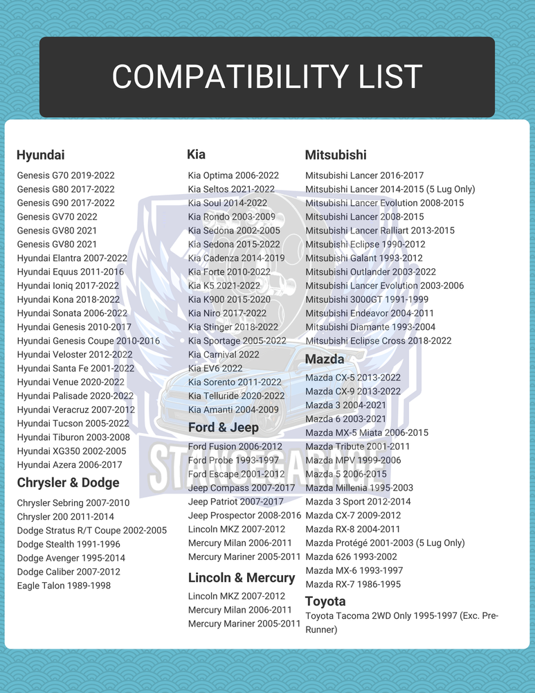 Adapter Width: 25mm each side Quantity: 2 Pieces Bolt Pattern: 5x114.3 to 5x114.3 (Equivalent to 5x4.5" inch) Center Bore: 67.1mm(Hub) to 56.1 Wheel (Allowing your vehicle to use wheels with smaller center bore. You can also use hub ring to keep wheels in centric state. For example 56.1 to 60.1 hub rings) Thread Pitch: 12x1.5 Adapter Type: Hub Centric w/Hub Lip This adapter set includes open end lug nuts to secure the adapters onto your factory hubs Your Factory wheel studs may extend past the surface of the wheel adapters. In this case you will need to: 1. Fine-Tuning Stud Length: Modify the existing factory studs to the appropriate size, if necessary, to ensure a perfect fit with the added accessories. 2. Inspection for Adequate Wheel Clearance: Prioritize checking that your wheels have the required intervals or voids between each bolt hole to facilitate spacer use. 3. Opting for Compact Stud Solutions: In cases where it’s beneficial, make the transition to a custom shorter stud set, designed to supplant the standard factory studs, enhancing overall compatibility.