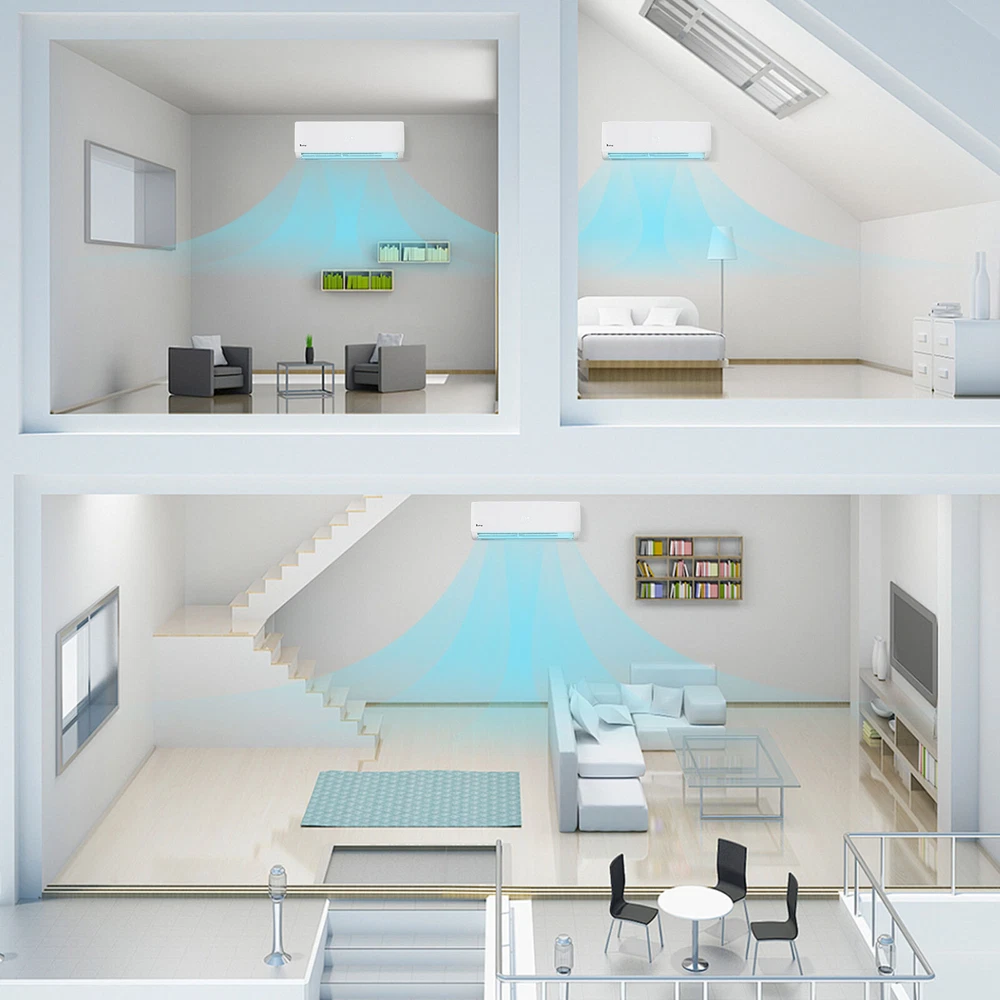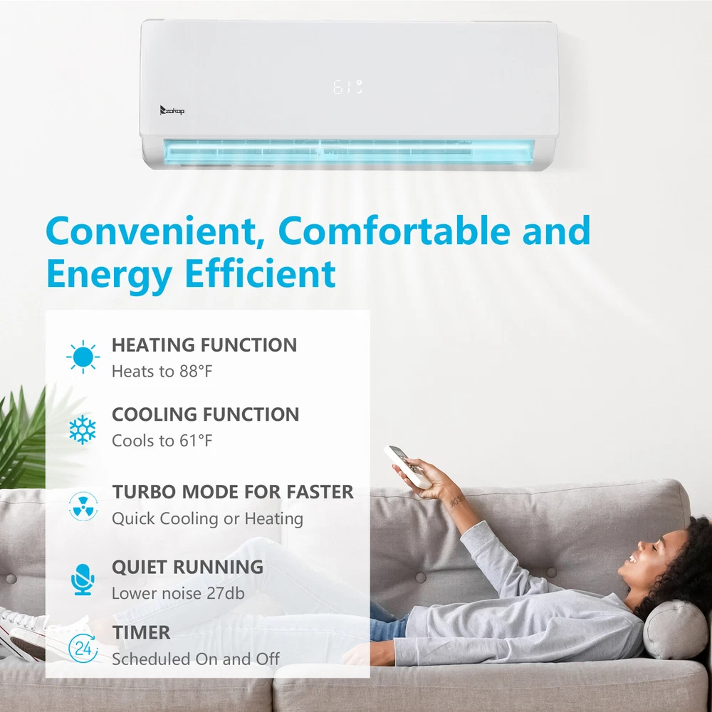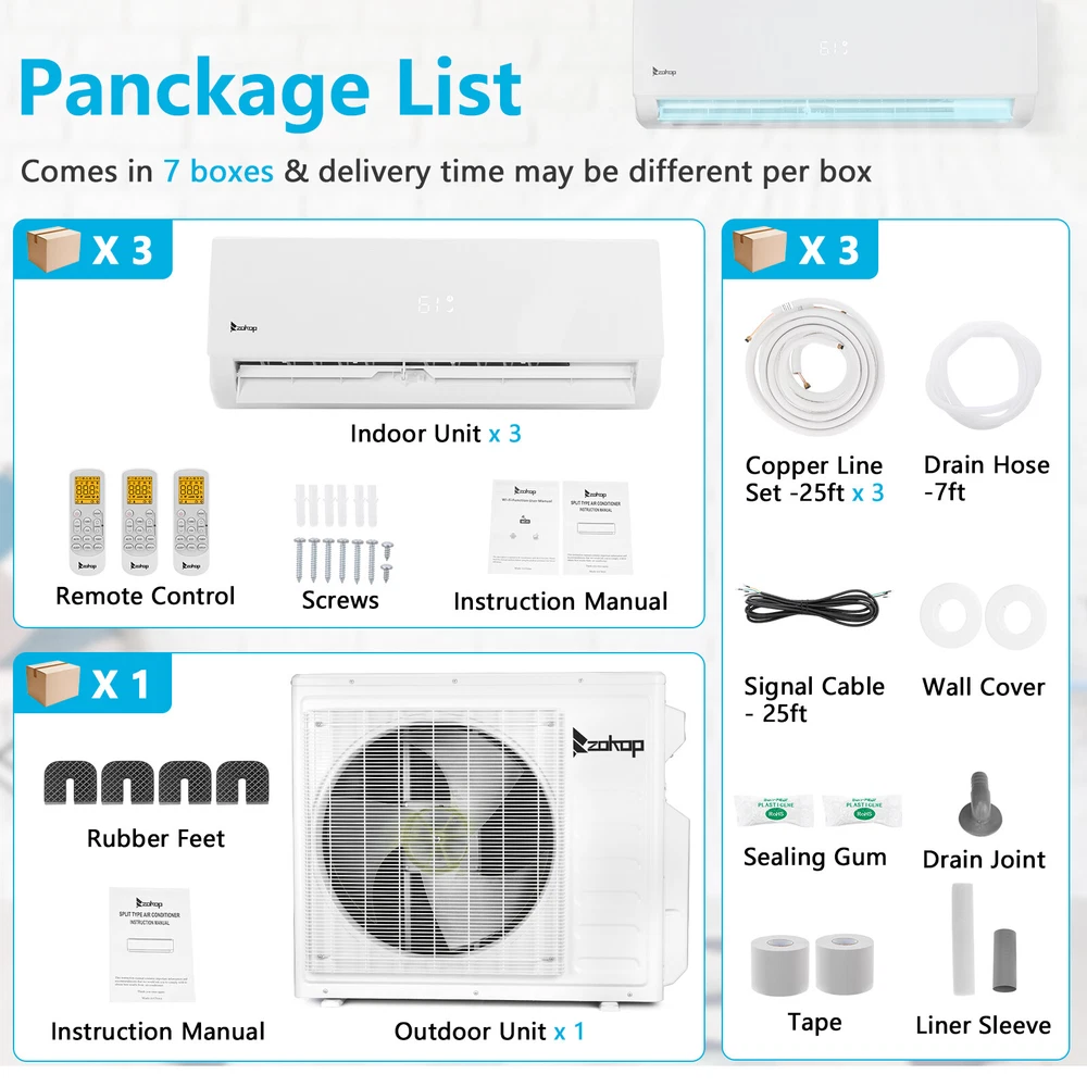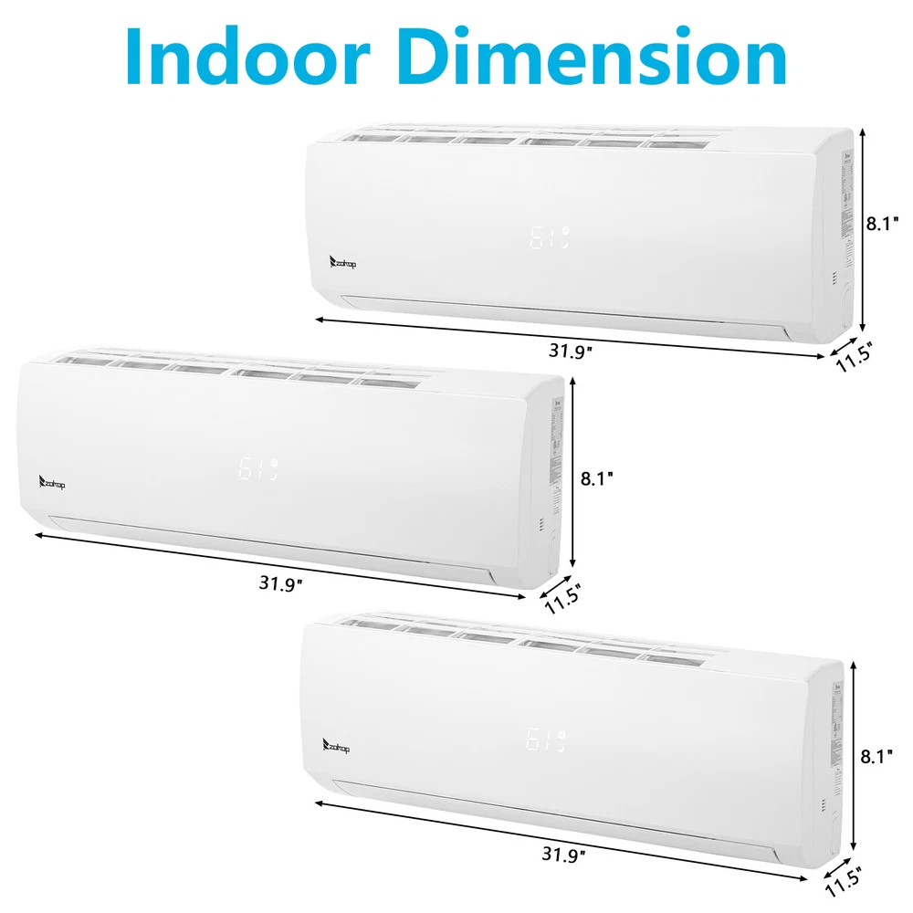 listing template VISIT OUR STORE SIGH UP FOR EMAIL 27000 BTU 4-in-1 Tri Zone Ductless Mini Split Air Conditioner Inverter Heat WIFI ZOKOP Tri 3 Zone Ductless Mini Split Air Conditioner Heat Pump System, 19 SEER2 Ductless AC with 3 Indoor Air Handlers, 1 Outdoor Condenser, 25ft Installation Kit (9K+9K+12K) Introductions : ZOKOP smart Split Type Type Inverter Air Conditioners with heating function are made with high quality compressor, high speed pure copper motor & inner spiral copper tube which are powerful to quickly cool down / warm your home, office, garage or apartment for maximum comfort in quiet operation, perfect appliance in hot Summer or cold Winter. Comparing with others, machine featured with high SEER grade, which means that it is more energy efficient and much money saving! This unit also has Sleep, Turbo, ECO, Mute and Timer functions. These functions help you enjoy the true individual comfort. Let the ZOKOP Mini Split Air Conditioner 3-Zone be the solution to your home's heating and cooling needs. Features: [MULTIPLE ROOMS] Comes with 3 indoor air handlers 9,000 BTU +9,000BTU+ 12,000 BTU with separate controller for individual rooms and 1 outdoor condenser. Enjoy individual temperature controls in each room for ideal climate control. This unit provides cooling and heating for up to 1350Sq. Ft (2 indoor unit recommended area 400 Sq. Ft, another one 550 Sq. Ft) and able to work in environments as low as 5 degrees Fahrenheit. 3pcs 24.6ft copper pipes (Standard size 1/4" & 3/8" outer dimension) and 3 installation kits included. The length for drain pipe is 78.7". Featured with Cooling, Heating, Dehumidifying and Fan only modes in one compact unit. It is ideal for using in home's bedroom, living roo, kitchen, office, apartment, garage and so on. [Energy Saving] ZOKOP the speed of the air conditioner equipped with frequency converter directly affects the service efficiency of the air conditioner. The frequency converter is a control system used to control & adjust the speed of the compressor to make it always in the best speed state, so as to improve the energy efficiency ratio (at least 30% more energy-saving than the conventional air conditioner). This 19 SEER2, 9,000 BTU +9,000BTU+ 12,000 BTU,208/230V~60Hz, AHRI Certified AC unit with a heat pump(up to 5℉/-15℃) is featured high quality compressor for more efficient cooling and longer working life; Higher SEER grade & Eco-friendly design which leads you for money saving ( please confirm voltage before making purchase) . [Quiet Cooler & Heater] Ultra Silent at only 27-42 dB(A) and beautifully built adds a touch of elegant charm to your room.In sleeping & mute mode, It's able to maintain the temperature while you are sleeping. And you can use the 24-hour timer in combination to free you from additional worries. Featured with 4-way swing function, unit provides scientific airflow in your room to suit your comforts in just a few minutes.Best choice to decorate your home. [Smart Operation] Operating this conditioner is an easy-understanding and enjoyable cooling experience (61-88degree Fahrenheit ). We can set all functions on remote control (Fan Speed Selection, Sleep Mode, 24 Hour Timer, ECO Mode, Turbo Mode, and Mute Mode). Built-in microprocessor chip & sensor in the remote controller makes it more convenient to operate the air conditioner from a distance. Digital LED display controls offer precise temperature adjustments and the remote control lets you control the air conditioner from across the room. [Washable Air Filter] This indoor AC machine comes with a permanently washable and easy cleaning air filter. Keep your air conditioner running more efficiently by cleaning the filter once a month. Specifications : 3*I ndoo r Unit: 1. Color: White 2. Power Supply: 208/230V, 60Hz 3. Cooling : Rated Capacity: 9000Btu/h, 12000Btu/h Rated SEER2: 19Btu/W.h Rated EER2: 10Btu/W.h 4. Heating: Rated Capacity: 10000Btu/h, 12200Btu/h HSPF2 Rating (Region IV): 8.5Btu/W.h 5. Operation temperature: (16~31)degree Celsius/(61~88)degree Fahrenheit 6. Use the air conditioner in the following temperature conditions: Indoor(cooling/heating): 17 ~32degree Celsius(63 ~90degree Fahrenheit)/0 ~27degree Celsius(32 ~80degree Fahrenheit) Outdoor(cooling/heating): 15 ~55degree Celsius(59 ~131degree Fahrenheit)/-15 ~24degree Celsius(5 ~75 degree Fahrenheit) 7. Moisture removal: 1.1L/h, 6L/h 8. Indoor air circulation/Hi : 600m³/h, 650m³/h 9. Indoor noise level at cooling(Turbo/High/Med./Low/Mute): 42/39/34/29/27dB(A) 10. Application Area: 9000BTU Up to 400 sq.ft, 12000BTU Up to 550 sq.ft 11. Certificate : AHRI, ETL 12. Indoor Dimensions: 81.1x29.2x20.5cm(31.9x11.5x8.1inch) 13. Indoor Package dimensions: 88.5x36.6x27.8cm(34.8x14.4x10.9inch) 14. Indoor Net weight: 9.5kg/20.9Ibs 15. Indoor Gross weight: 12.7kg/28Ibs 1* Outdoor Unit: 1. Cooling Capacity: 27000BTU/h 2. Heating Capacity: 27000BTU/h 3. SEER2: 19.0BTU/h.W 4. Rated Voltage: 208/230V~60Hz 5. Refrigerant type: R410A/2200g/77.6 ozs 6. Outdoor Dimensions: 90x36x80.5cm(35.43x14.17x31.69inch) 7. Outdoor Package dimensions: 102.8×47.5×86.5cm(40.47x18.7x34.06inch) 8. Outdoor Net weight: 56kg/123.5lbs 9. Outdoor Gross weight: 60.5kg/133.4lbs 3*Copper pipes : 1. Connecting Pipe:Gas 3/8''-24.6FT/7.5M Liquid 1/4''-24.6FT/7.5M 2. Signal Cable Length: 24.6FT/7.5M 3. Drain Hose:6.6FT/2M Package Includes : 3* Indoor box includes : 1 x Indoor Unit 1 x Remote Control 1 x Screw Pack 1* Outdoor box includes: 1 x Outdoor Unit 4 x outdoor feet rubber 3*Copper pipes box includes: 1 x Copper pipes set(24.6FT) 1 x Signal Cable(24.6FT/7.5M) 1 x Drain pipe(6.6FT) 1 x Drain pipe adapter 2 x Sealant 2 x Wall sleeve cover 2 x Pipe tape 1 x Insulation pipe 1 x Wall sleeve You might like this more>> Portable Princess Castle Play House Blue Large Kids Play Tent $23.79 Double Shoe Rack Closet Shelf Storage Organizer $19.49 Oil Painting Easel Sketch Box Portable Folding $57.49 FCH L-Shaped Corner Computer Desk Home Office Desk $