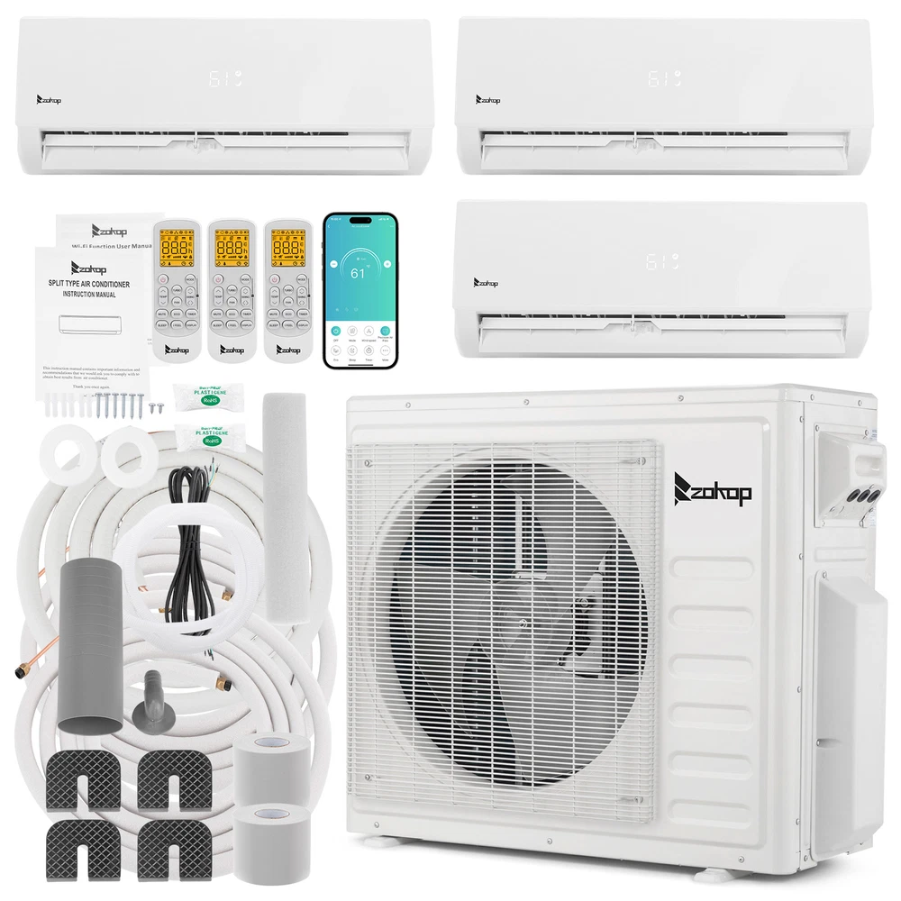 listing template VISIT OUR STORE SIGH UP FOR EMAIL 27000 BTU Wifi Tri Zone Split Heat Pump Air Conditioner (9000 + 9000+12000 BTU) ZOKOP 3 Zone Ductless Mini Split Air Conditioner Heat Pump System, 20 SEER2+21 SEER2 Ductless AC with 3 Indoor Air Handlers, 1 Outdoor Condenser, 25ft Installation Kit (9K+9K+12K) Introductions : ZOKOP smart Split Type Type Inverter Air Conditioners with heating function are made with high quality compressor, high speed pure copper motor & inner spiral copper tube which are powerful to quickly cool down / warm your home, office, garage or apartment for maximum comfort in quiet operation, perfect appliance in hot Summer or cold Winter. Comparing with others, machine featured with high SEER grade, which means that it is more energy efficient and much money saving! This unit also has Sleep, Turbo, ECO, Mute and Timer functions. These functions help you enjoy the true individual comfort. Let the ZOKOP Mini Split Air Conditioner 3-Zone be the solution to your home's heating and cooling needs. Features: 1. [MULTIPLE ROOMS] Comes with 3 indoor air handlers 9,000 BTU+9000BTU+12,000 BTU with separate controller for individual rooms and 1 outdoor condenser. Enjoy individual temperature controls in each room for ideal climate control. This unit provides cooling and heating for up to 1350Sq. Ft ( 2 indoor unit recommended area 400 Sq. Ft., another one 550 Sq. Ft. ) and able to work in environments as low as 5 degrees Fahrenheit. 3 pcs 24.6ft copper pipes (Standard size 1/4" & 3/8" outer dimension) and 4 installation kits included. The length for drain pipe is 78.7". Featured with Cooling, Heating, Dehumidifying and Fan only modes in one compact unit. It is ideal for using in home's bedroom, living roo, kitchen, office, apartment, garage and so on. 2. [Energy Saving] ZOKOP the speed of the air conditioner equipped with frequency converter directly affects the service efficiency of the air conditioner. The frequency converter is a control system used to control & adjust the speed of the compressor to make it always in the best speed state, so as to improve the energy efficiency ratio (at least 35% more energy-saving than the conventional air conditioner). This 20 SEER2 9000BTU+ 9000BTU + 21 SEER2 12000BTU, 208/230V~60Hz, AHRI Certified AC unit with a heat pump(up to 5℉/-15℃) is featured high quality compressor for more efficient cooling and longer working life; Higher SEER grade & Eco-friendly design which leads you for money saving ( please confirm voltage before making purchase) . 3. [Quiet Cooler & Heater] Ultra Silent at only 29-43 dB(A) and beautifully built adds a touch of elegant charm to your room. In sleeping & mute mode, It's able to maintain the temperature while you are sleeping. And you can use the 24-hour timer in combination to free you from additional worries. Featured with 4-way swing function, unit provides scientific airflow in your room to suit your comforts in just a few minutes. Best choice to decorate your home. 4. [Smart Operation] Operating this conditioner is an easy-understanding and enjoyable cooling experience (61-88degree Fahrenheit ). We can set all functions on remote control (Fan Speed Selection, Sleep Mode, 24 Hour Timer, ECO Mode, Turbo Mode, and Mute Mode). Built-in microprocessor chip & sensor in the remote controller makes it more convenient to operate the air conditioner from a distance. Digital LED display controls offer precise temperature adjustments and the remote control lets you control the air conditioner from across the room. 5. [Washable Air Filter] This indoor AC machine comes with a permanently washable and easy cleaning air filter. Keep your air conditioner running more efficiently by cleaning the filter once a month. Specifications: 3*Indoor Unit : 1. Color: White 2. Power Supply: 208/230V, 60Hz 3. Cooling : Rated Capacity: 9000Btu/h, 12000Btu/h Rated SEER2: 20 Btu/W.h, 21 Btu/W.h Rated EER2: 10Btu/W.h, 9.5Btu/W.h 4. Heating: Rated Capacity: 10000Btu/h, 12600Btu/h HSPF2 Rating (Region IV): 8.5Btu/W.h, 8.2Btu/W.h 5. Operation temperature: (16~31)degree Celsius/(61~88)degree Fahrenheit 6. Use the air conditioner in the following temperature conditions: Indoor(cooling/heating): 17 ~32degree Celsius(63 ~90degree Fahrenheit)/0 ~27degree Celsius(32 ~80degree Fahrenheit) Outdoor(cooling/heating): 15 ~55degree Celsius(59 ~131degree Fahrenheit)/-15 ~24degree Celsius(5 ~75 degree Fahrenheit) 7. Moisture removal: 1.1L/h, 1.6L/h 8. Indoor air circulation/Hi : 580/520/460m³/h, 520/450/380m³/h 9. Indoor noise level at cooling (Turbo/High/Med./Low/Mute): 43/41/36/31/29dB(A), 45/42/35/30/28dB(A) 10. Application Area: 9000BTU Up to 400 sq.ft, 12000BTU Up to 550 sq.ft 11. Certificate : AHRI, ETL 12. Indoor Dimensions: 81.1x29.2x20.5cm(31.9x11.5x8.1inch) 13. Indoor Package dimensions: 88.5x36.6x27.8cm(34.8x14.4x10.9inch) 14. Indoor Net weight: 9kg/19.8Ibs 15. Indoor Gross weight: 12kg/26.5Ibs 1* Outdoor Unit : 1. Cooling Capacity: 28000BTU/h 2. Heating Capacity: 28000BTU/h 3. SEER2: 20.0BTU/h.W 4. Rated Voltage: 208/230V~60Hz 5. Refrigerant type: R454B/2200g/77.66ozs 6. Outdoor Dimensions: 97.8x42.1x80.3cm(38.5x16.57x31.61inch) 7. Outdoor Package dimensions: 102.2×48×83.5cm(40.27x18.9x32.96inch) 8. Outdoor Net weight: 54kg/119lbs 9. Outdoor Gross weight: 68kg/127.9lbs 4*Copper pipes : 1. Connecting Pipe:Gas 3/8''-24.6FT/7.5M Liquid 1/4''-24.6FT/7.5M 2. Signal Cable Length: 24.6FT/7.5M 3. Drain Hose:6.6FT/2M Package Includes: 3*Indoor box includes: 1 x Indoor Unit 1 x Remote Control 1 x Screw Pack 1*Outdoor box includes: 1 x Outdoor Unit 3*Copper pipes box includes: 1 x Copper pipes set(24.6FT) 1 x Signal Cable(24.6FT/7.5M) 1 x Drain pipe(6.6FT) 1 x Drain pipe adapter 2 x Sealant 2 x Wall sleeve cover 2 x Pipe tape 1 x Insulation pipe 1 x Wall sleeve You might like this more>> Set of 10 Plastic Folding Chairs Wedding Party Event Chair $135.99 Makeup Case Cosmetics Organizer 2 Small & 5 Large $23.65 12-Batten 4 Tier Storage Organizer 