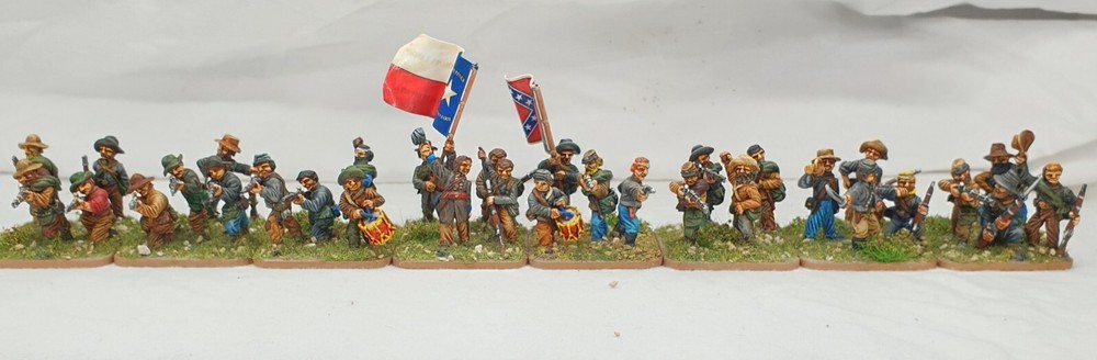 As per the photo a well painted unit of Confederate Infantry of the 1st Texas Regiment of the CSA. There are 32 figures based in fours on 40x40 mm bases. All figures finished to a high standard and have 3 coats of varnish. All figures are Dixons metal minis.