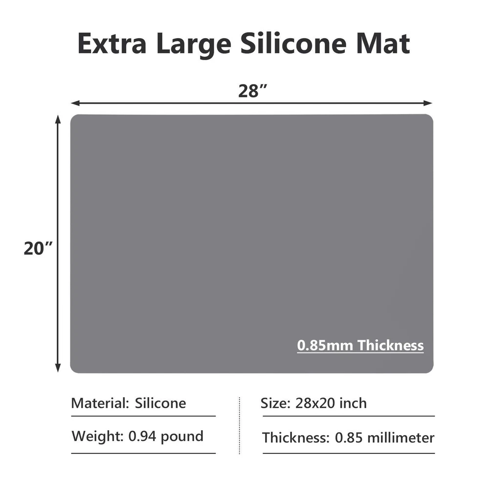 Brand: Extra Large Silicone Mats Item Weight: 28x20 Inch Extra Large Silicone Mat Item Length: 28x20 Inch Extra Large Silicone Mat Color: Dark Gray MPN: Does not apply Department: for Countertop Size: XL-28" x 20"x 0.03" Formulation: 28x20 Inch Extra Large Silicone Mat Item Width: 28x20 Inch Extra Large Silicone Mat Item Condition: New Weight: 1.01 Pounds Item Height: 28x20 Inch Extra Large Silicone Mat Material: Silicone UPC: Does not apply Model: Does not apply Expiration Day: Depends from lot Type: 28x20 Inch Extra Large Silicone Mat Package Dimensions LxWxH: 10.39x9.41x0.63 Inches gtin13: Does not apply