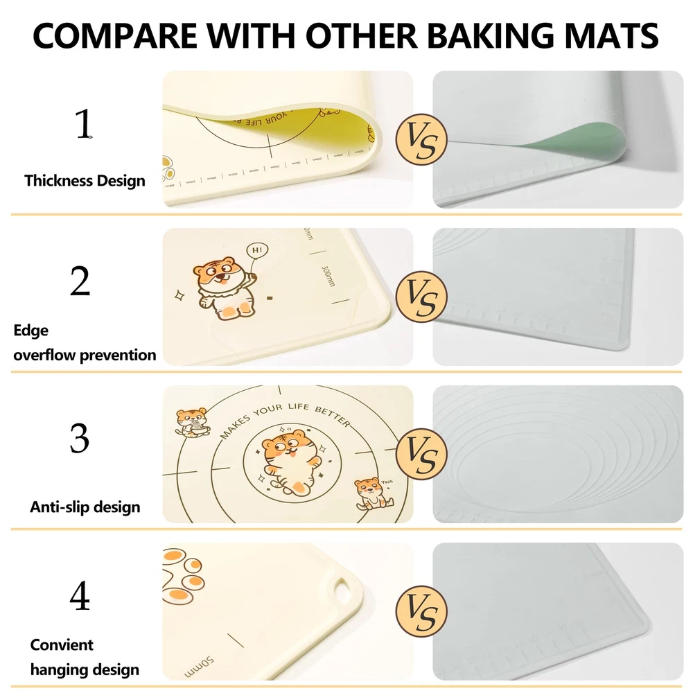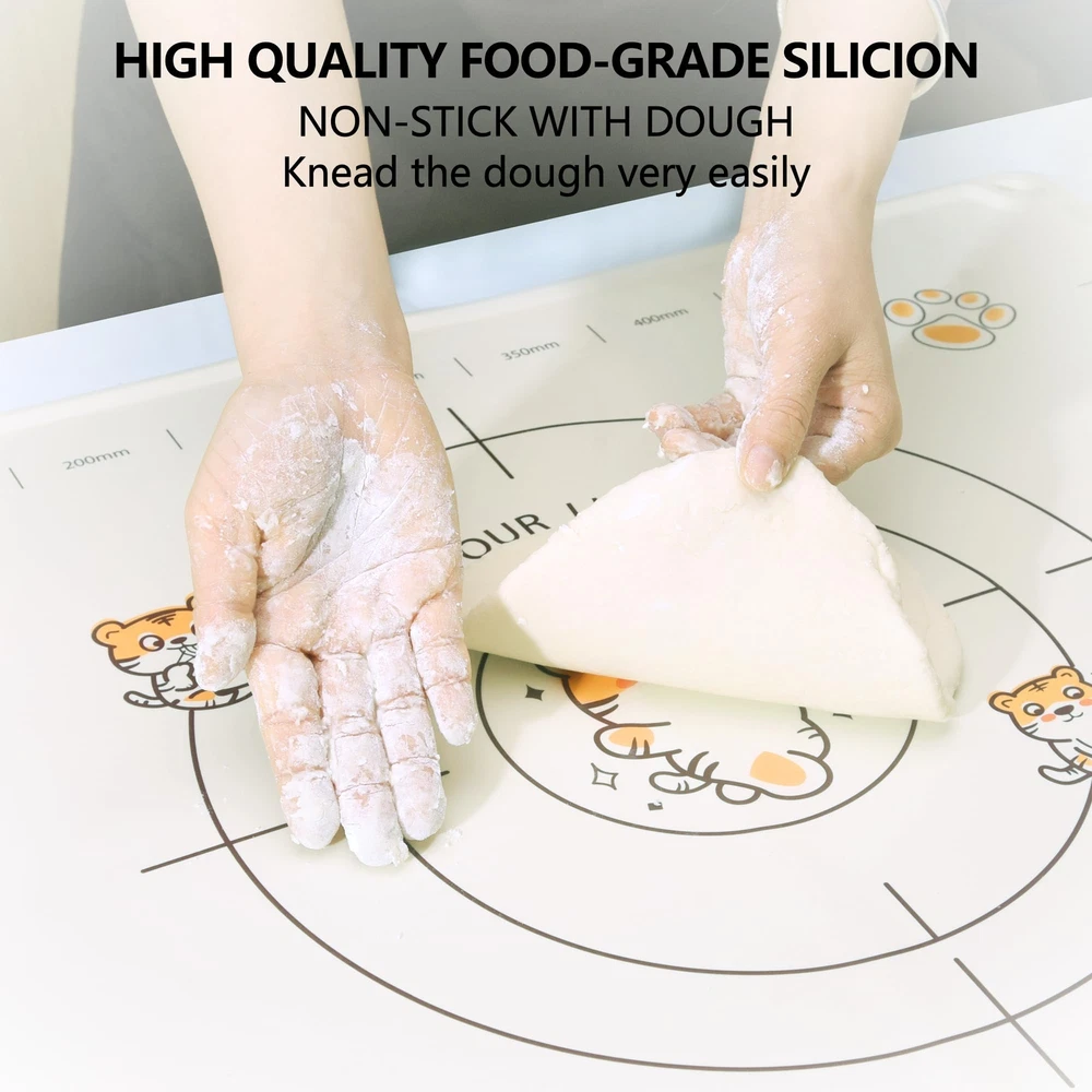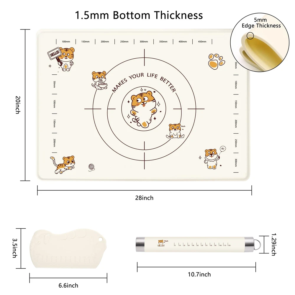 【Durable Safe Silicone Mats】The silicone baking mats is made of 100% food-grade silicone material, making it safe and healthy for use in the kitchen. The thickness of this silicone baking mat is 1.5mm, almost double that of other mats on the market, making it more durable and long-lasting. Its unique raised 5mm Edge Thickness design prevents water from spilling out when kneading dough, keeping your workspace clean and tidy. 【Non-Slip and Non-Stick】The silicone pastry mat is very soft and the smooth back adopts the design of electrostatic non-slip adsorption, which can be firmly adsorbed on a variety of countertop. Even if you knead the dough hard, it won't move at all. When you knead the dough, the silicone baking mats surface is very smooth, not sticking to anything, and you can easily knead the dough. 【Multi-Functional & Versatile】This baking mats silicone for baking sheets is perfect for preparing all kinds of baked goods, including pies, pizza, bread, biscuits, macarons, and more. It can also be placed on your table or countertop to protect them from scratches or hot pots. Additionally, the pastry mat can be used as a hot beverage coaster, preventing hot cups from damaging your table surface. 【Easy To Clean & Store】Simply wash the silicone mat with warm soapy water and wipe it clean with a soft cloth. It can also be cleaned in the dishwasher for added convenience. The dough mat can be rolled up or folded for easy storage and takes up minimal space in your drawers or cabinets. The side holes can be easily hung on the kitchen wall for drying. 【Perfect Size & Scale】This bread mat measures 28"*20" and has millimeter scales on its surface, making it easy for you to measure and cut dough. Its perfect size is suitable for your baking needs and adds fun to your baking process. (28*20" pastry board with hanging end rolling pin)