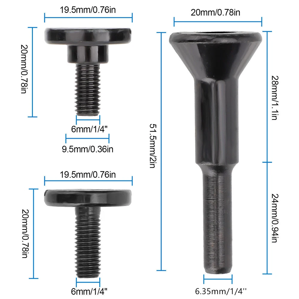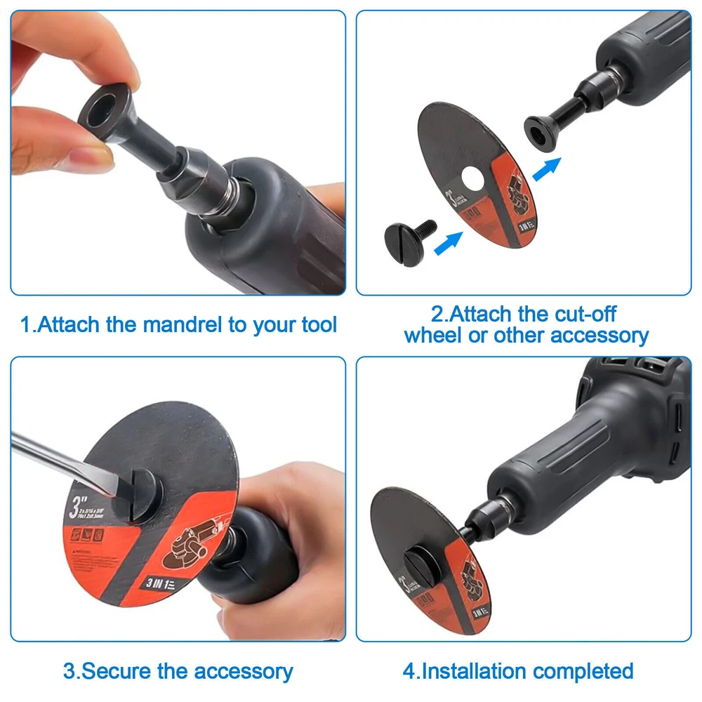 NEW-00023 2*Metal Cut Off Wheel Disc Mandrel Arbor 1/4" Shank Stem Die Grinder Drill PRODUCT DESCRIPTION Features: Material: Crafted from durable carbon steel with a black plated finish, the cut-off wheel arbor offers long-lasting performance and excellent rust resistance for extended use. Two Thread Heads: The die grinder's mounting mandrel features a handle with two different thread head types. It's designed for attaching small-diameter cut-off wheels or circular saw blades with 3/8-inch or 1/4-inch core holes, suitable for cutting discs from 0.035 to 0.16 inches thick. Versatile Application: This mandrel also supports various grinding wheels, including grinding, sanding, cleaning, descaling, polishing wheels, and hss saw blades, making it suitable for a wide range of tasks. Wide Compatibility: With a 1/4-inch (6.35mm) shank, it fits most die grinders and drill rotary tools. Easy to install and remove, making it an essential grinder accessory. Specifications: Type: Metal Cut Off Wheel Disc Mandrel Material: Carbon Steel Shank Diameter: 1/4” Package includes: 2 x Mounting Mandrel 4 x Screws Shipping Contact Us Our products have been sent to the US warehouse. All items will be shipped via WINIT CORPORATION. In 2-5 working days, you will receive your items. Thank you and have a nice day. If you have any question about us or items, please contact us, we will reply it as soon as possible. Shipping Our products have been sent to the US warehouse. All items will be shipped via WINIT CORPORATION. In 2-5 working days, you will receive your items. Thank you and have a nice day. Contact Us If you have any question about us or items, please contact us, we will reply it as soon as possible. PaymentShippingReturn policyAbout usContact us Copyright © - Tongtool All rights reserved | Design:Tongtool