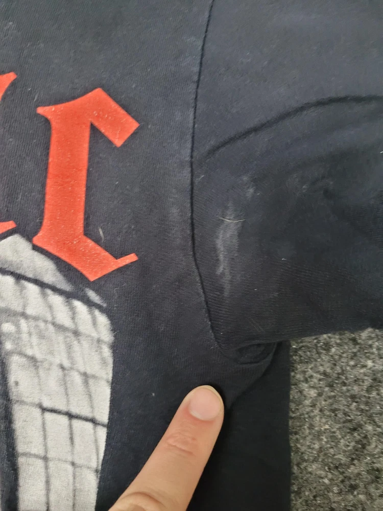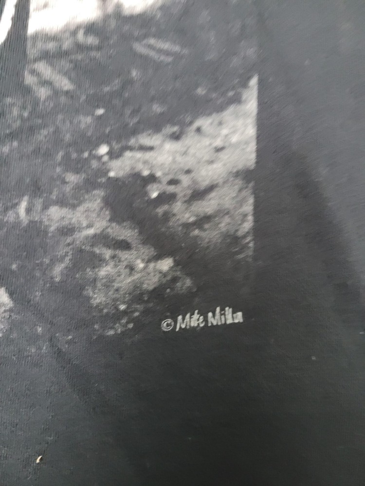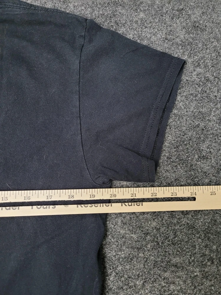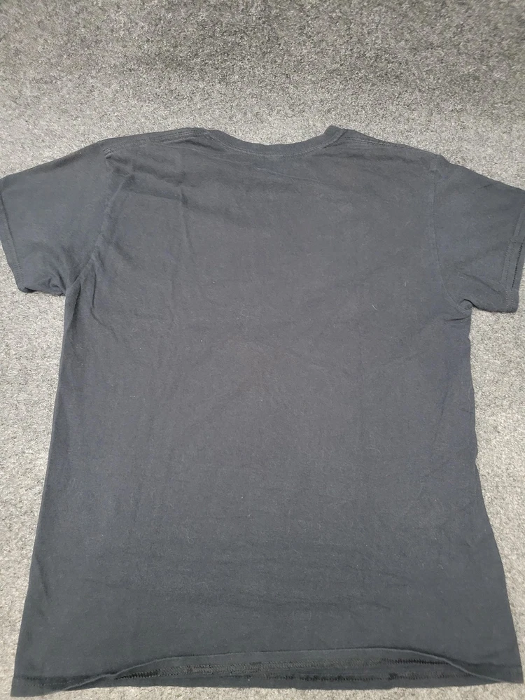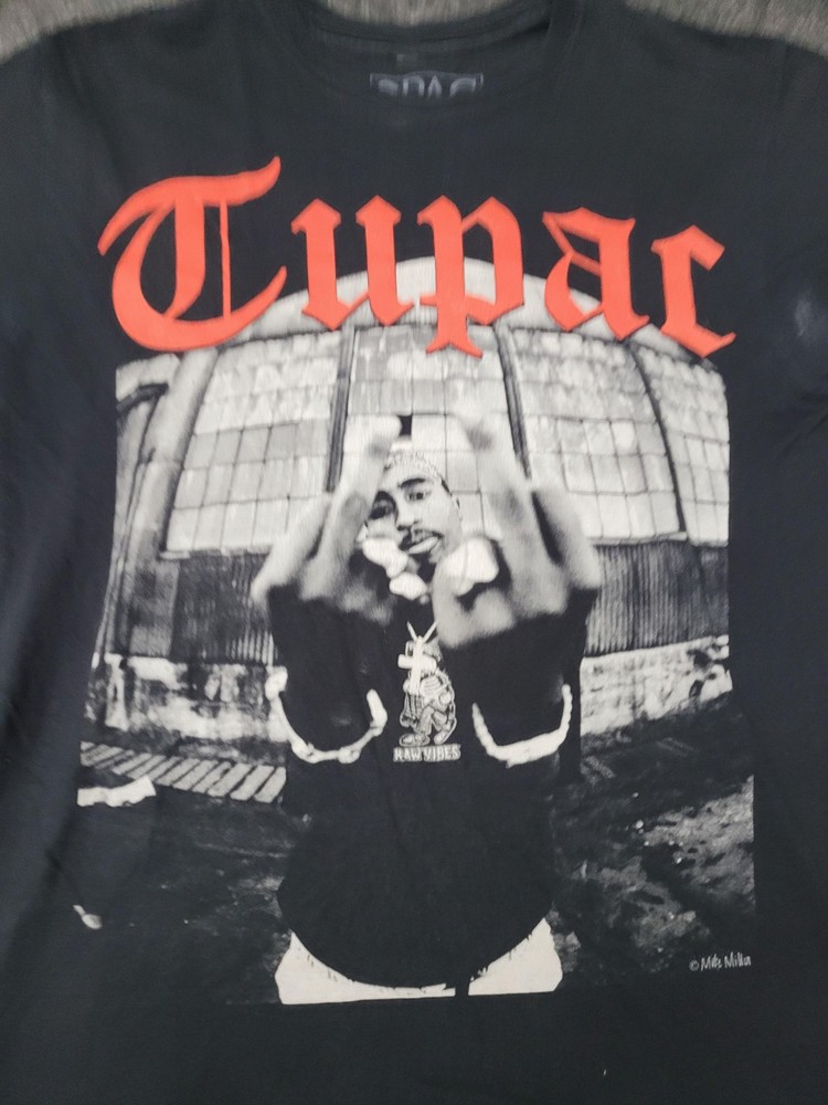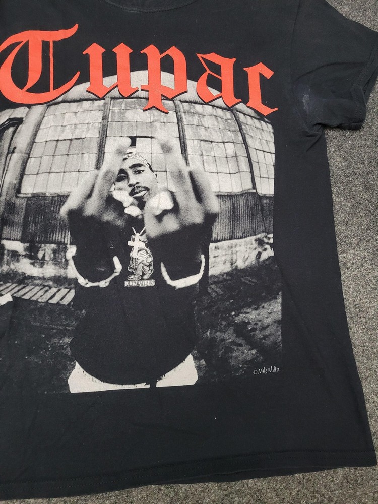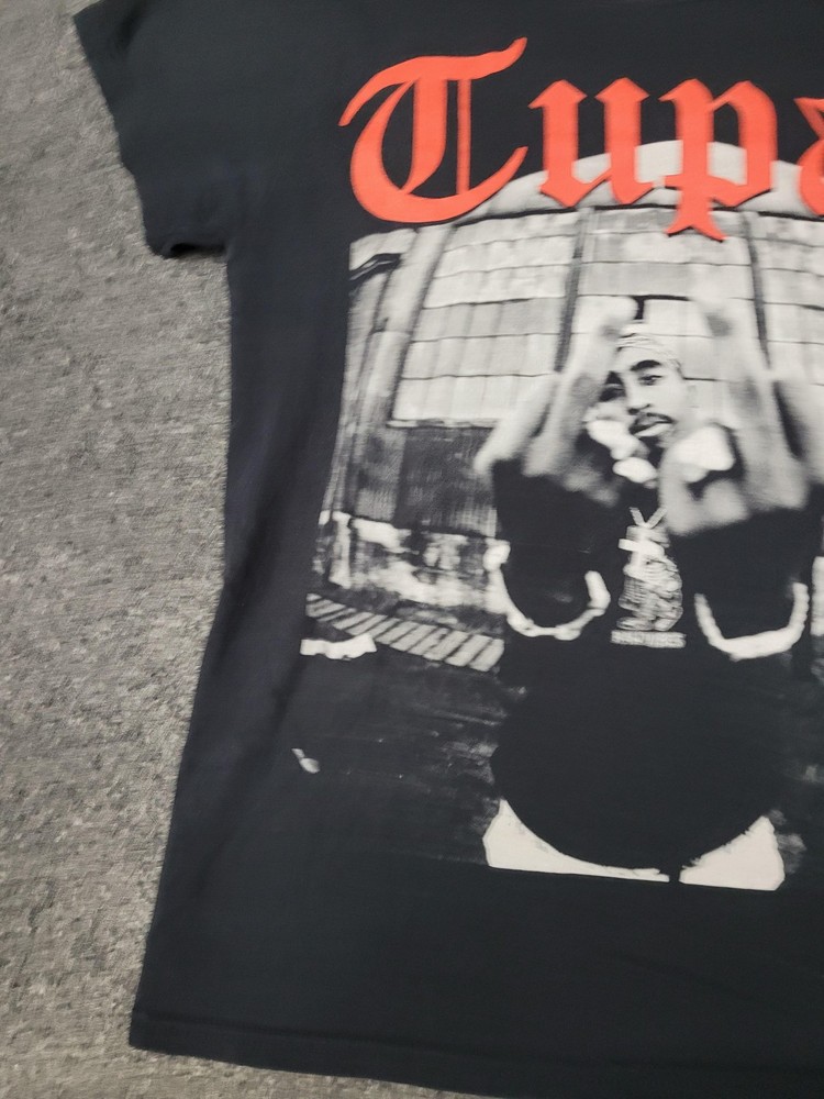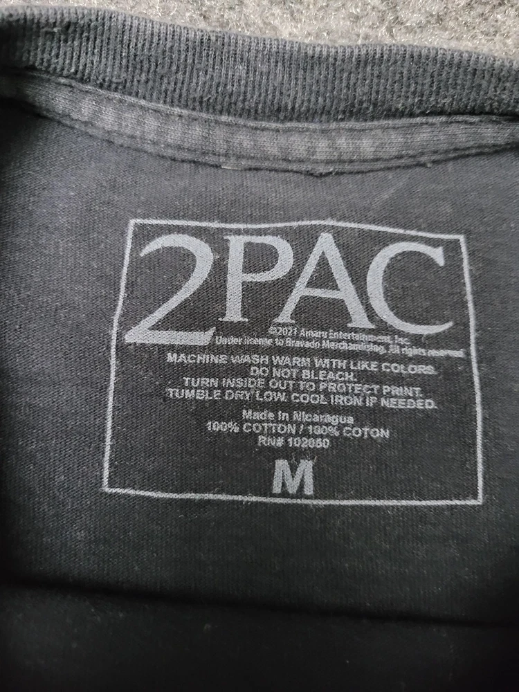 This listing is for a 2PAC Shirt Mens M Black Tupac Graphic Tee Tagless Cotton Crew Neck Music Hip Hop [Pre-owned - Good]: Pre-owned 2PAC Mens M black graphic T-shirt with printed neck label; fabric shows light overall wear and wash softness. Light surface piling and scattered lint are present, with faint white discoloration on the right sleeve/underarm area as shown in photos. Printed neck label intact; no holes, rips, or repairs; hems and seams are secure. Refer to pictures for condition. Message me if you have any questions.