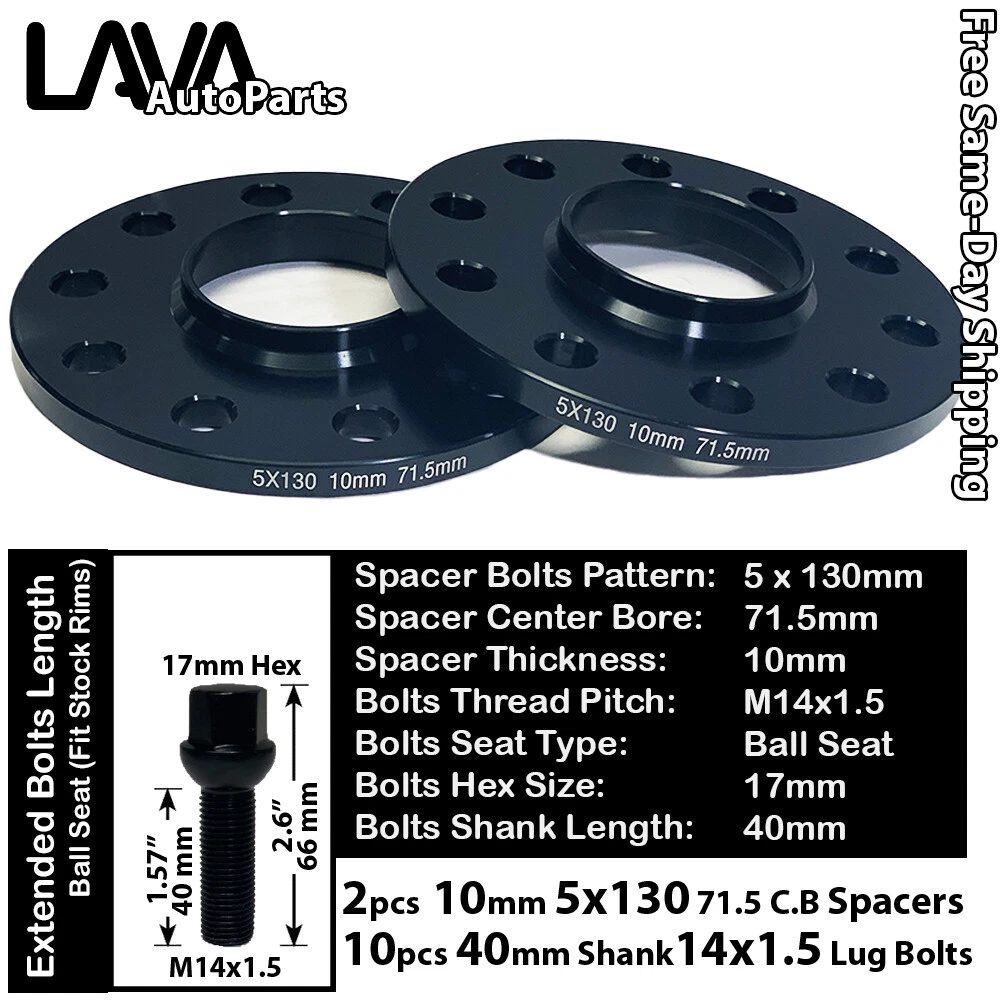 Product Specification: About Spacers Spacer Type: Hub Centric Spacer For Bolts Car Spacer Bolts Pattern: 5x130mm Spacer Center Bore: 71.5mm Spacer Thickness: 10mm Spacer Hub Ring: Yes Spacer Color: Black Spacer Material: Cold Forged 6061 T6 Grade Aluminum Quantity: 2 Pcs About Bolts Lug Type: Lug Bolts with Extended Shank Seat Type: Ball Seat Thread Pitch: M14x1.5 Hex size: 17mm Overall Height: 66mm or 2.6" Overall Diameter: 23mm or 0.9" Shank Length (From Bottom of the Seat to the end the thread shaft): 40mm or 1.57" Color: Black Material: Cold Forged Steel Quantity: 10 Pcs Requirements of the Vehicle Specification Required Vehicle Hub Bolt Pattern: 5x130mm Required Vehicle Hub Center Bore: 71.5mm Required Vehicle Hub Thread: M14x1.5 Required Vehicle Minimum Fender Gap: 10mm Requirements of the Wheel Specification Required Vehicle Wheel Bolt Pattern: 5x130mm Required Vehicle Wheel Center Bore: 71.5mm Required Vehicle Wheel Lug Seat Type: Ball Seat Required Vehicle Wheel Lug Nuts Hex: 17mm What You Will Receive: 2 pcs 10mm Hub Centric Spacers 10 pcs 17mm Hexed Black Ball Seat Lug Bolts Capability Chart and Important Part Note: Please Carefully Refer the Generation Code For Fitment, There may be multiple generations in the same year. Please Double Check For Fender Gap Limitation Make Model Year Range Part Notes Bolt Pattern Bolt Thread Special Notes Audi Q7 2007-2015 Stock Wheel Only 5x130mm 71.5 C.B. 14x1.5 Please Check Fender Gap Limitation Bentley Bentayga 2017-2021 Stock Wheel Only 5x130mm 71.5 C.B. 14x1.5 Please Check Fender Gap Limitation Bentley Continental 2019-2021 Stock Wheel Only 5x130mm 71.5 C.B. 14x1.5 Please Check Fender Gap Limitation Bentley Mulsanne 2011-2020 Stock Wheel Only 5x130mm 71.5 C.B. 14x1.5 Please Check Fender Gap Limitation Porsche 718 Boxster 2017-2021 Stock Wheel Only 5x130mm 71.5 C.B. 14x1.5 Please Check Fender Gap Limitation Porsche 718 Cayman 2017-2021 Stock Wheel Only 5x130mm 71.5 C.B. 14x1.5 Please Check Fender Gap Limitation Porsche 718 Spyder 2020-2021 Stock Wheel Only 5x130mm 71.5 C.B. 14x1.5 Please Check Fender Gap Limitation Porsche 911 1965-2021 Stock Wheel Only 5x130mm 71.5 C.B. 14x1.5 Please Check Fender Gap Limitation Porsche 912 1965-1976 Stock Wheel Only 5x130mm 71.5 C.B. 14x1.5 Please Check Fender Gap Limitation Porsche 914 1970-1976 Stock Wheel Only 5x130mm 71.5 C.B. 14x1.5 Please Check Fender Gap Limitation Porsche 918 Spyder 2015 Stock Wheel Only 5x130mm 71.5 C.B. 14x1.5 Please Check Fender Gap Limitation Porsche 924 1977-1988 Stock Wheel Only 5x130mm 71.5 C.B. 14x1.5 Please Check Fender Gap Limitation Porsche 928 1978-1995 Stock Wheel Only 5x130mm 71.5 C.B. 14x1.5 Please Check Fender Gap Limitation Porsche 930 1978-1979 Stock Wheel Only 5x130mm 71.5 C.B. 14x1.5 Please Check Fender Gap Limitation Porsche 944 1983-1991 Stock Wheel Only 5x130mm 71.5 C.B. 14x1.5 Please Check Fender Gap Limitation Porsche 968 1992-1995 Stock Wheel Only 5x130mm 71.5 C.B. 14x1.5 Please Check Fender Gap Limitation Porsche Boxster 1997-2016 Stock Wheel Only 5x130mm 71.5 C.B. 14x1.5 Please Check Fender Gap Limitation Porsche Cayenne 2003-2021 Stock Wheel Only 5x130mm 71.5 C.B. 14x1.5 Please Check Fender Gap Limitation Porsche Cayman 2006-2016 Stock Wheel Only 5x130mm 71.5 C.B. 14x1.5 Please Check Fender Gap Limitation Porsche Panamera 2010-2021 Stock Wheel Only 5x130mm 71.5 C.B. 14x1.5 Please Check Fender Gap Limitation Porsche Taycan 2020-2021 Stock Wheel Only 5x130mm 71.5 C.B. 14x1.5 Please Check Fender Gap Limitation Volkswagen Routan 2009-2014 Stock Wheel Only 5x130mm 71.5 C.B. 14x1.5 Please Check Fender Gap Limitation Volkswagen Touareg 2004-2018 Stock Wheel Only 5x130mm 71.5 C.B. 14x1.5 Please Check Fender Gap Limitation Important Notice 1. Please Contact Customer Service If You Ever Have Questions 2. Capability is Guaranteed if Your Vehicle is listed in the Capability Chart Above, Please carefully refer to the seat type requirement on the wheel. 3. Exceptions Have Been Marked Under Part Notes, Please Carefully Check Generation Code 4. Fender Gap is the most important measurement to check the maximum thickness you can use Notes: Buyer must check capability chart before buying, any vehicle that is not displayed in the capability may NOT fit. Please check if your rim uses proper lug nuts seat - product is only compatible with mentioned seat type required wheels Only guarantee compatible with Ball Seat Type Required Rim, If you have Aftermarket wheel, you may need Cone Seat Lug Bolts, Aftermarket wheels fitment is based on knowledge of buyer risk If your rim has wheel cap, this set might not be compatible with Wheel Cap Please have professional specialist to perform installation, adding spacers and related modification at your own risks Return Policy: Your happiness with the product is our top concern. We allow returns based on the following rules: Return is allowed within 30-day of Purchase Date; Return Product must be unused, intact, and with the original package; Buyer is responsible for return shipping; Please allow 3 business day after the delivery of your return for us to process the refund. Please notify customer service prior starting a return to avoid the 10% RMA Restocking Fee. Please use a specific return shipping address (not the ship-from address) to avoid the 30% Processing Fee. If you have any questions or concerns, please do not hesitate to let us know. Shipping: All shipments will be shipped via USPS Priority Mail (Same-Day); Order placed before 9:00 am PST will be shipped on the same day. Order placed after 9:00am will be shipped promptly the next business day. If you wish to cancel or modify order, please notify Customer Service before 8:00 am PST or we won't be able to change/cancel your order prior to shipping. We also provide local pickup service! Contact us for more information. Warranty: 30-Day Return Policy; For Colored Lug Nuts (Any color other than Chrome), we suggest the use of manual torque for installation to avoid damage to the pai