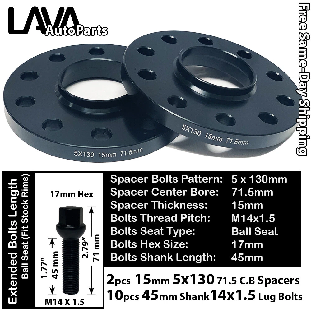 Product Specification: About Spacers Spacer Type: Hub Centric Spacer For Bolts Car Spacer Bolts Pattern: 5x130mm Spacer Center Bore: 71.5mm Spacer Thickness: 15mm Spacer Hub Ring: Yes Spacer Color: Black Spacer Material: Cold Forged 6061 T6 Grade Aluminum Quantity: 2 Pcs About Bolts Lug Type: Lug Bolts with Extended Shank Seat Type: Ball Seat Thread Pitch: M14x1.5 Hex size: 17mm Overall Height: 71mm or 2.79" Overall Diameter: 23mm or 0.9" Shank Length (From Bottom of the Seat to the end the thread shaft): 45mm or 1.77" Color: Black Material: Cold Forged Steel Quantity: 10 Pcs Requirements of the Vehicle Specification Required Vehicle Hub Bolt Pattern: 5x130mm Required Vehicle Hub Center Bore: 71.5mm Required Vehicle Hub Thread: M14x1.5 Required Vehicle Minimum Fender Gap: 15mm Requirements of the Wheel Specification Required Vehicle Wheel Bolt Pattern: 5x130mm Required Vehicle Wheel Center Bore: 71.5mm Required Vehicle Wheel Lug Seat Type: Ball Seat Required Vehicle Wheel Lug Nuts Hex: 17mm What You Will Receive: 2 pcs 15mm Hub Centric Spacers 10 pcs 17mm Hexed Black Ball Seat Lug Bolts Capability Chart and Important Part Note: Please Carefully Refer the Generation Code For Fitment, There may be multiple generations in the same year. Please Double Check For Fender Gap Limitation Make Model Year Range Part Notes Bolt Pattern Bolt Thread Special Notes Audi Q7 2007-2015 Stock Wheel Only 5x130mm 71.5 C.B. 14x1.5 Please Check Fender Gap Limitation Bentley Bentayga 2017-2021 Stock Wheel Only 5x130mm 71.5 C.B. 14x1.5 Please Check Fender Gap Limitation Bentley Continental 2019-2021 Stock Wheel Only 5x130mm 71.5 C.B. 14x1.5 Please Check Fender Gap Limitation Bentley Mulsanne 2011-2020 Stock Wheel Only 5x130mm 71.5 C.B. 14x1.5 Please Check Fender Gap Limitation Porsche 718 Boxster 2017-2021 Stock Wheel Only 5x130mm 71.5 C.B. 14x1.5 Please Check Fender Gap Limitation Porsche 718 Cayman 2017-2021 Stock Wheel Only 5x130mm 71.5 C.B. 14x1.5 Please Check Fender Gap Limitation Porsche 718 Spyder 2020-2021 Stock Wheel Only 5x130mm 71.5 C.B. 14x1.5 Please Check Fender Gap Limitation Porsche 911 1965-2021 Stock Wheel Only 5x130mm 71.5 C.B. 14x1.5 Please Check Fender Gap Limitation Porsche 912 1965-1976 Stock Wheel Only 5x130mm 71.5 C.B. 14x1.5 Please Check Fender Gap Limitation Porsche 914 1970-1976 Stock Wheel Only 5x130mm 71.5 C.B. 14x1.5 Please Check Fender Gap Limitation Porsche 918 Spyder 2015 Stock Wheel Only 5x130mm 71.5 C.B. 14x1.5 Please Check Fender Gap Limitation Porsche 924 1977-1988 Stock Wheel Only 5x130mm 71.5 C.B. 14x1.5 Please Check Fender Gap Limitation Porsche 928 1978-1995 Stock Wheel Only 5x130mm 71.5 C.B. 14x1.5 Please Check Fender Gap Limitation Porsche 930 1978-1979 Stock Wheel Only 5x130mm 71.5 C.B. 14x1.5 Please Check Fender Gap Limitation Porsche 944 1983-1991 Stock Wheel Only 5x130mm 71.5 C.B. 14x1.5 Please Check Fender Gap Limitation Porsche 968 1992-1995 Stock Wheel Only 5x130mm 71.5 C.B. 14x1.5 Please Check Fender Gap Limitation Porsche Boxster 1997-2016 Stock Wheel Only 5x130mm 71.5 C.B. 14x1.5 Please Check Fender Gap Limitation Porsche Cayenne 2003-2021 Stock Wheel Only 5x130mm 71.5 C.B. 14x1.5 Please Check Fender Gap Limitation Porsche Cayman 2006-2016 Stock Wheel Only 5x130mm 71.5 C.B. 14x1.5 Please Check Fender Gap Limitation Porsche Panamera 2010-2021 Stock Wheel Only 5x130mm 71.5 C.B. 14x1.5 Please Check Fender Gap Limitation Porsche Taycan 2020-2021 Stock Wheel Only 5x130mm 71.5 C.B. 14x1.5 Please Check Fender Gap Limitation Volkswagen Routan 2009-2014 Stock Wheel Only 5x130mm 71.5 C.B. 14x1.5 Please Check Fender Gap Limitation Volkswagen Touareg 2004-2018 Stock Wheel Only 5x130mm 71.5 C.B. 14x1.5 Please Check Fender Gap Limitation Important Notice 1. Please Contact Customer Service If You Ever Have Questions 2. Capability is Guaranteed if Your Vehicle is listed in the Capability Chart Above, Please carefully refer to the seat type requirement on the wheel. 3. Exceptions Have Been Marked Under Part Notes, Please Carefully Check Generation Code 4. Fender Gap is the most important measurement to check the maximum thickness you can use Notes: Buyer must check capability chart before buying, any vehicle that is not displayed in the capability may NOT fit. Please check if your rim uses proper lug nuts seat - product is only compatible with mentioned seat type required wheels Only guarantee compatible with Ball Seat Type Required Rim, If you have Aftermarket wheel, you may need Cone Seat Lug Bolts, Aftermarket wheels fitment is based on knowledge of buyer risk If your rim has wheel cap, this set might not be compatible with Wheel Cap Please have professional specialist to perform installation, adding spacers and related modification at your own risks Return Policy: Your happiness with the product is our top concern. We allow returns based on the following rules: Return is allowed within 30-day of Purchase Date; Return Product must be unused, intact, and with the original package; Buyer is responsible for return shipping; Please allow 3 business day after the delivery of your return for us to process the refund. Please notify customer service prior starting a return to avoid the 10% RMA Restocking Fee. Please use a specific return shipping address (not the ship-from address) to avoid the 30% Processing Fee. If you have any questions or concerns, please do not hesitate to let us know. Shipping: All shipments will be shipped via USPS Priority Mail (Same-Day); Order placed before 9:00 am PST will be shipped on the same day. Order placed after 9:00am will be shipped promptly the next business day. If you wish to cancel or modify order, please notify Customer Service before 8:00 am PST or we won't be able to change/cancel your order prior to shipping. We also provide local pickup service! Contact us for more information. Warranty: 30-Day Return Policy; For Colored Lug Nuts (Any color other than Chrome), we suggest the use of manual torque for installation to avoid damage to the pa